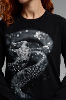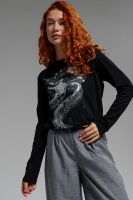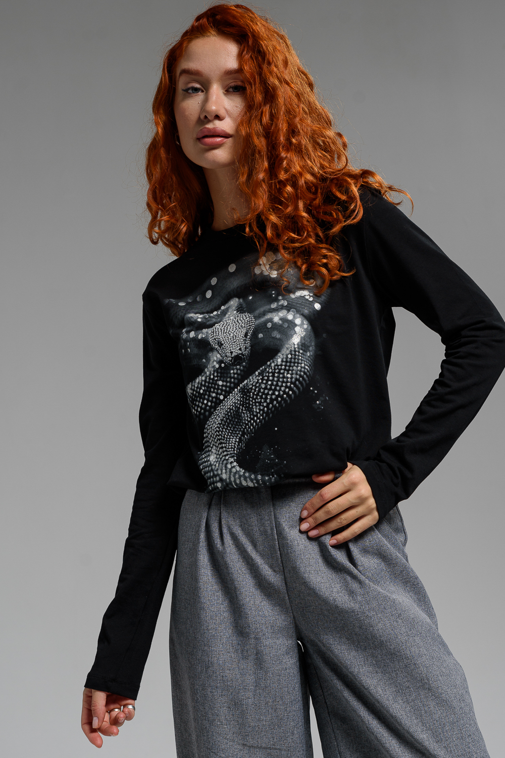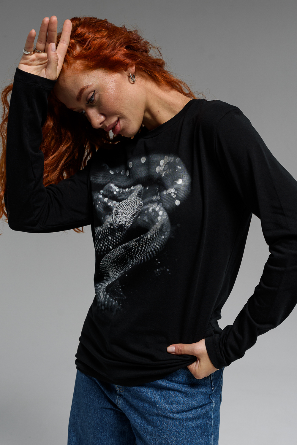 Лонгслив снова в моде и прочно обосновался в базовом гардеробе современного человека. Удобная трикотажная кофта представляет собой футболку с длинным рукавом, которую можно использовать как самостоятельный элемент, так и носить под пиджак, толстовку или рубашку. Лонгслив выполнен из высокоплотного хлопкового трикотажа и является невероятно комфортным и удобным. Футболка с длинными рукавами имеет прямой базовый крой и классическую линию плеча. Лонгслив - это неформальный стиль, когда на футболку можно надеть клетчатую рубашку и сочетать с кедами и джинсами. За счет натуральной ткани лонгслив можно носить в качестве домашней одежды или нательного белья, одежды для сна, тренировочной спортивной одежды и военной экипировки. Если вы хотите силуэт "оверсайз" нужно взять на размер или два больше, ориентируйтесь по таблице замеров. На принте "черный+Змея стразы" страз нет. Выполнен слой глиттером - мелкими, рассыпчатыми и переливающимися блестками, очень яркие и блестящие.