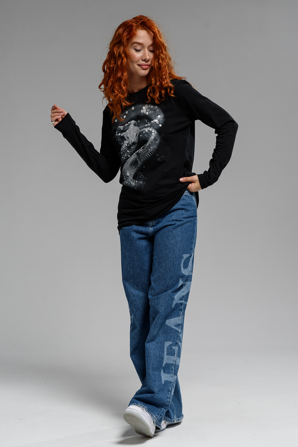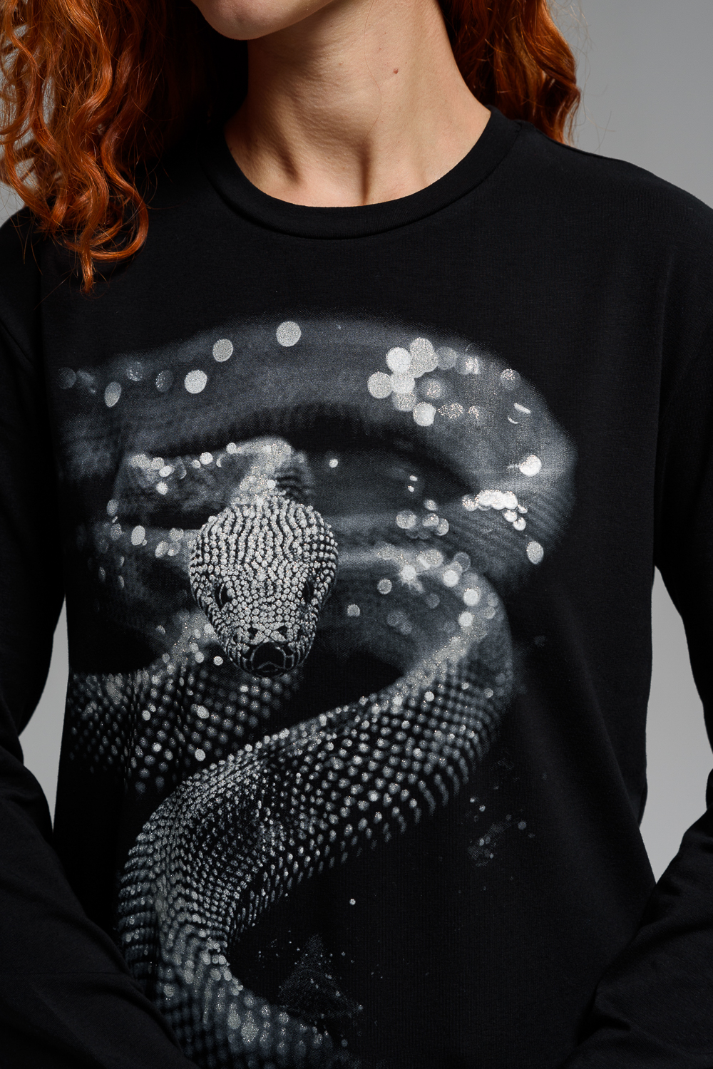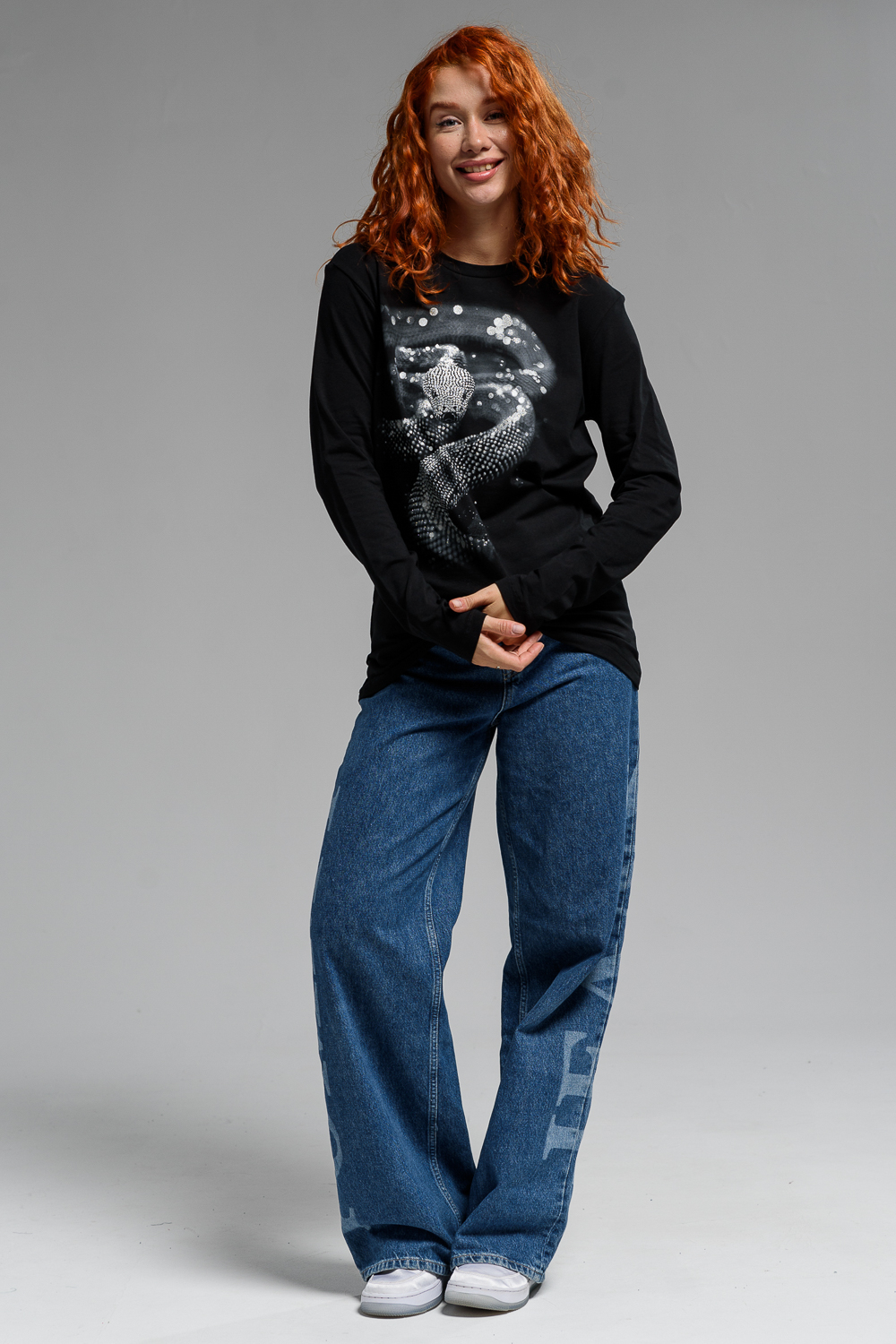 Лонгслив снова в моде и прочно обосновался в базовом гардеробе современного человека. Удобная трикотажная кофта представляет собой футболку с длинным рукавом, которую можно использовать как самостоятельный элемент, так и носить под пиджак, толстовку или рубашку. Лонгслив выполнен из высокоплотного хлопкового трикотажа и является невероятно комфортным и удобным. Футболка с длинными рукавами имеет прямой базовый крой и классическую линию плеча. Лонгслив - это неформальный стиль, когда на футболку можно надеть клетчатую рубашку и сочетать с кедами и джинсами. За счет натуральной ткани лонгслив можно носить в качестве домашней одежды или нательного белья, одежды для сна, тренировочной спортивной одежды и военной экипировки. Если вы хотите силуэт "оверсайз" нужно взять на размер или два больше, ориентируйтесь по таблице замеров. На принте "черный+Змея стразы" страз нет. Выполнен слой глиттером - мелкими, рассыпчатыми и переливающимися блестками, очень яркие и блестящие.