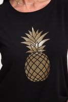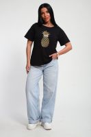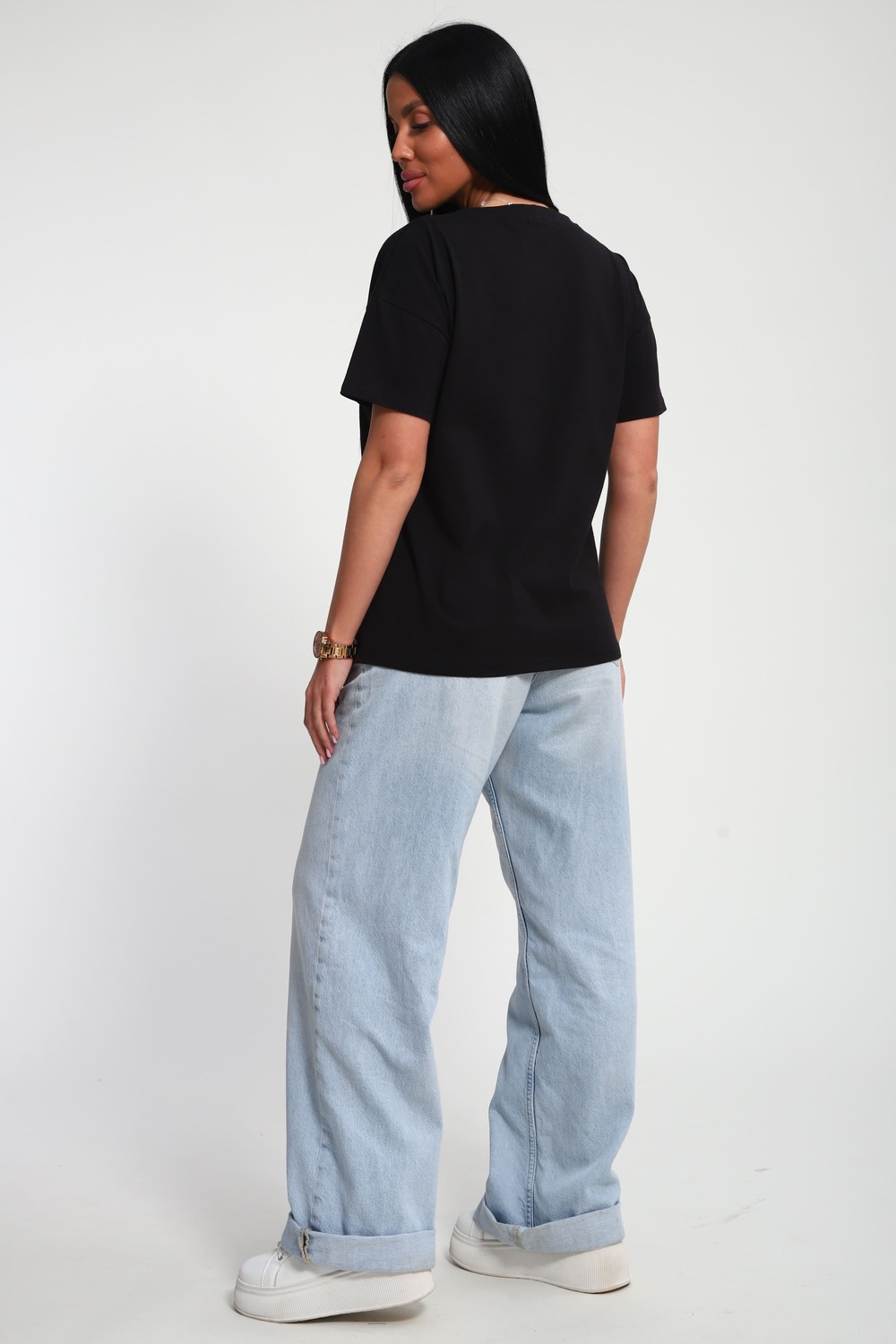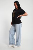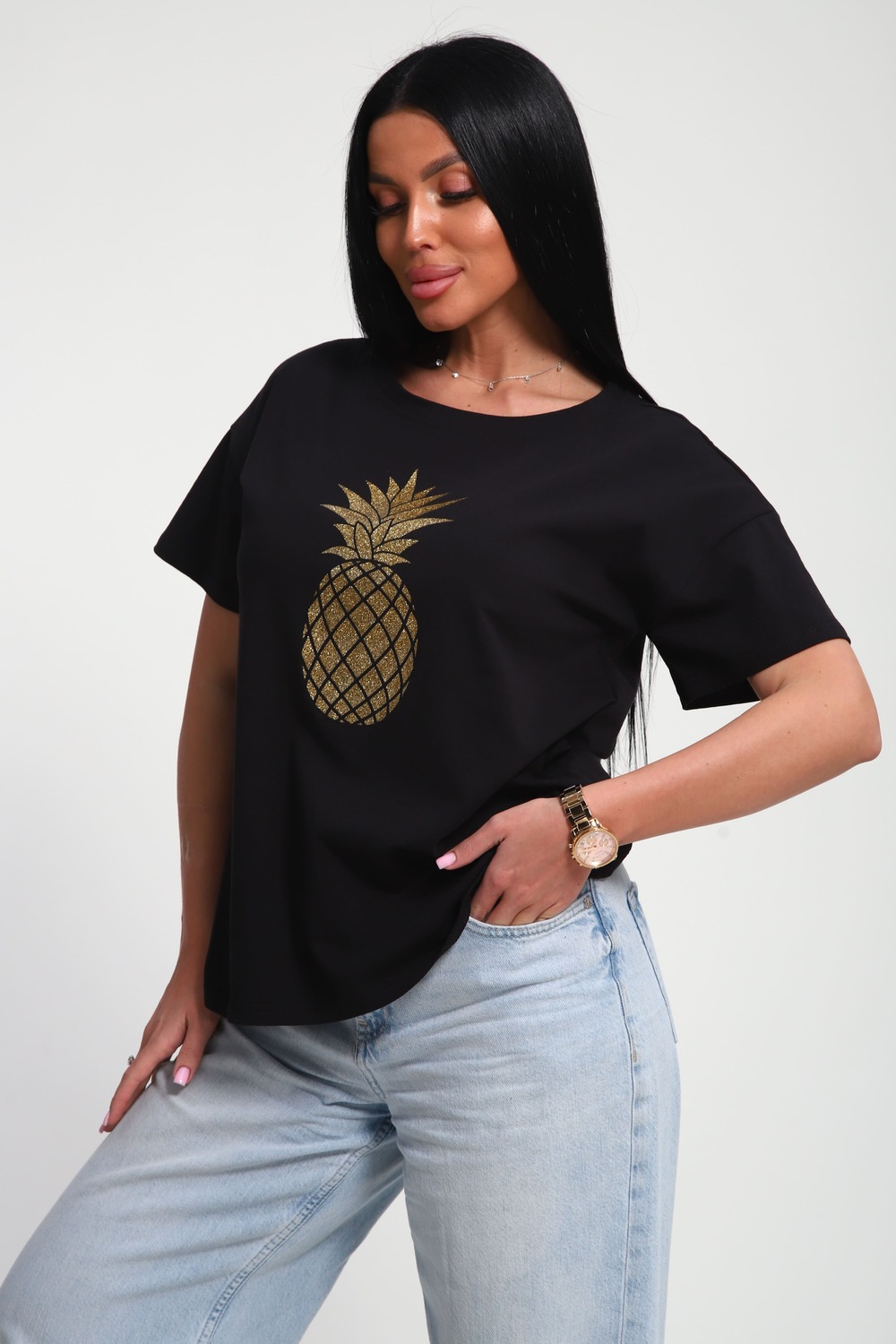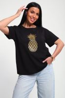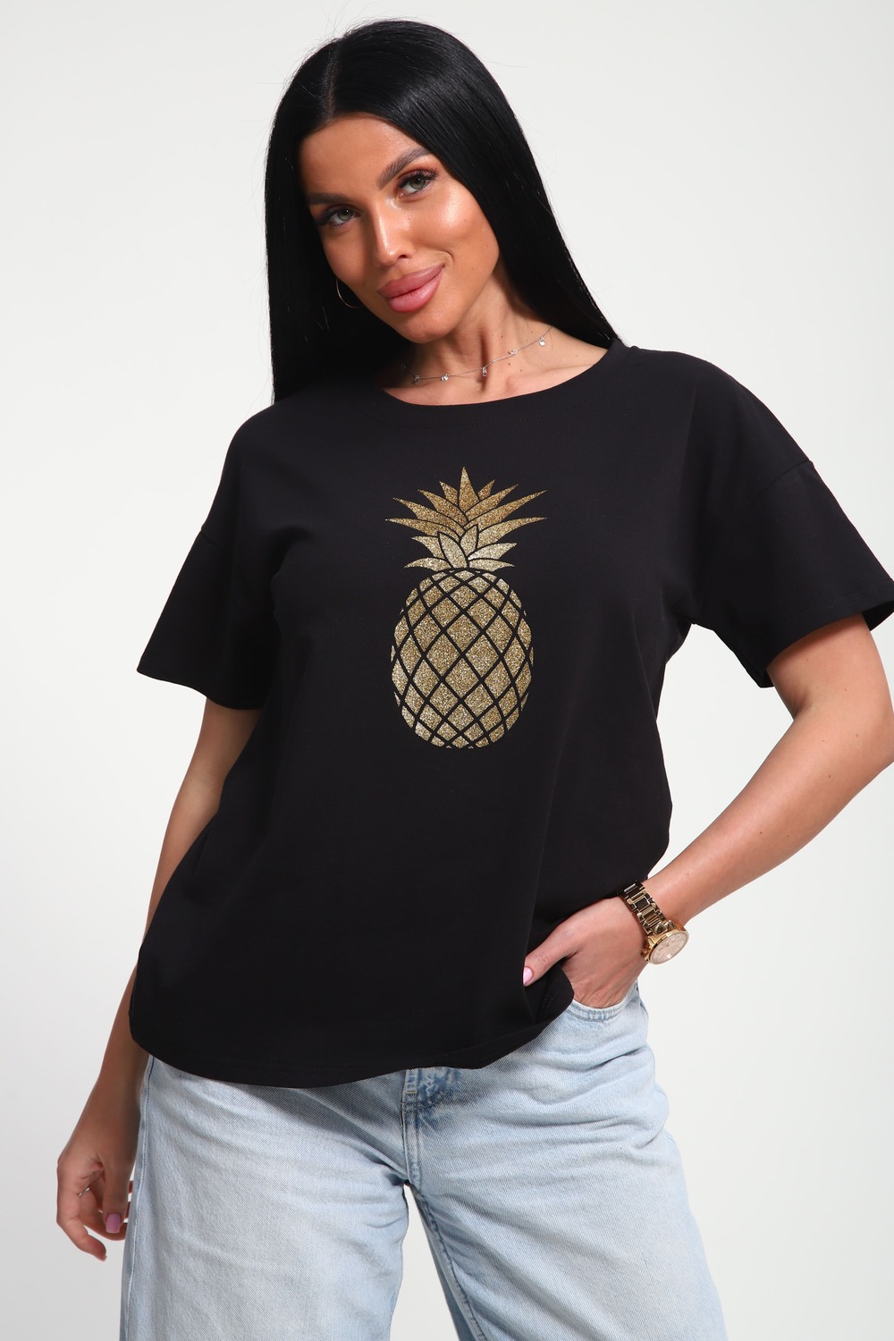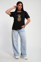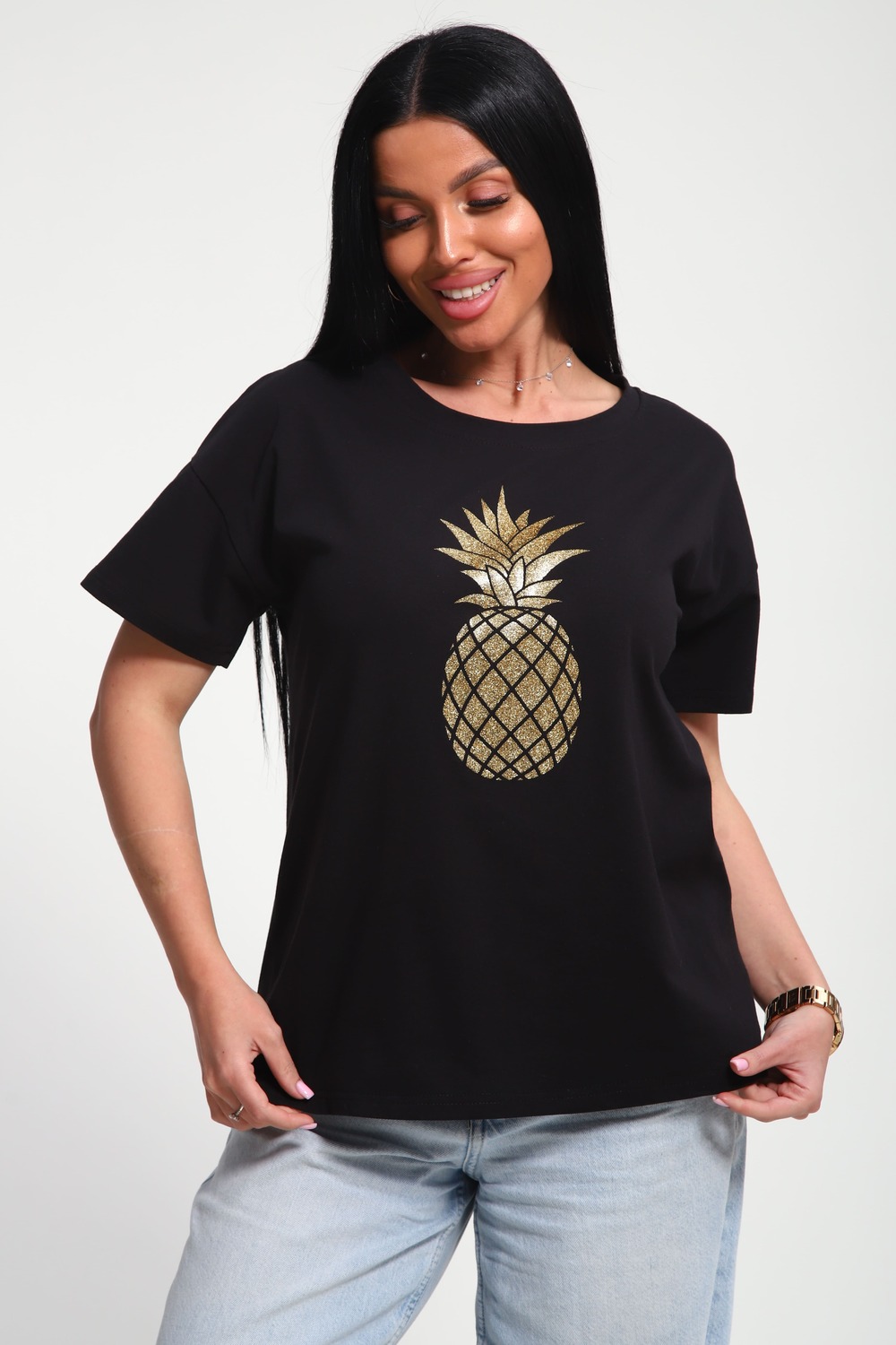 Футболка женская из гладкокрашенного трикотажа, хлопок 100%. Прямого силуэта, свободного облегания. горловина круглой формы. Рукав короткий. Низ изделия прямой. На полочке блестящий принт, шелкография.
