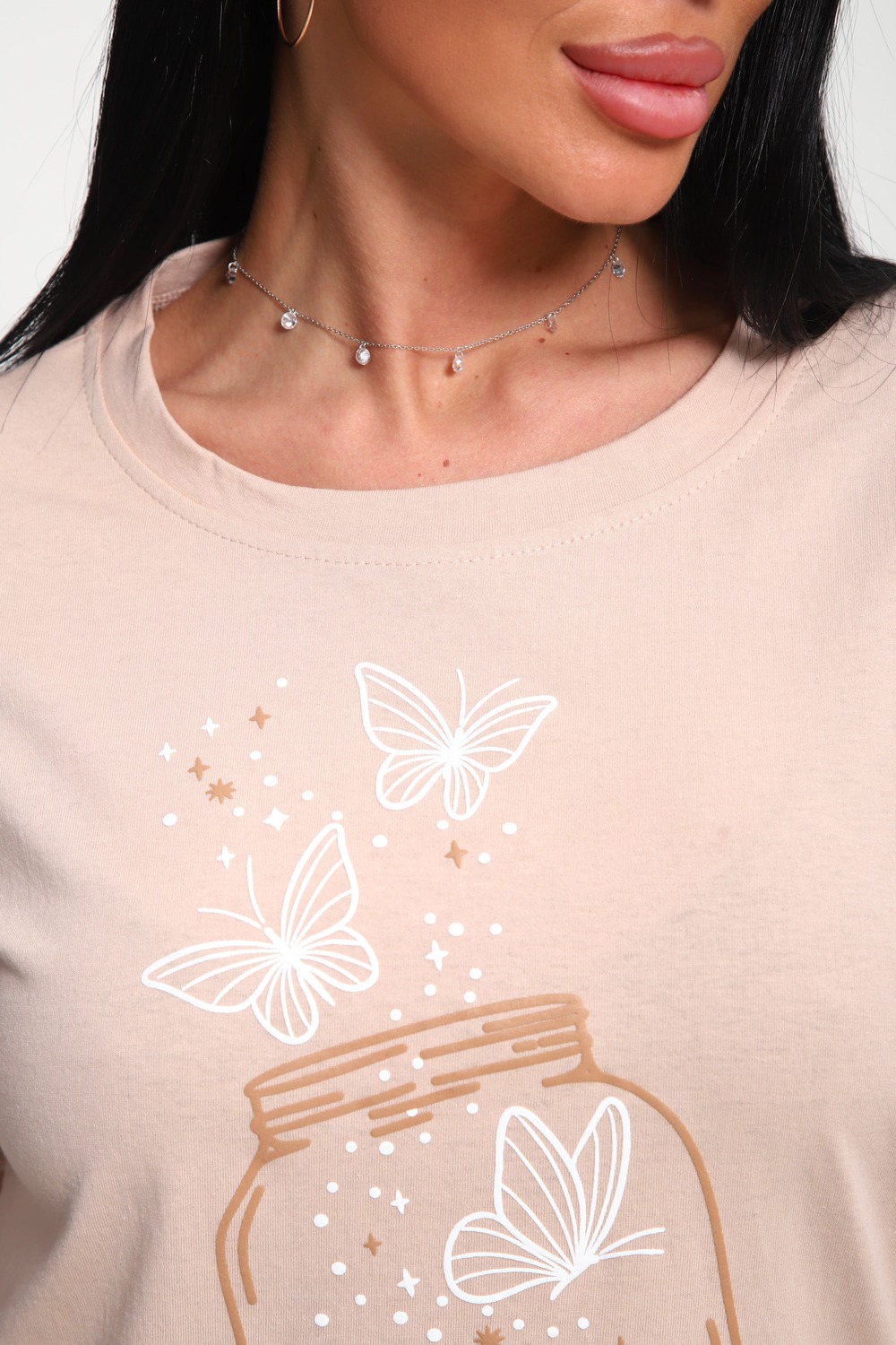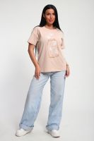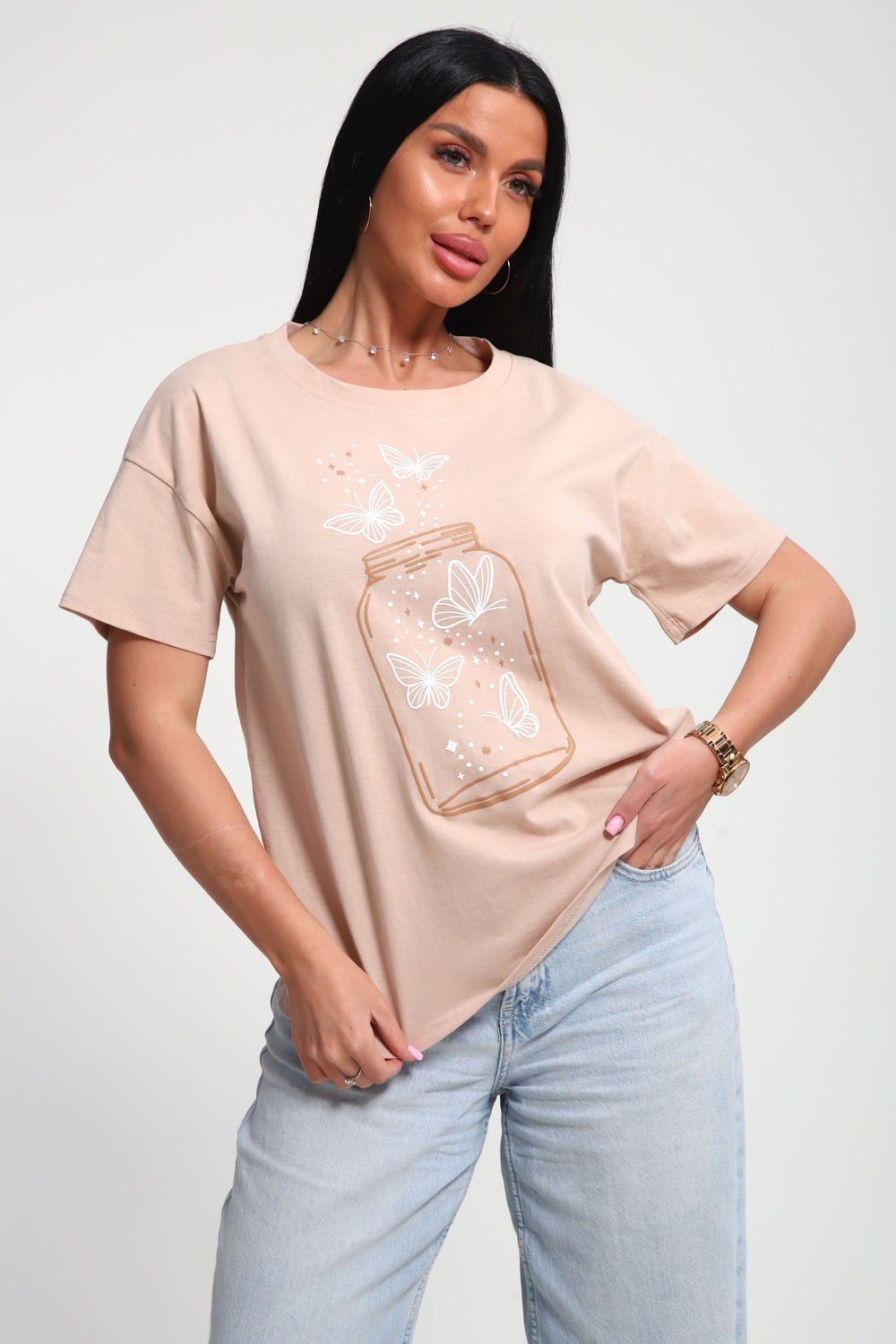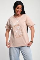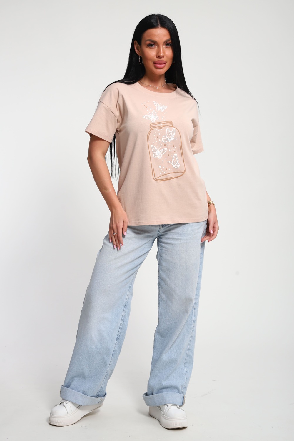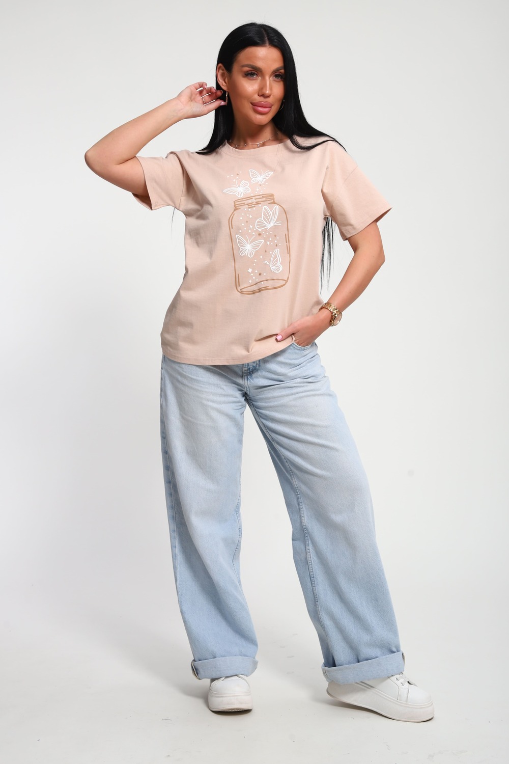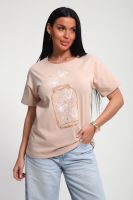 Футболка женская из гладкокрашенного трикотажа, хлопок 100%. Прямого силуэта, свободного облегания. горловина круглой формы. Рукав короткий. Низ изделия прямой. На полочке объемный принт, шелкография.