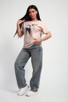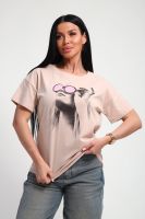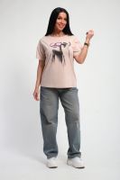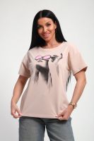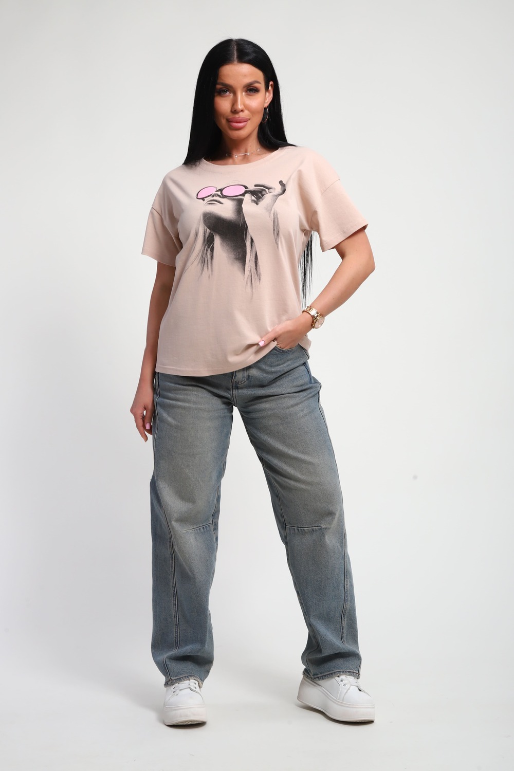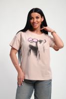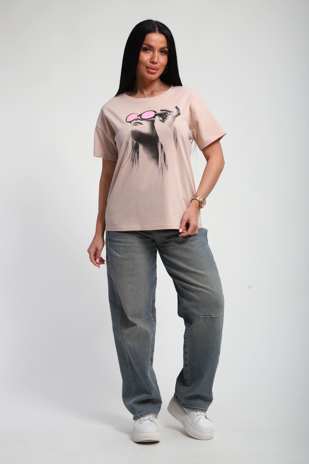 Футболка женская из гладкокрашенного трикотажа, хлопок 100%. Прямого силуэта, свободного облегания. горловина круглой формы. Рукав короткий. Низ изделия прямой. На полочке объемный принт, шелкография.