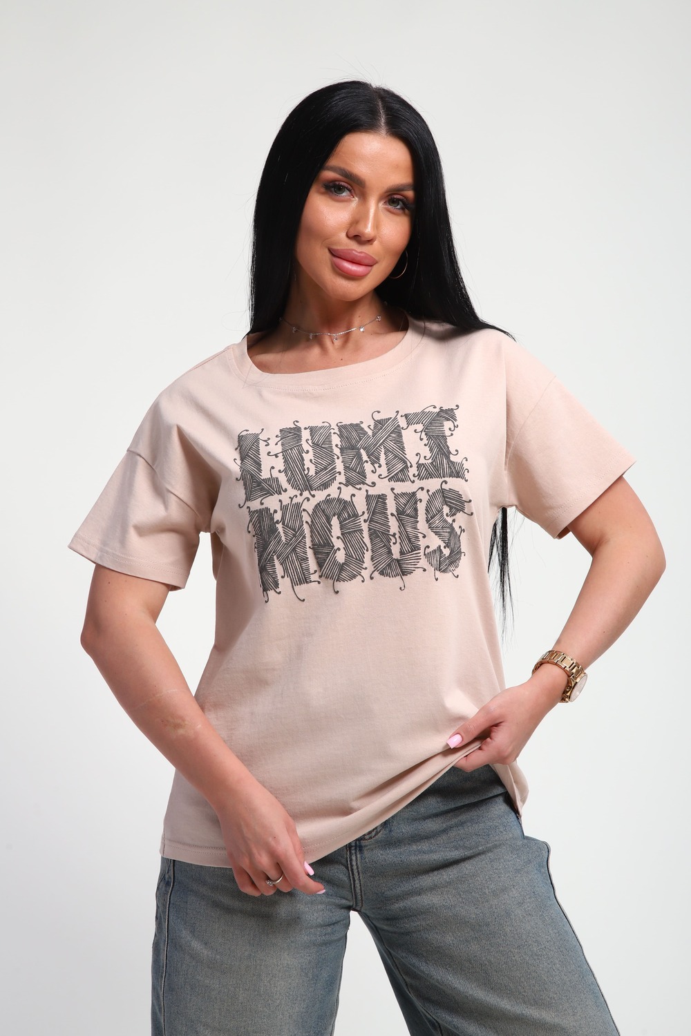 Футболка женская из гладкокрашенного трикотажа, хлопок 100%. Прямого силуэта, свободного облегания. горловина круглой формы. Рукав короткий. Низ изделия прямой. На полочке объемный принт, шелкография.