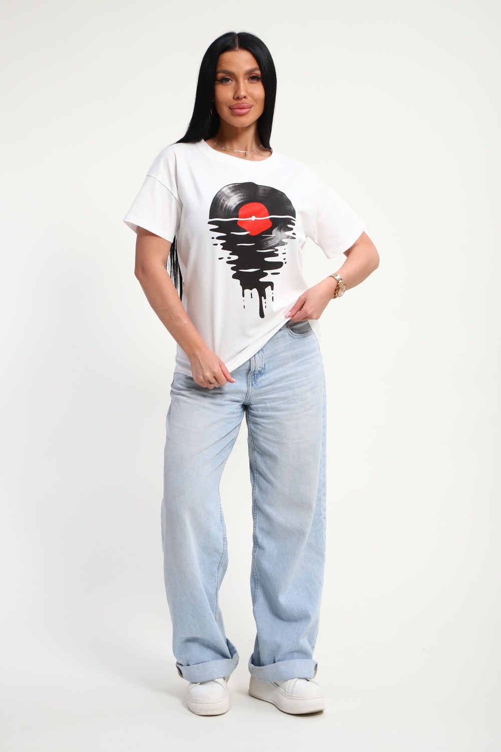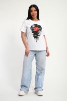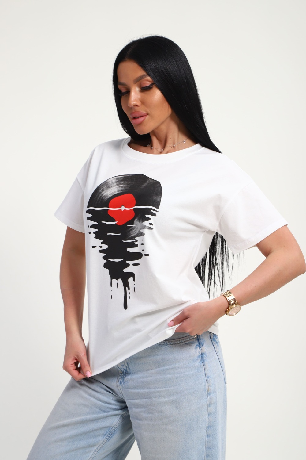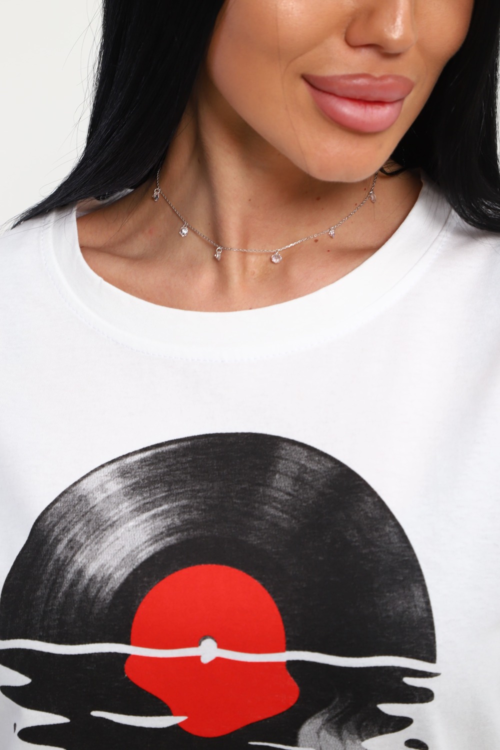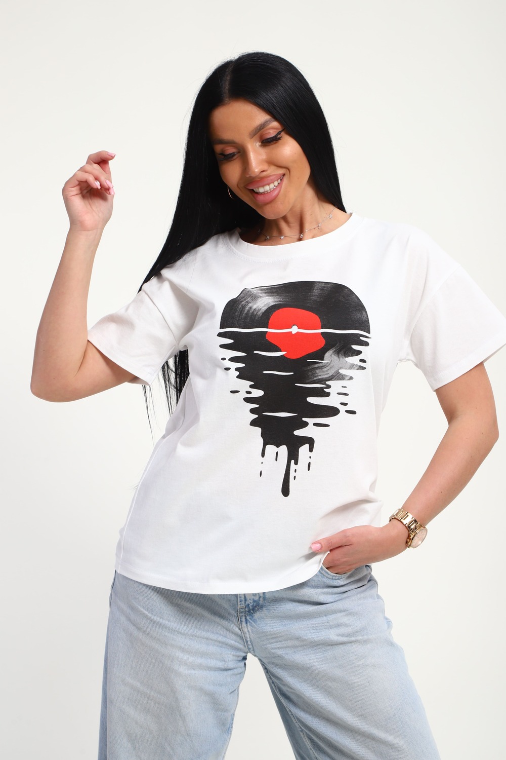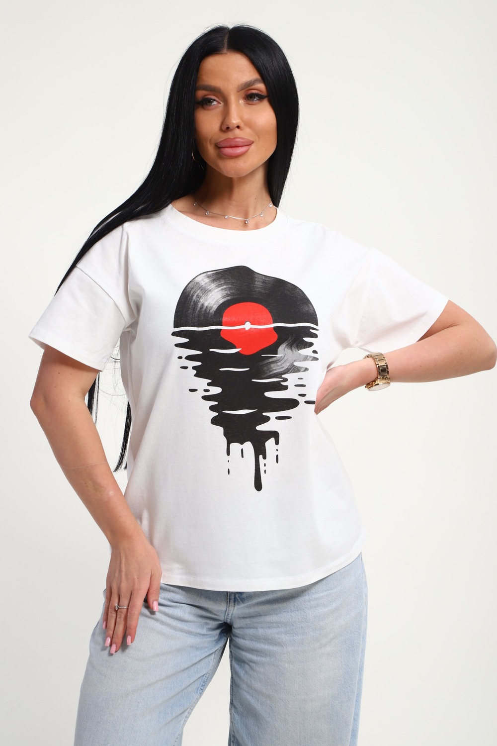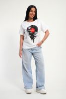 Футболка женская из гладкокрашенного трикотажа, хлопок 100%. Прямого силуэта, свободного облегания. горловина круглой формы. Рукав короткий. Низ изделия прямой. На полочке принт, шелкография.