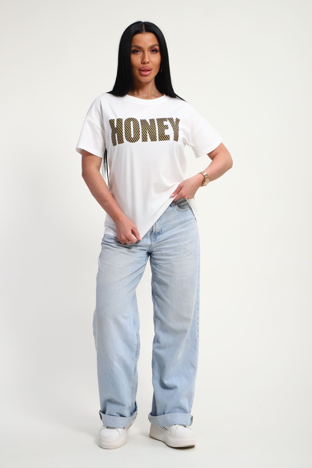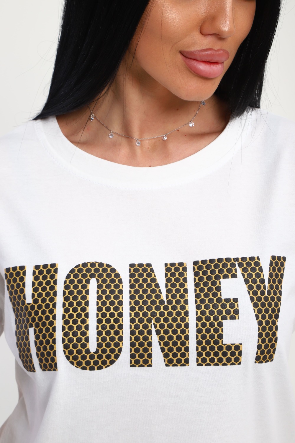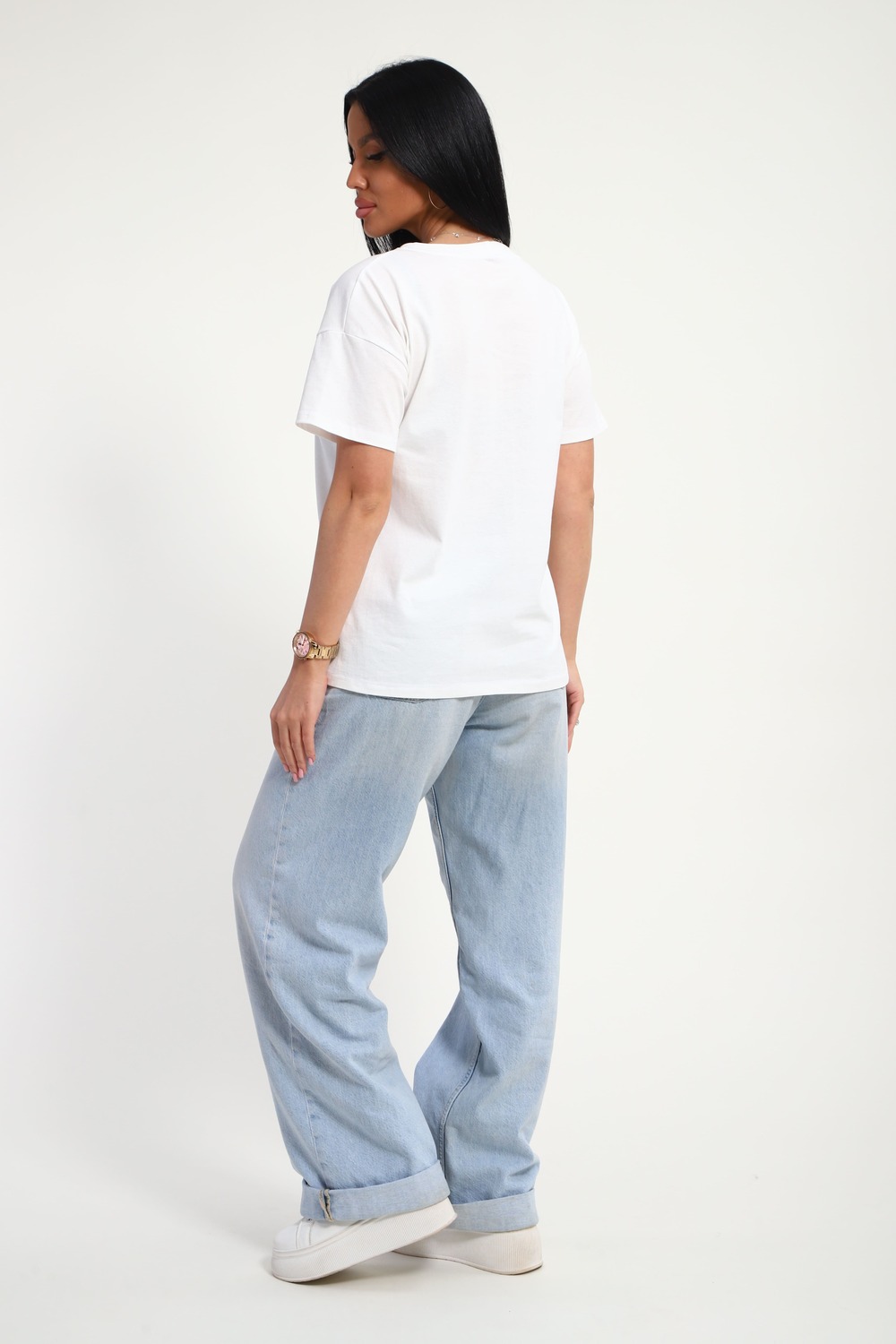 Футболка женская из гладкокрашенного трикотажа, хлопок 100%. Прямого силуэта, свободного облегания. горловина круглой формы. Рукав короткий. Низ изделия прямой. На полочке объемный принт, шелкография.