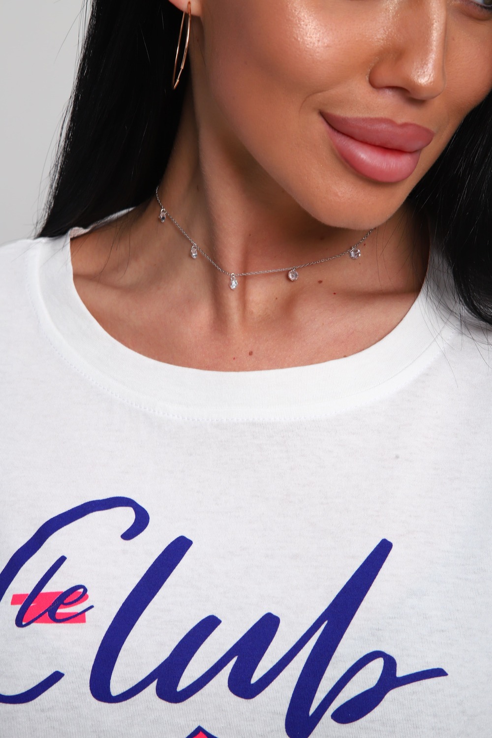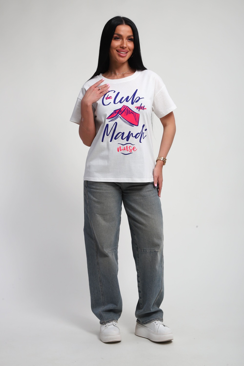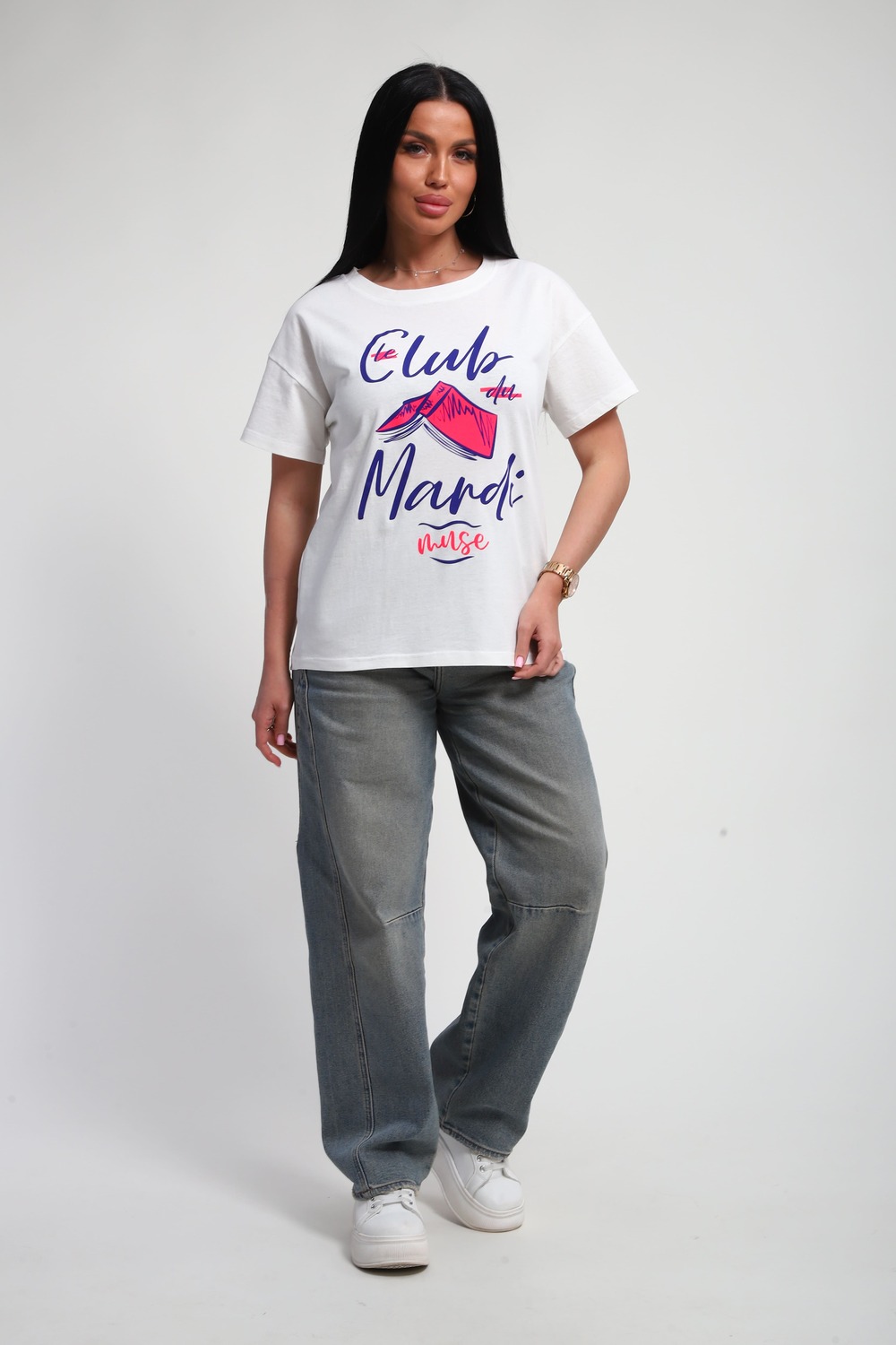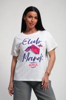 Футболка женская из гладкокрашенного трикотажа, хлопок 100%. Прямого силуэта, свободного облегания. горловина круглой формы. Рукав короткий. Низ изделия прямой. На полочке принт, шелкография.