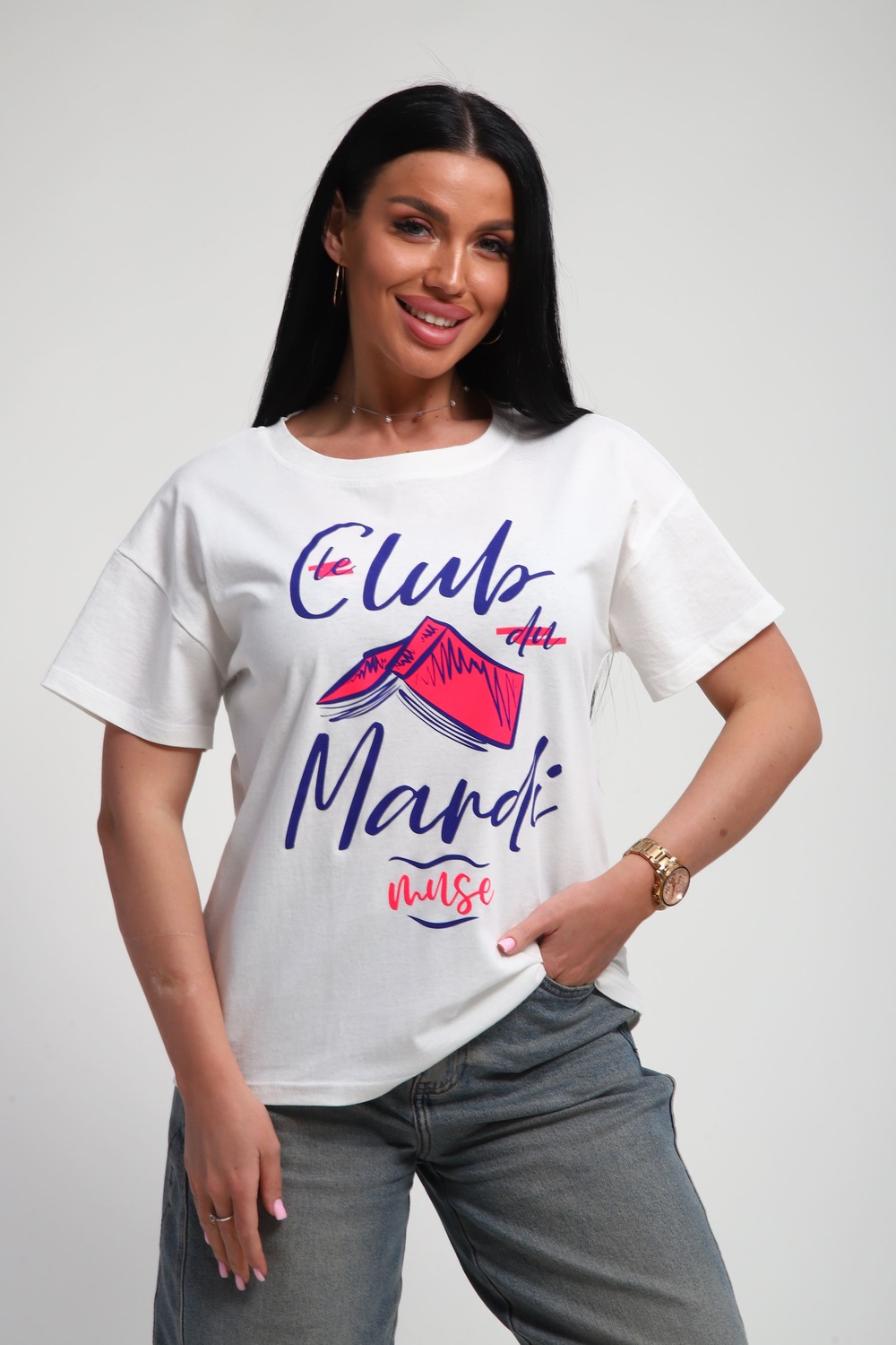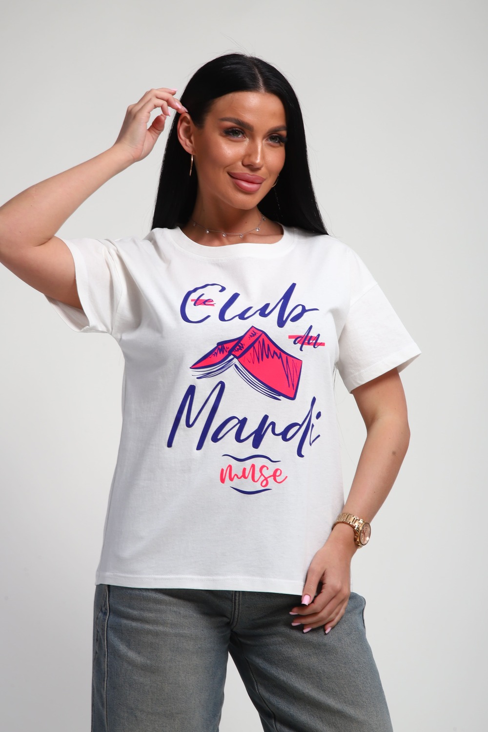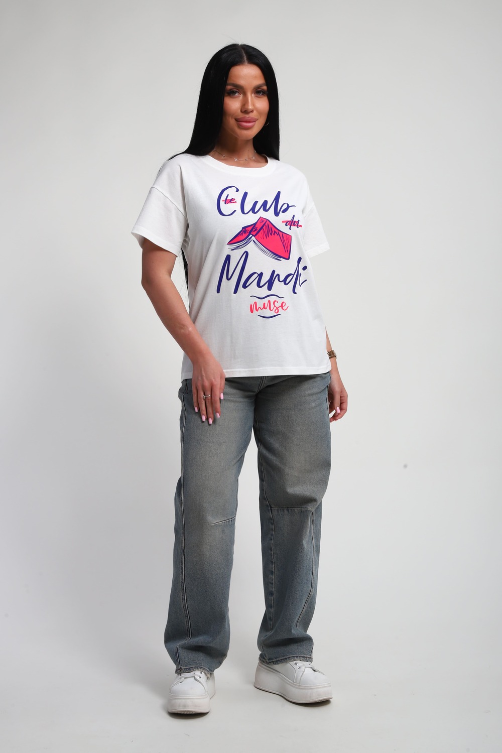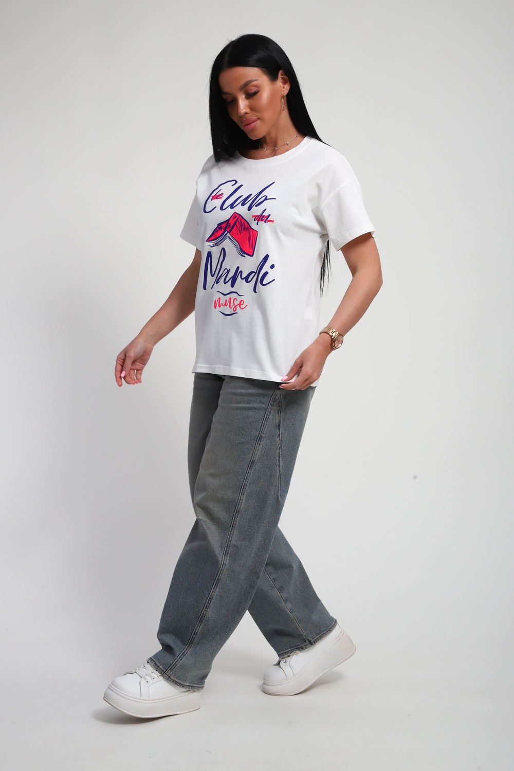 Футболка женская из гладкокрашенного трикотажа, хлопок 100%. Прямого силуэта, свободного облегания. горловина круглой формы. Рукав короткий. Низ изделия прямой. На полочке принт, шелкография.
