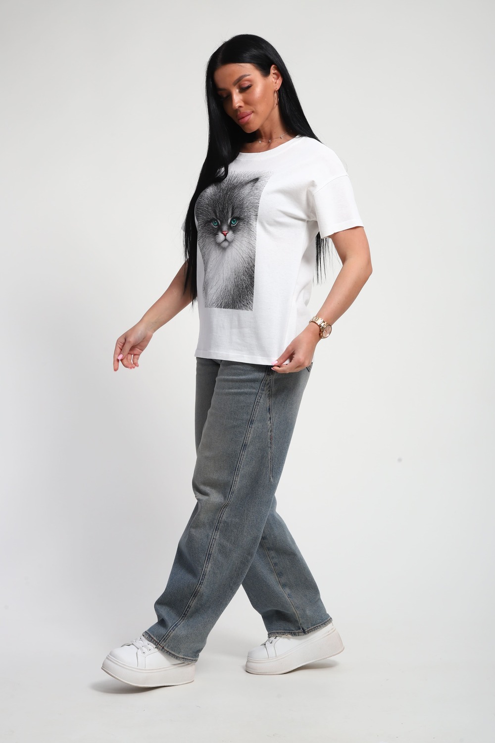 Футболка женская из гладкокрашенного трикотажа, хлопок 100%. Прямого силуэта, свободного облегания. горловина круглой формы. Рукав короткий. Низ изделия прямой. На полочке принт, шелкография.