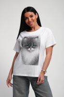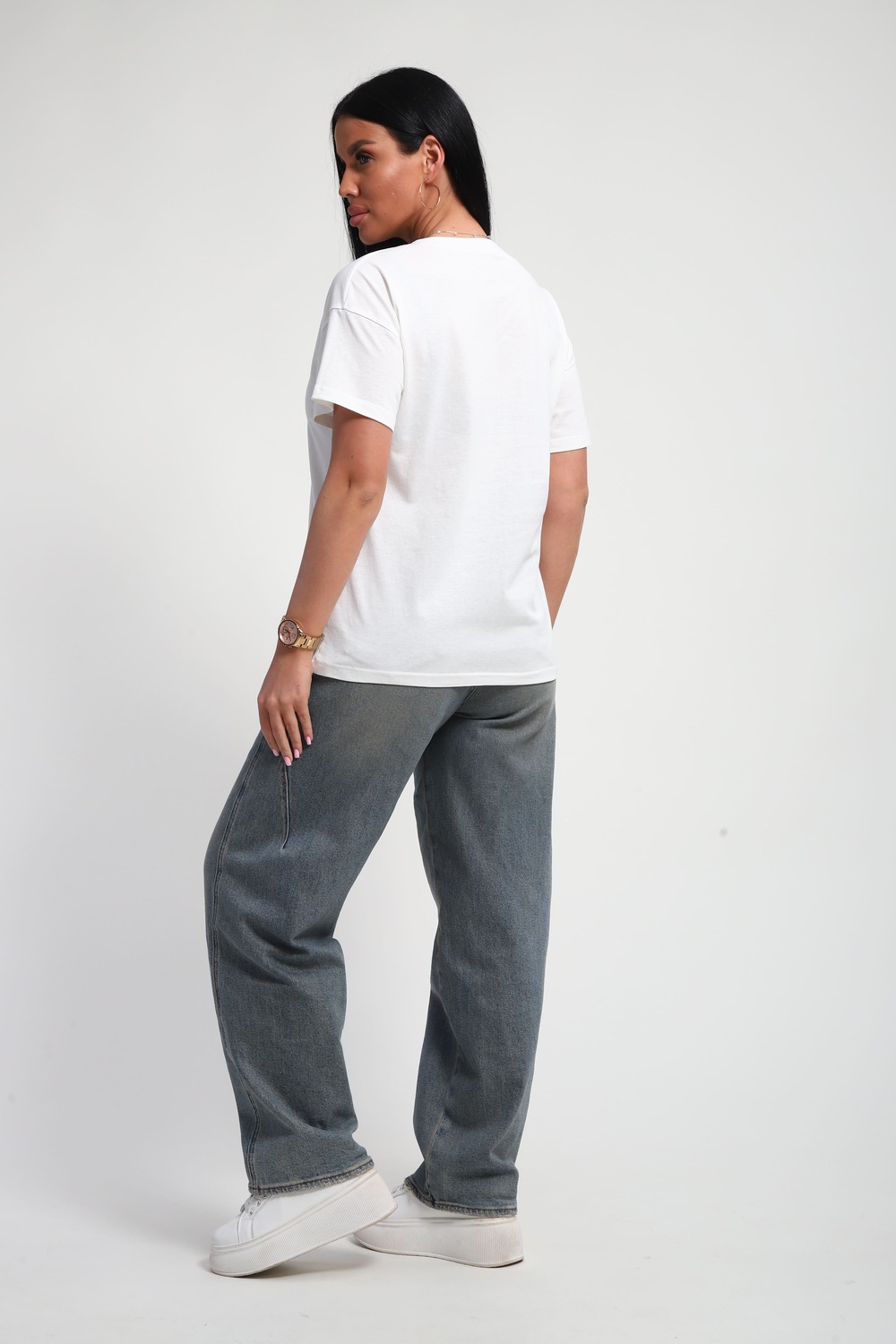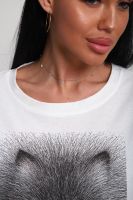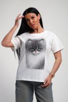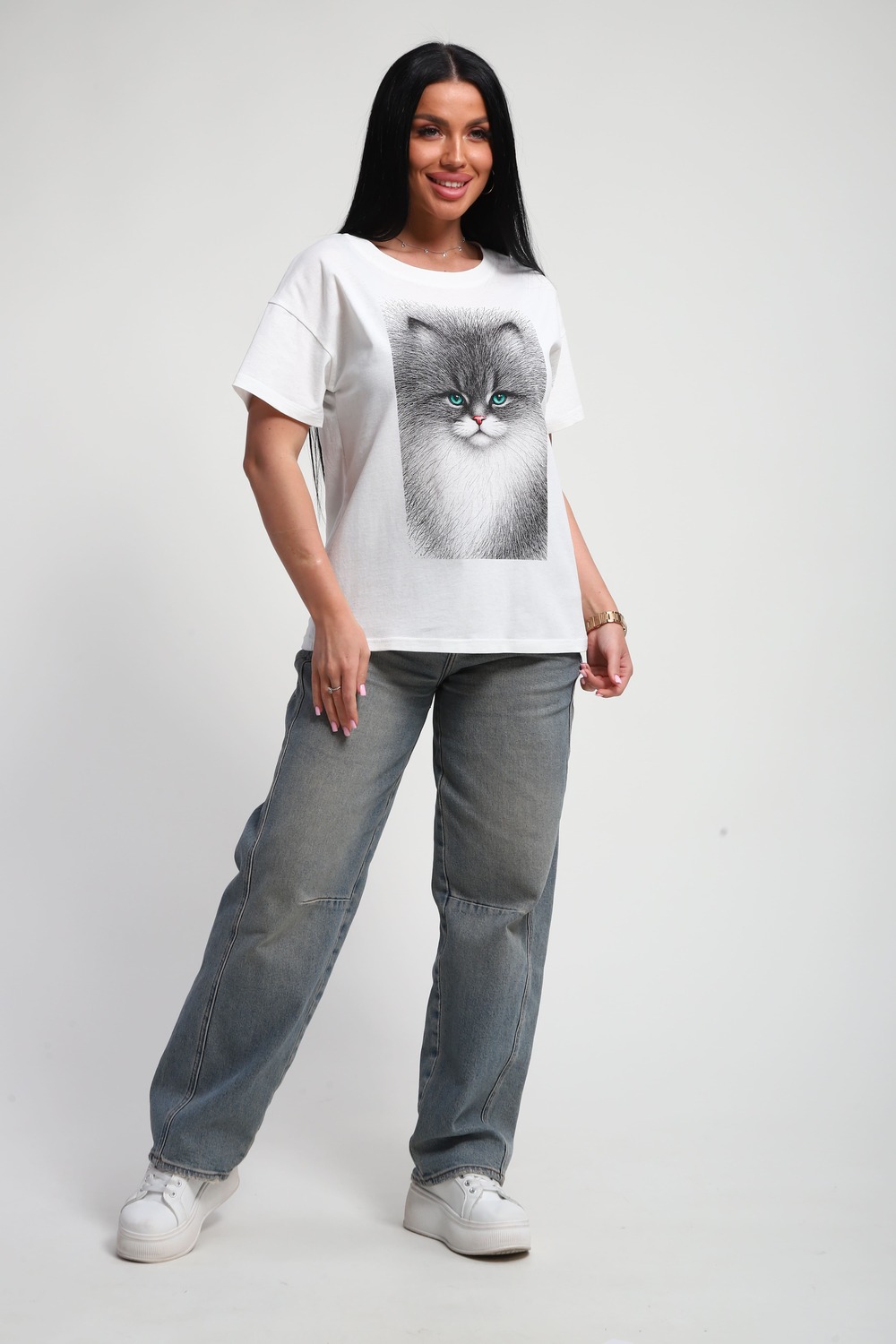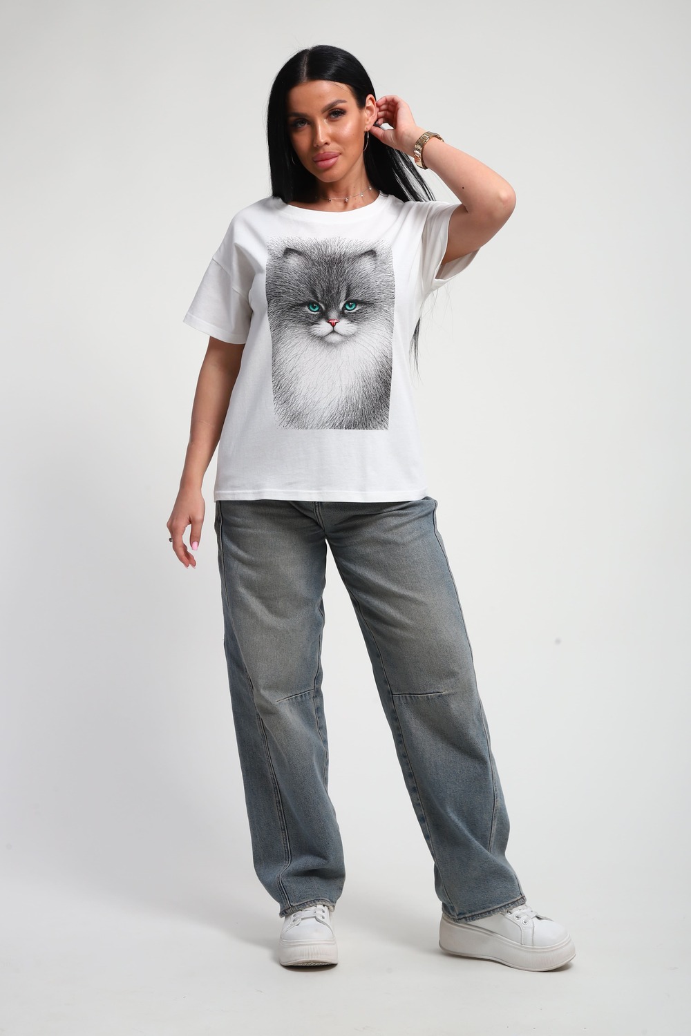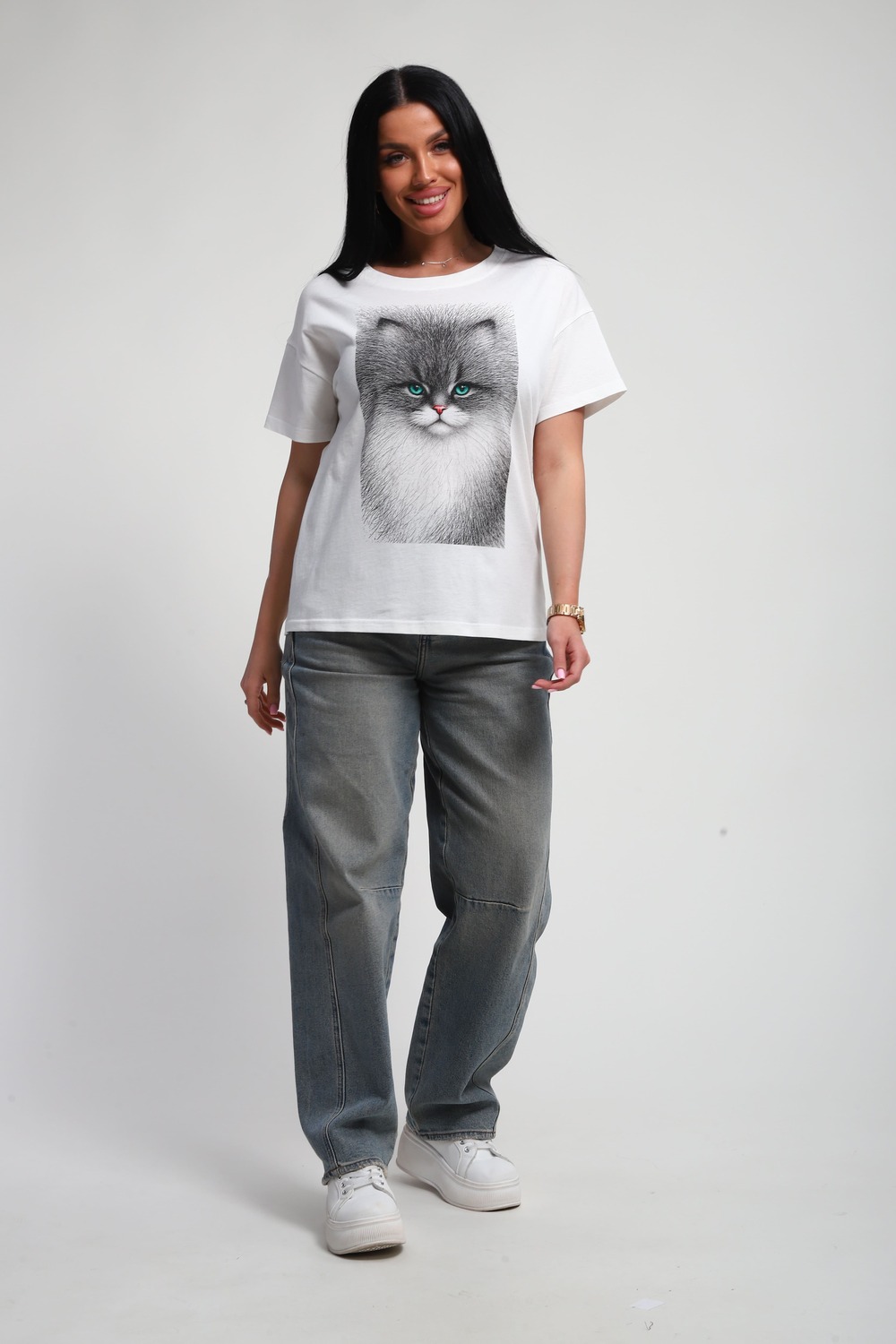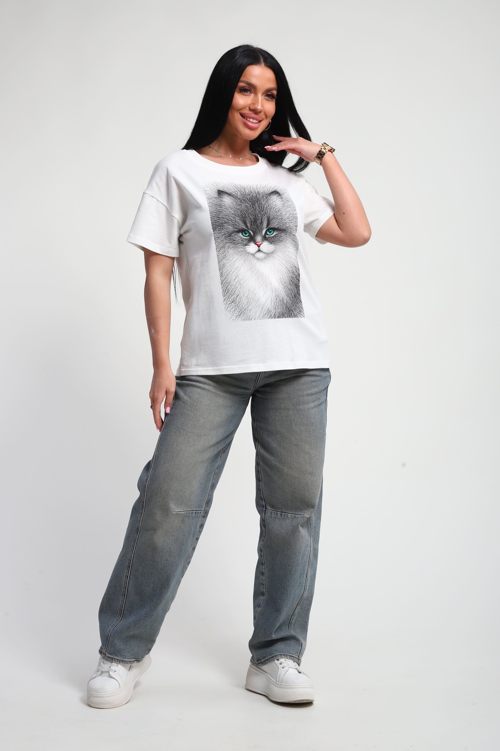Футболка женская из гладкокрашенного трикотажа, хлопок 100%. Прямого силуэта, свободного облегания. горловина круглой формы. Рукав короткий. Низ изделия прямой. На полочке принт, шелкография.