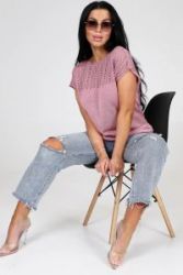 Футболка женская, изготовлена из меланжированного трикотажа. Горловина круглой формы, плечо спущено, без рукава. Низ изделия прямой. На полочке эффектный принт, выполненный методом шелкографии.
