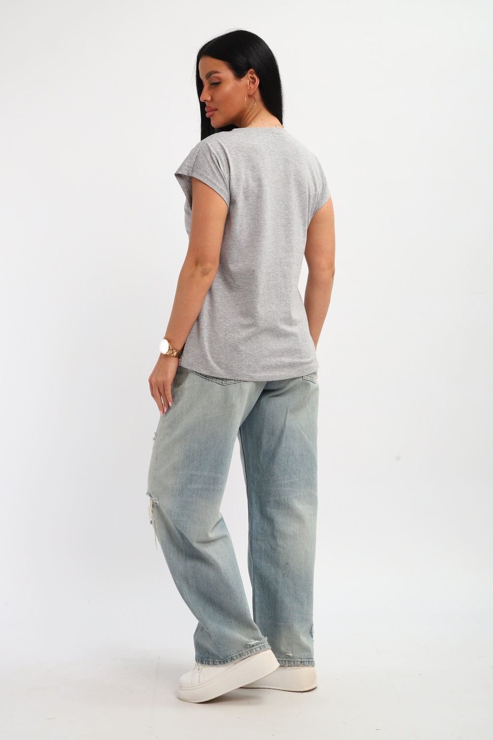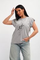 Футболка женская, изготовлена из меланжированного трикотажа. Горловина круглой формы, плечо спущено, без рукава. Низ изделия прямой. На полочке эффектный принт, выполненный методом шелкографии.