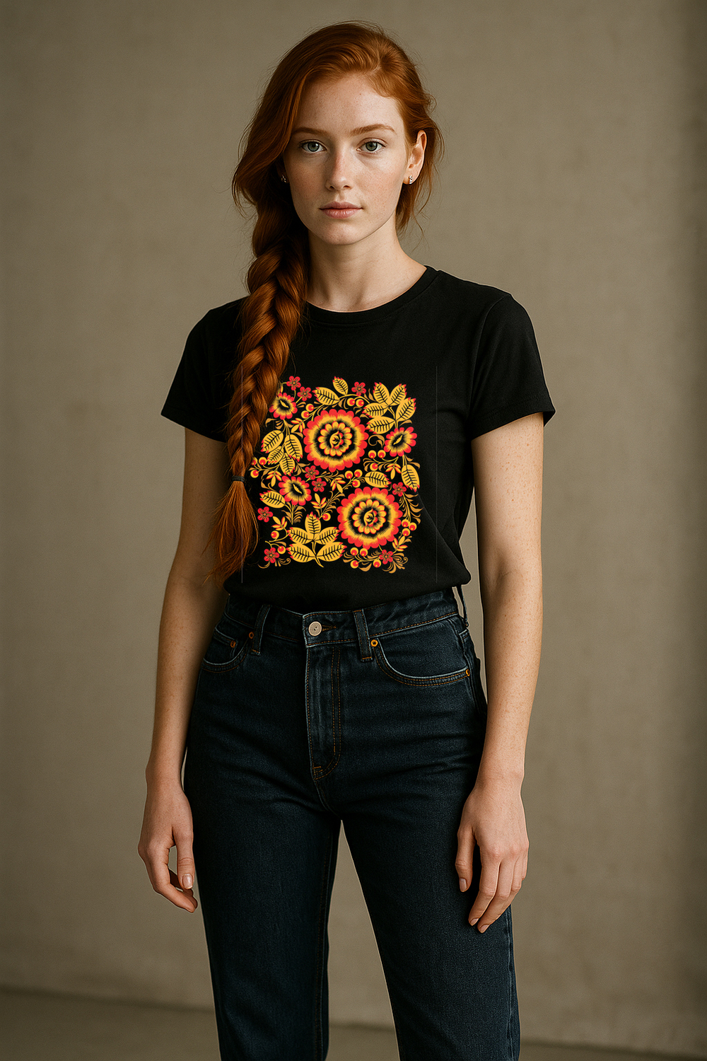 Хлопковая футболка с русским народным узором. Изготовлена из 100% высококачественного хлопка. Дышащая футболка гарантирует комфорт в течение всего дня, а прочный материал долго сохраняет форму и яркость принта.