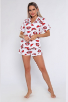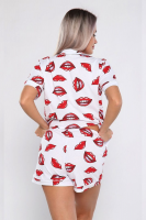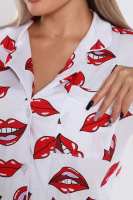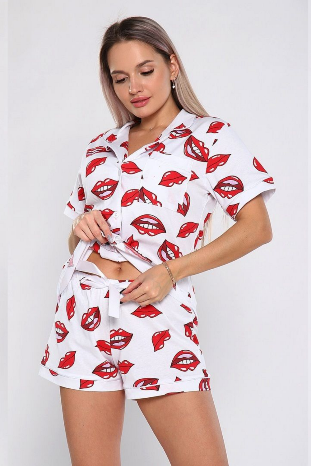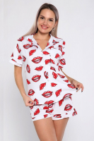 Женская пижама с шортами из хлопка – отличный выбор для комфортного сна и в то же время стильного отдыха. Модель включает в себя верх с коротким рукавом, который украшен пуговками и отложным воротником, что придает ей аккуратный и элегантный вид. Белоснежный цвет с оригинальным рисунком в виде губ добавляет игривости и женственности. Пижама из хлопка обеспечивает приятные тактильные ощущения и хорошую вентиляцию, что делает её идеальной для теплой погоды. Шортики свободного кроя обеспечивают свободу движений во время сна. Это отличный выбор как для домашнего использования, так и для летних поездок на отдых. Выбирайте лушее качество от Руся трикотаж.