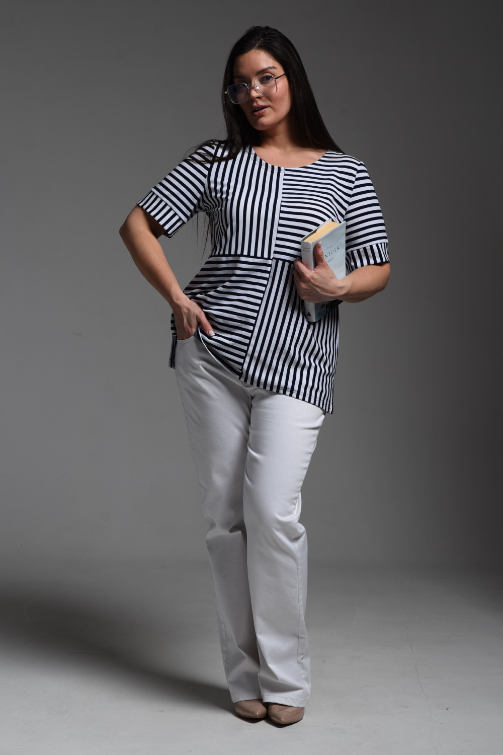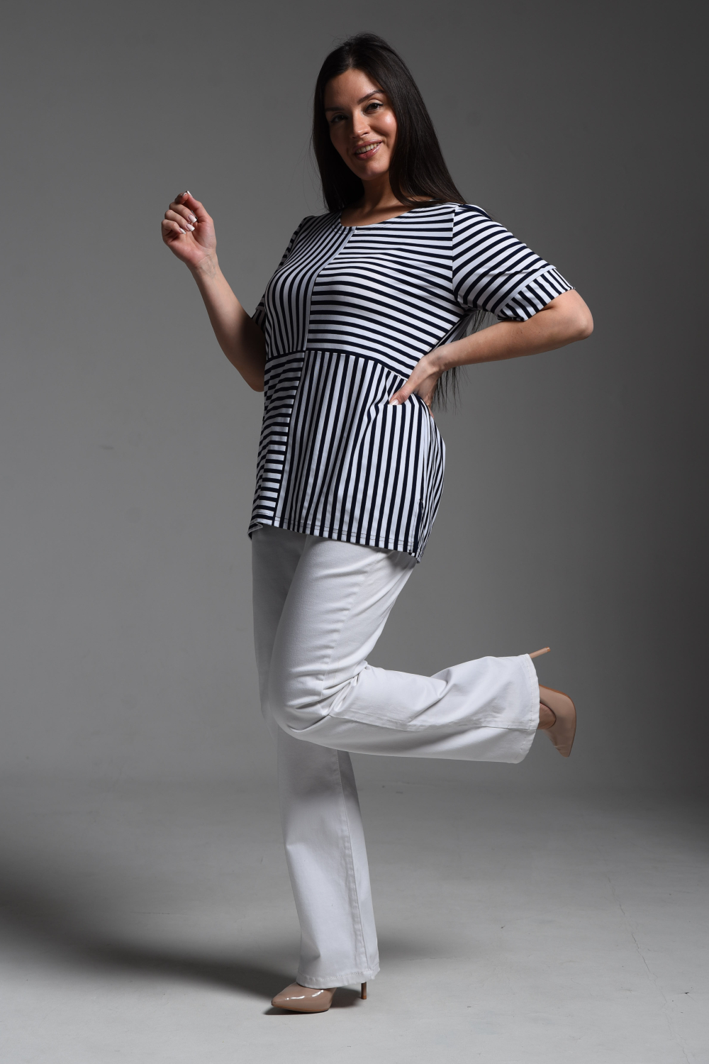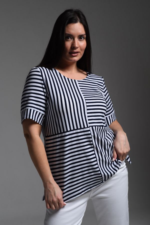 Футболка женская прямая, слегка расширенная к низу, из ткани "в полоску". Горловина округлая. Рукав короткий с манжетой. Полочка состоит из четырех частей, где полоса расположена в шахматном порядке. В боковых швах разрезы.
