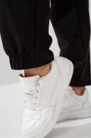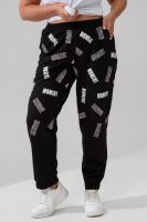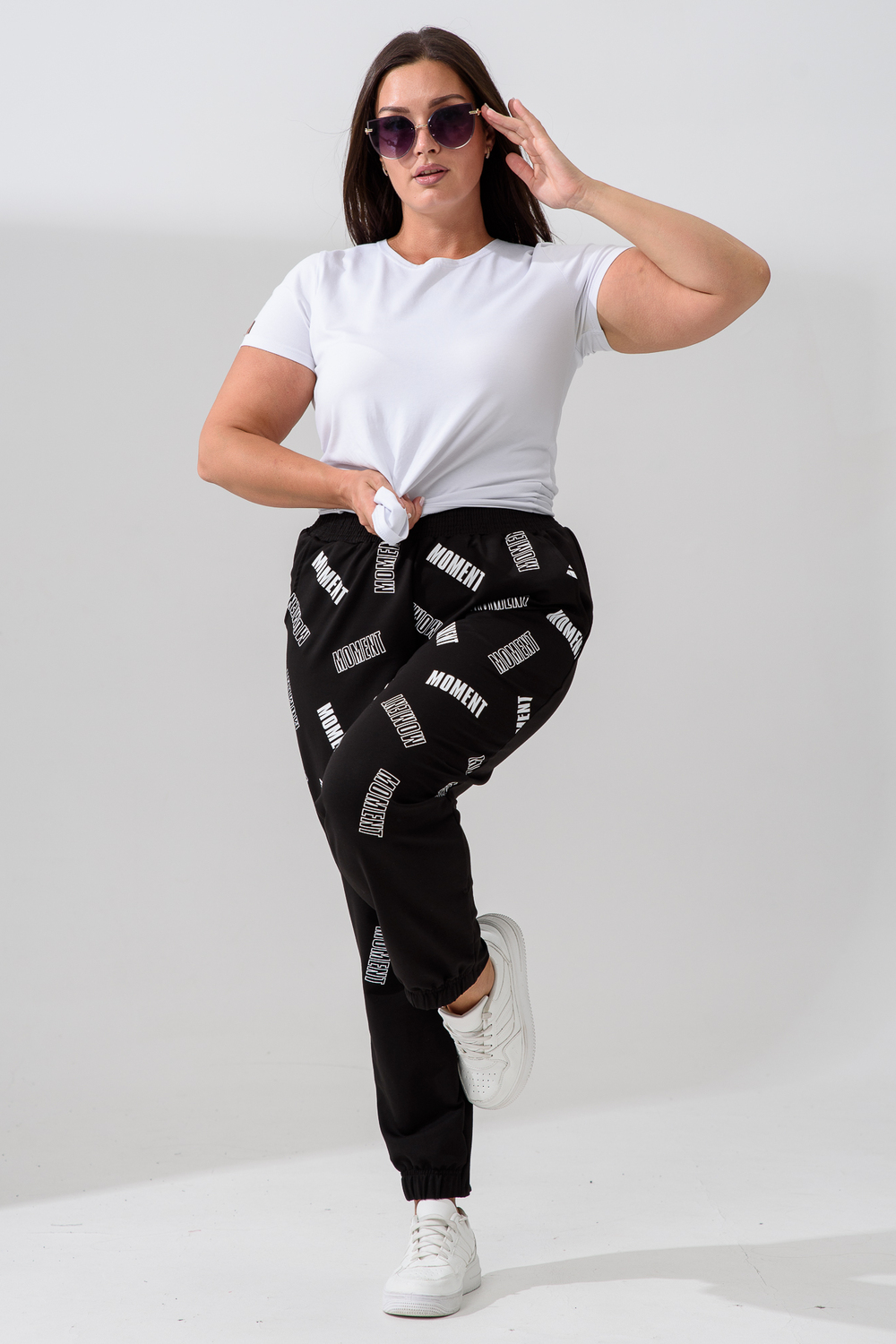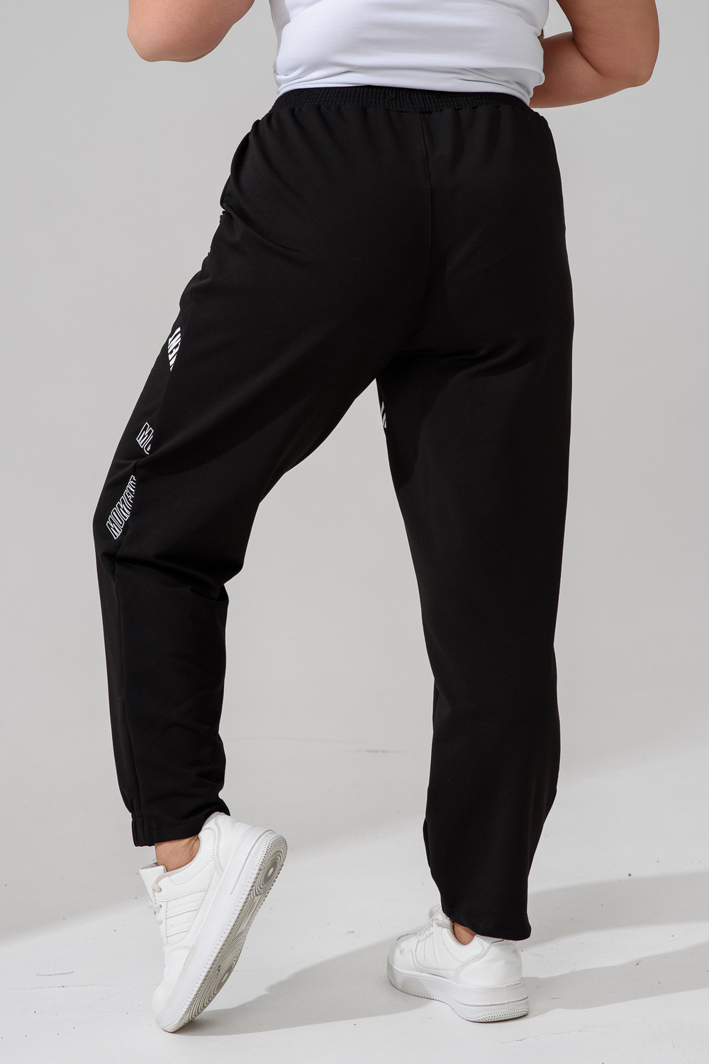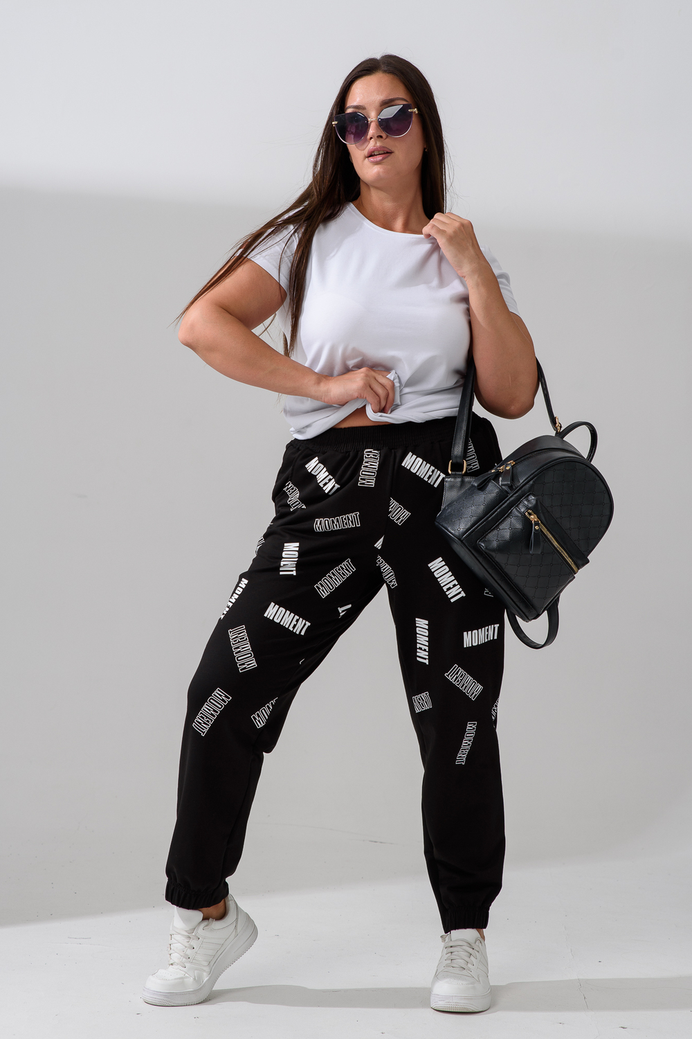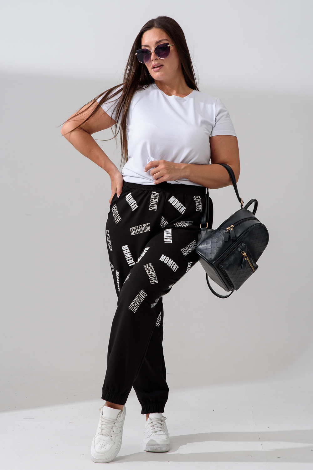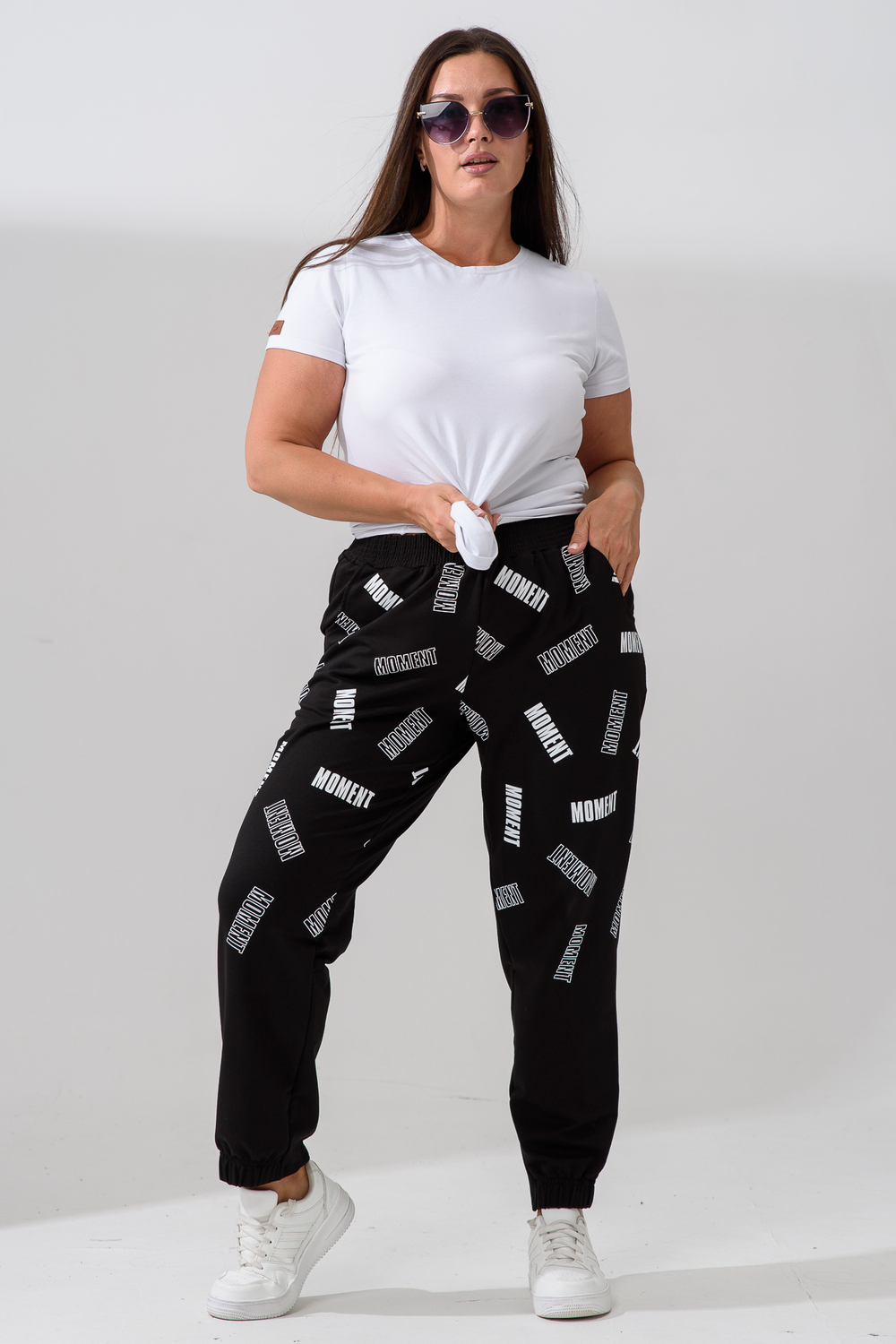 Брюки женские, свободные по бедрам, зауженные к низу. Спереди внутренние карманы, низ передней части брюк собран на эластичную ленту. Пояс выполнен на многоигольной машине. На передней и задней частях брюк принт. Идеальны для повседневной носки.