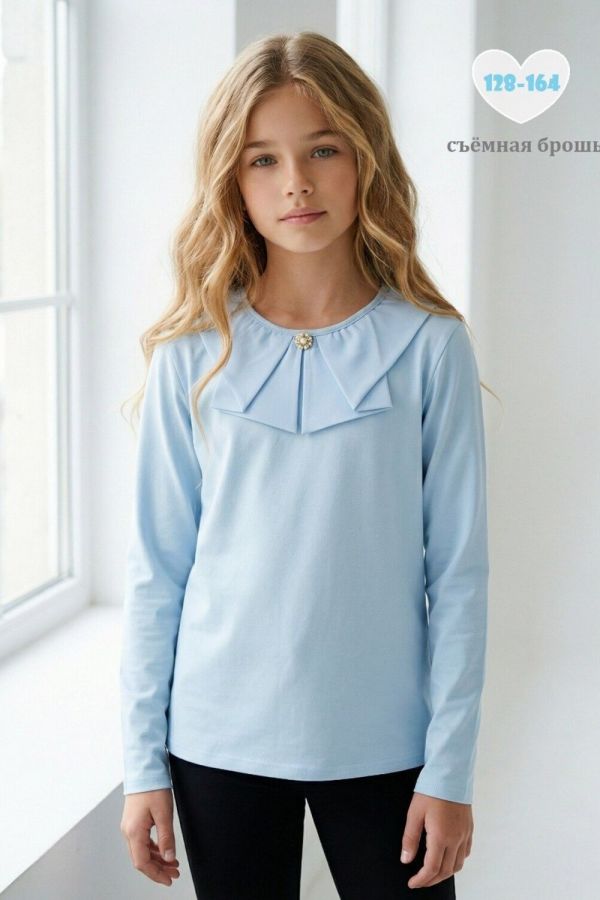Блузка для девочек младшего и старшего школьного возраста, из трикотажного полотна кулирка с лайкрой. Блузка прилегающего силуэта, с втачным рукавом, с центральной застежкой на спинке на петлю и пуговицу, с воротником из шифона. Спереди отсутствуют линии членения. На спинке вырез в виде капельки под застежку. Рукав одношовный, длинный. Низа рукавов и изделия подогнуты. Воротник состоит из двух частей со складками. Спереди по центру прикреплена брошь.