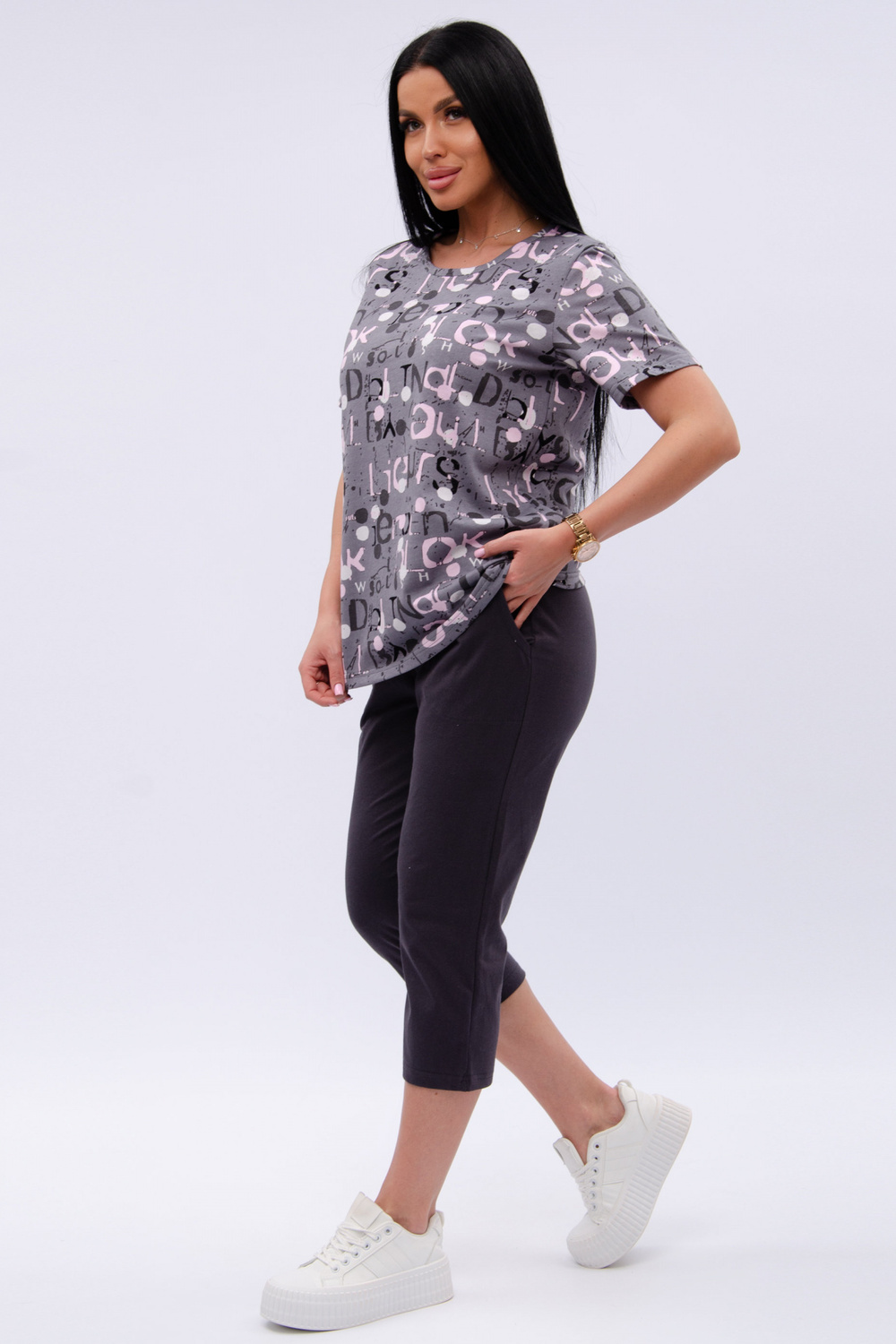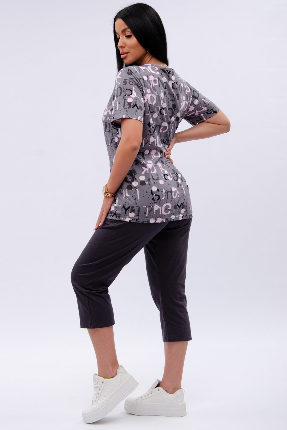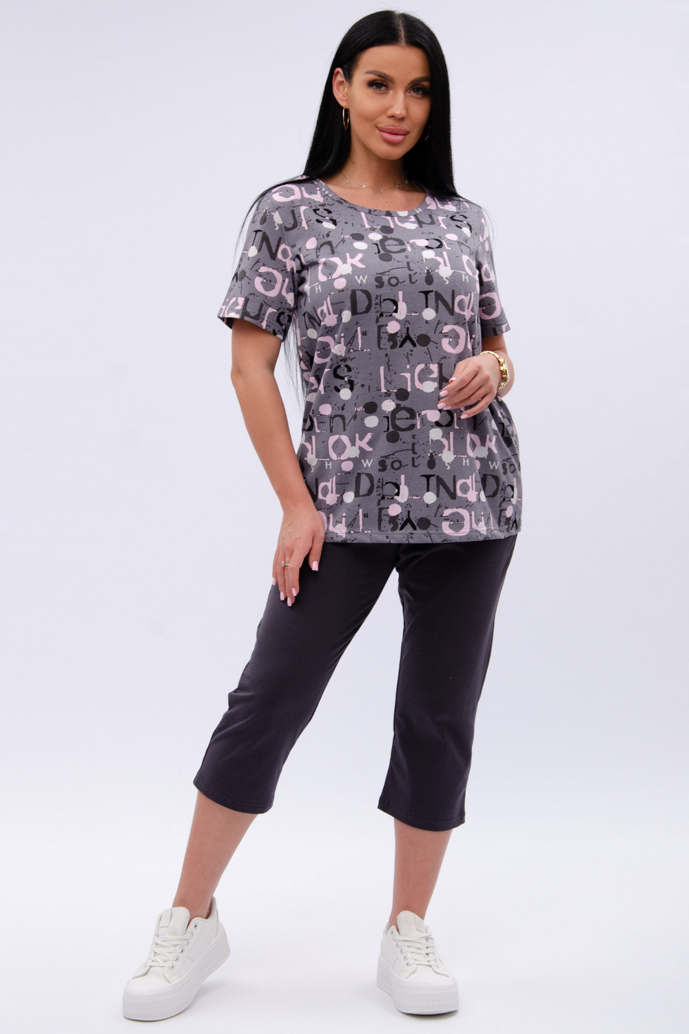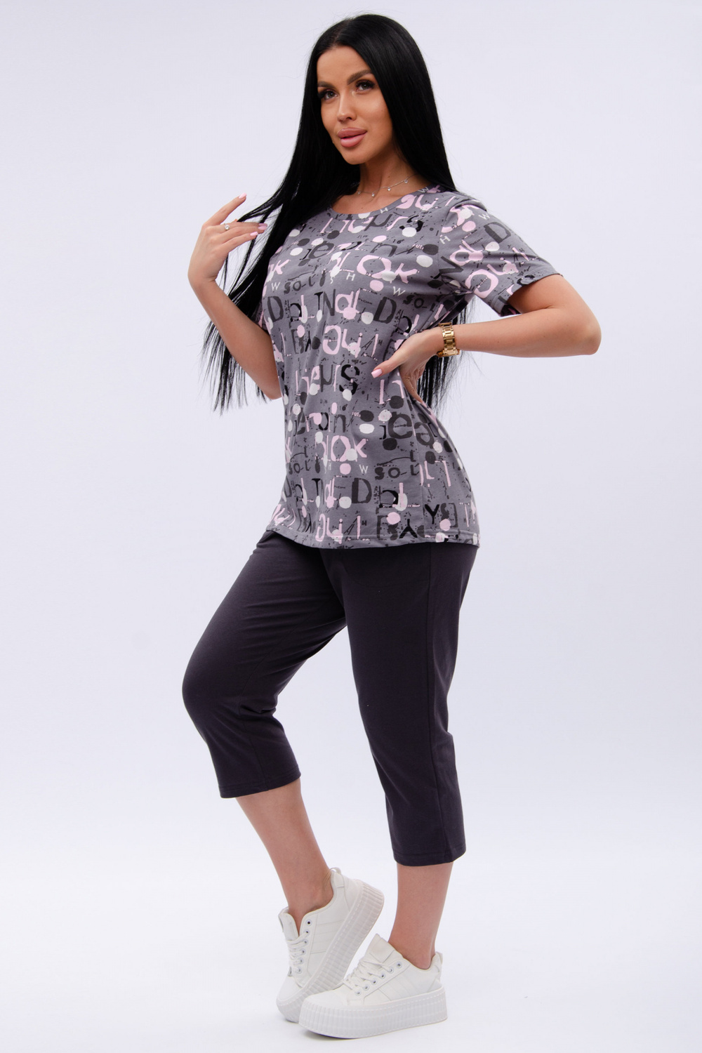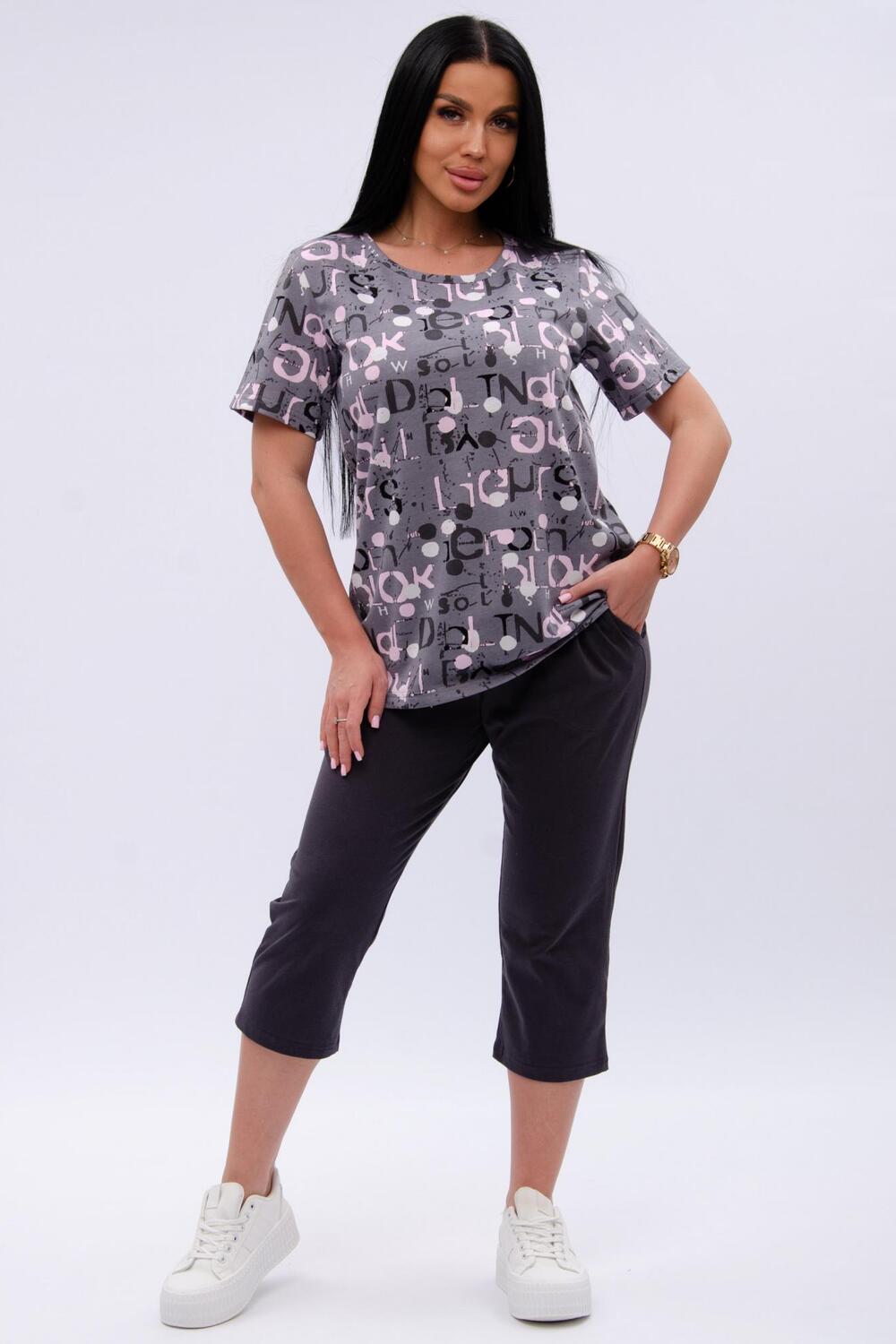 Женский костюм из футболки и бриджей — отличный выбор для дачного сезона и прогулок. Бриджи черного цвета из 100% хлопка обеспечивают комфорт и свободу движения, что особенно важно для активного отдыха на свежем воздухе или дома.