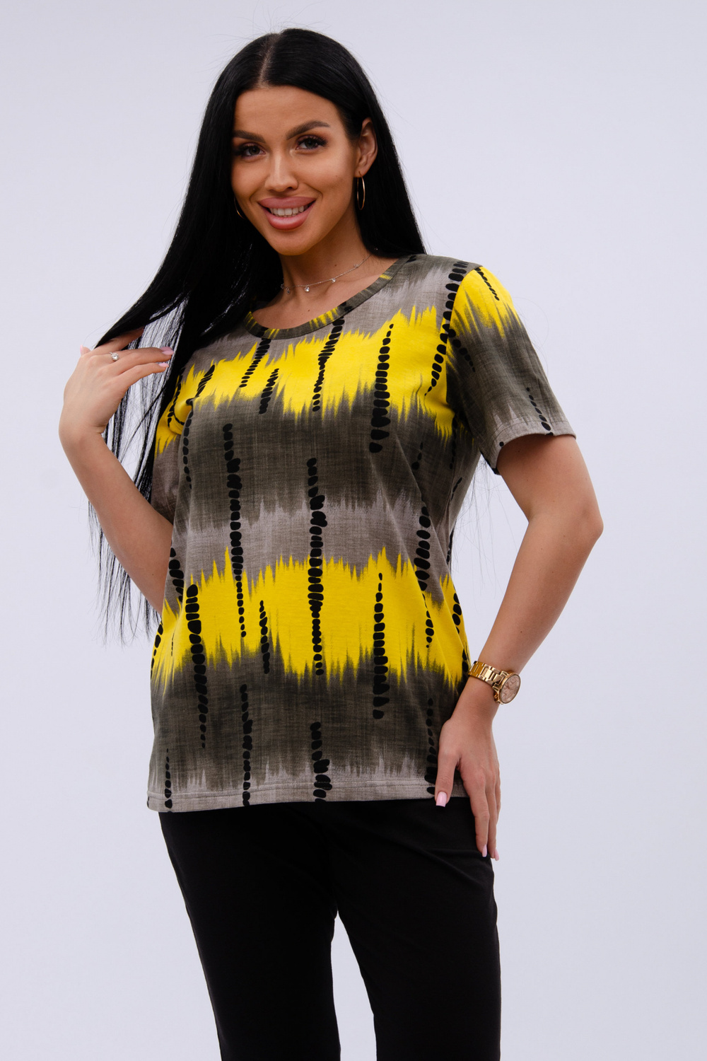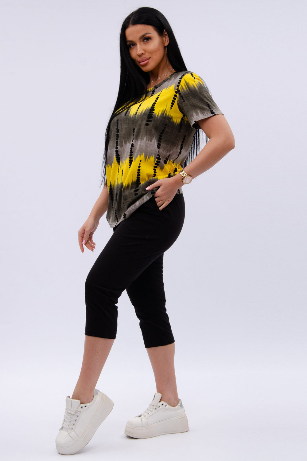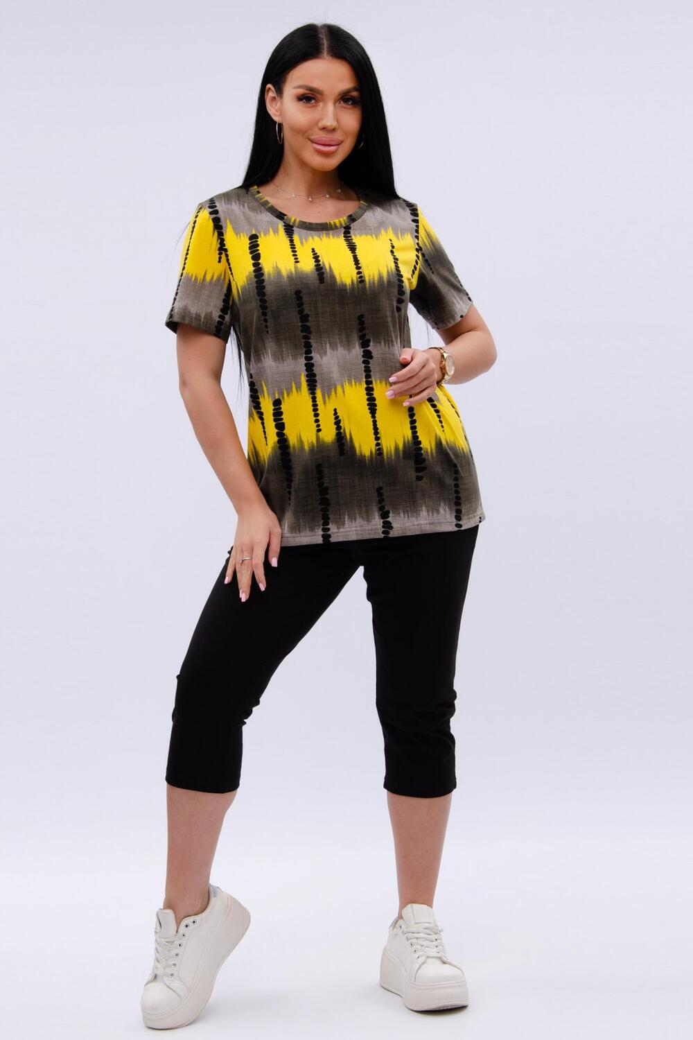 Женский костюм из футболки и бриджей — отличный выбор для дачного сезона и прогулок. Бриджи черного цвета из 100% хлопка обеспечивают комфорт и свободу движения, что особенно важно для активного отдыха на свежем воздухе или дома.
