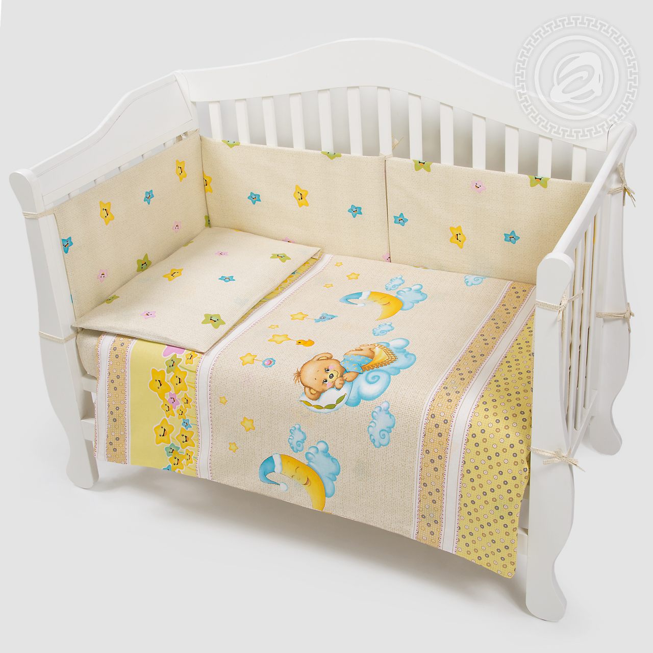 Борта:6шт; Подушка:1 шт-40*60; Наволочка(клапан):1шт.-40*60; Простыня на резинке:1шт.-120*60; Одеяло:1шт.-110*90; Пододеяльник:1шт.-110*90