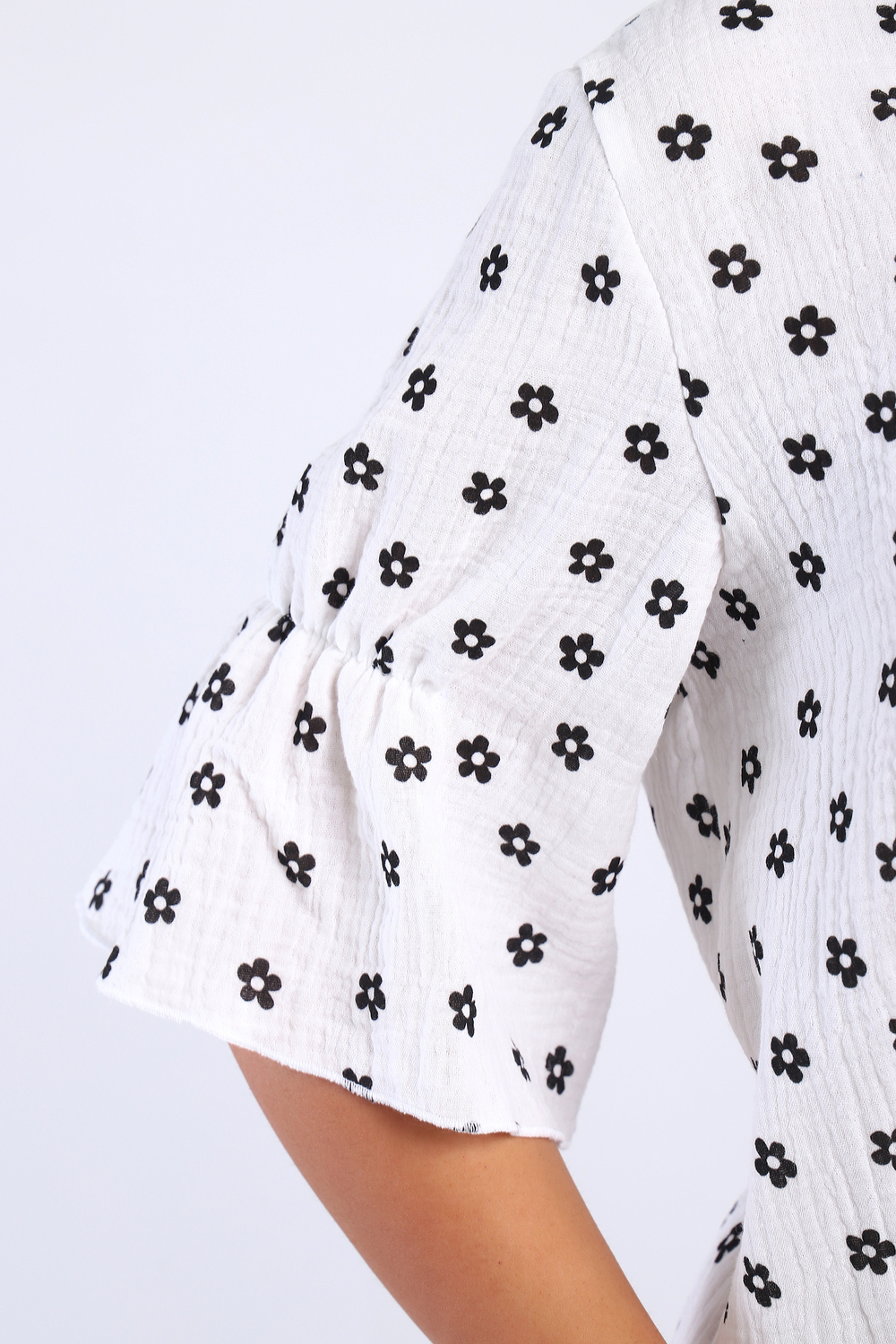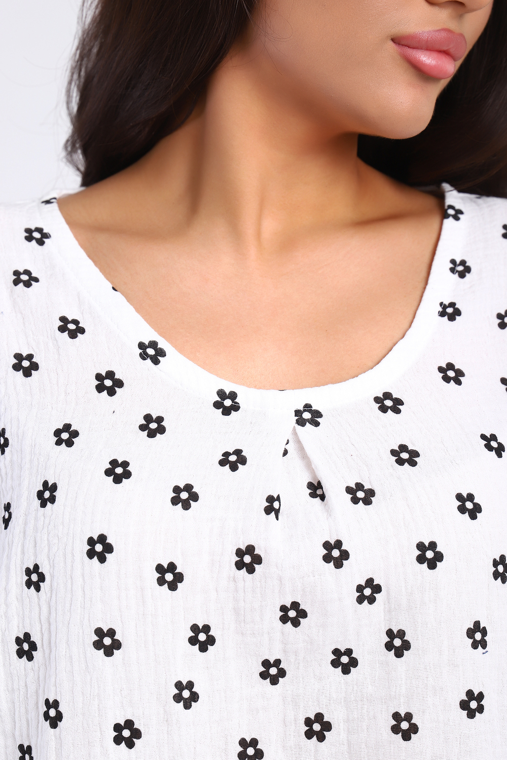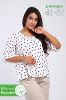 Настоящая находка для любителей натуральных тканей - очаровательная легкая блузка из муслина. Свободный крой блузки дополняют расклешенные рукава, присборенные на резинку по центру. Горловина округлая, окантованная косой бейкой, в центре застрочена встречная складка. Длина изделия до середины бедра. Низ блузки и низ рукавов обработаны на краевом оверлоке. Невесомая и воздушная блузка подойдет и для прогулок в жаркую погоду, и для работы в офисе. Черная ткань имеет золотистые вкрапления, что делает блузку очень эффектной. Стирать данную вещь рекомендуем вручную, утюжить только с изнаночной стороны.