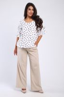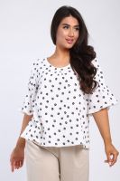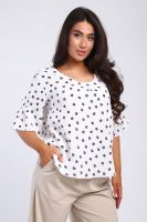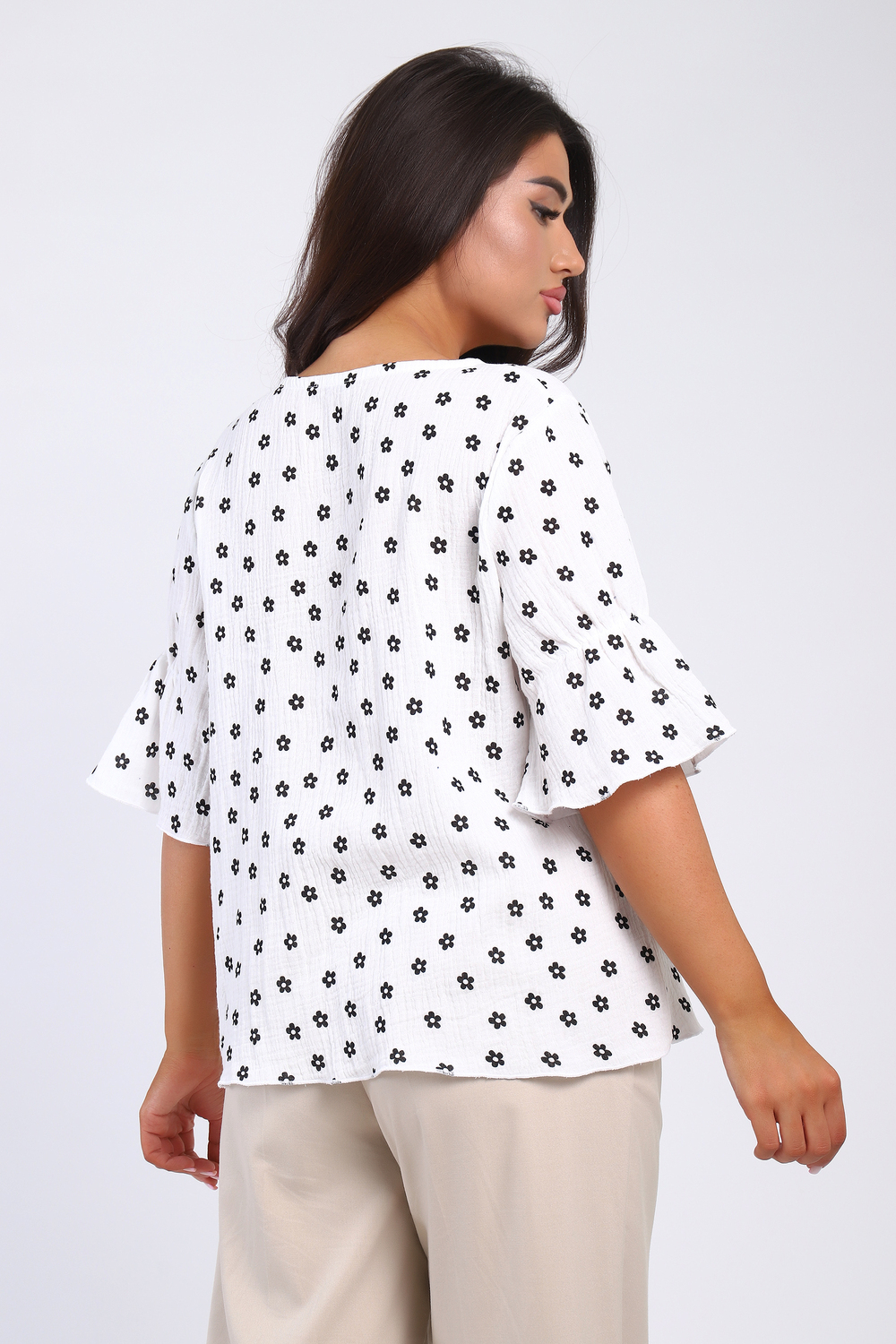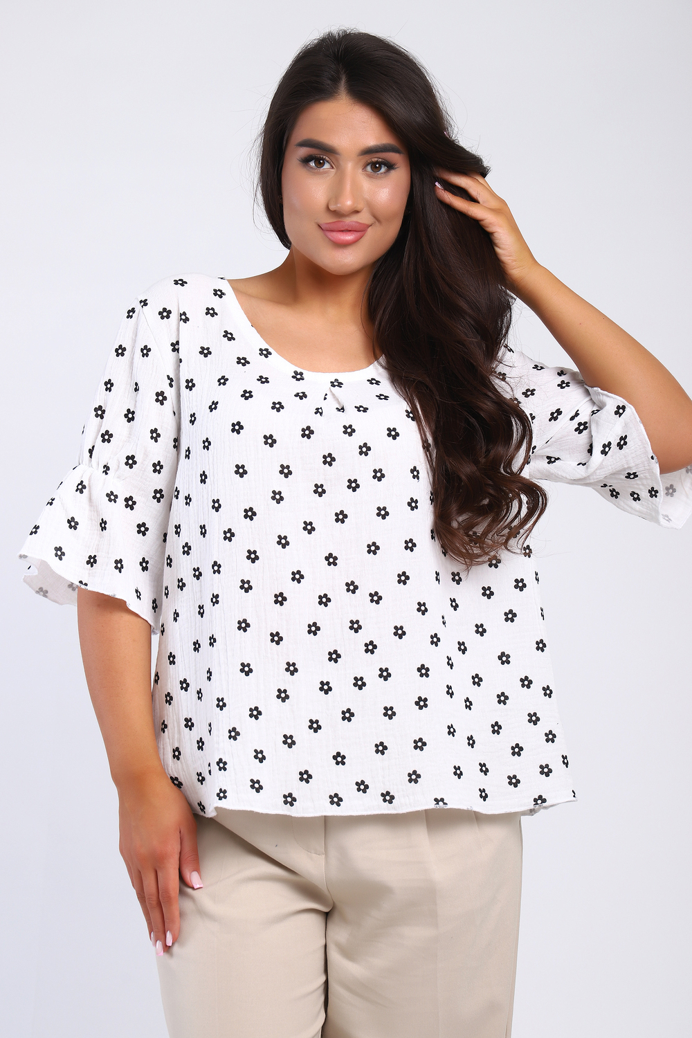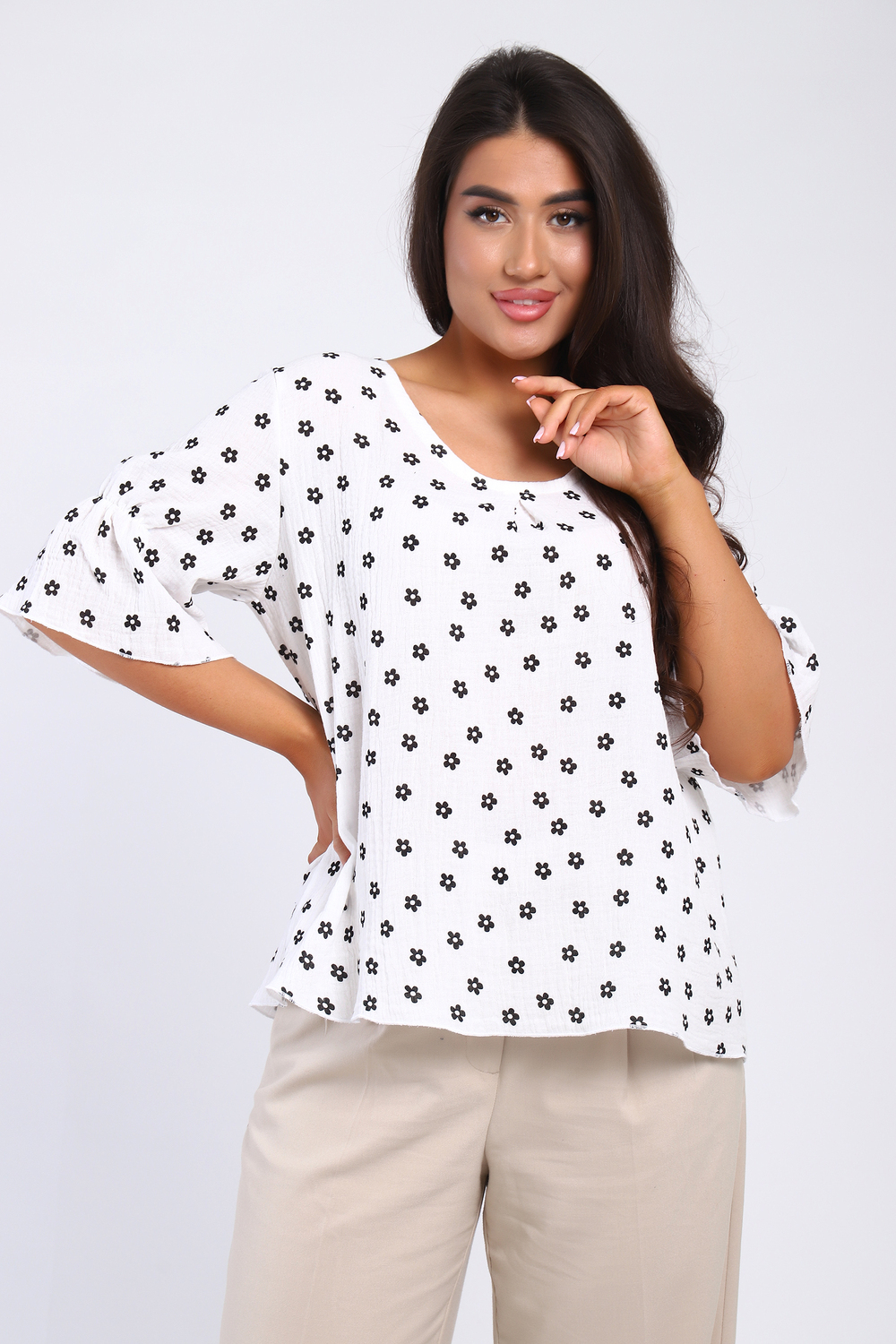 Настоящая находка для любителей натуральных тканей - очаровательная легкая блузка из муслина. Свободный крой блузки дополняют расклешенные рукава, присборенные на резинку по центру. Горловина округлая, окантованная косой бейкой, в центре застрочена встречная складка. Длина изделия до середины бедра. Низ блузки и низ рукавов обработаны на краевом оверлоке. Невесомая и воздушная блузка подойдет и для прогулок в жаркую погоду, и для работы в офисе. Черная ткань имеет золотистые вкрапления, что делает блузку очень эффектной. Стирать данную вещь рекомендуем вручную, утюжить только с изнаночной стороны.