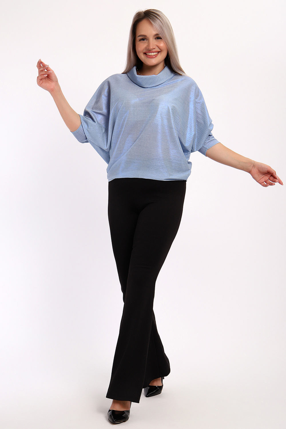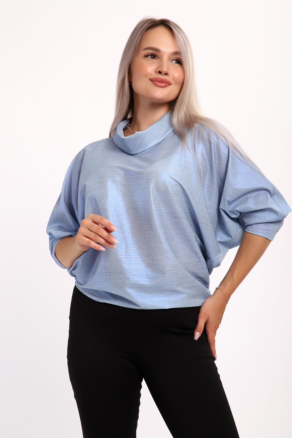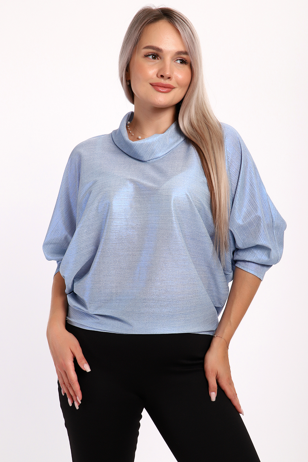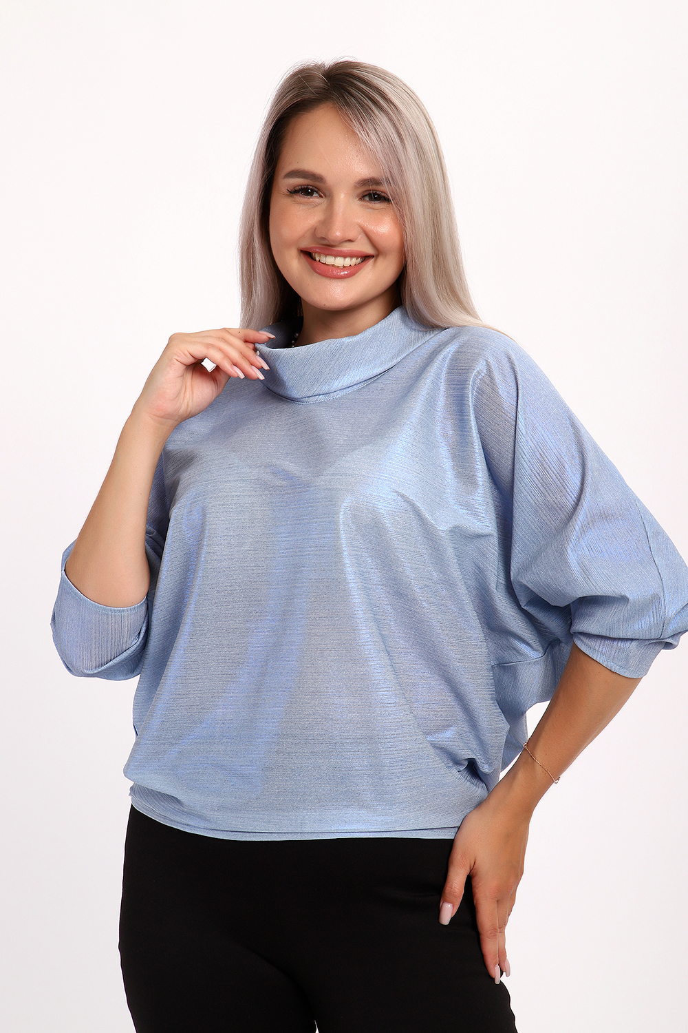 Нарядная и эффектная блузка из ткани шифон- металлик. Ткань тонкая, слегка прозрачная, имеет красивый металлический блеск, переливаясь на складках изделия, не мнется и отлично драпируется. Свободный крой и рукав "летучая мышь" делает эту блузку универсальной, подходящей на любую фигуру. Длина рукава 3/4, воротник- хомут придает женственности образу. Блузка слегка заужена к низу, чтобы на бедрах образовался напуск. С помощью этой блузки можно создать и праздничный, и деловой, и повседневный образ, комбинировать с юбкой и брюками. Широкий размерный ряд - с 48 по 62 размеры. Рекомендуем стирать изделие в режиме бережной стирки или вручную.