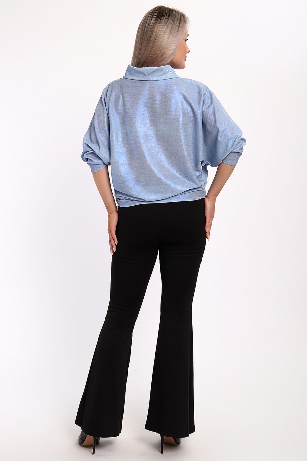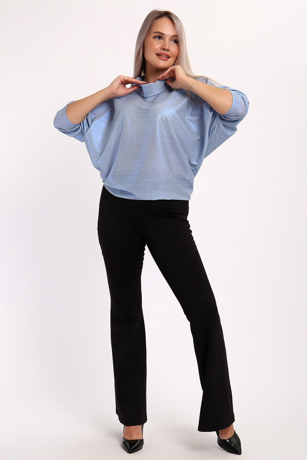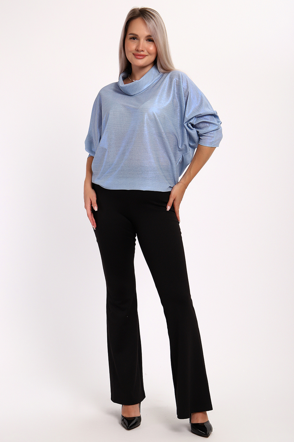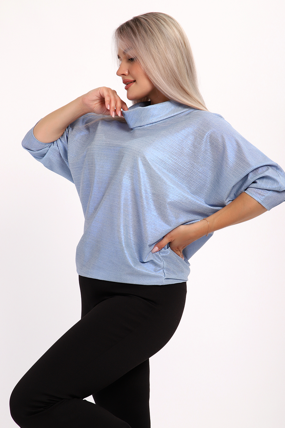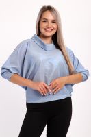 Нарядная и эффектная блузка из ткани шифон- металлик. Ткань тонкая, слегка прозрачная, имеет красивый металлический блеск, переливаясь на складках изделия, не мнется и отлично драпируется. Свободный крой и рукав "летучая мышь" делает эту блузку универсальной, подходящей на любую фигуру. Длина рукава 3/4, воротник- хомут придает женственности образу. Блузка слегка заужена к низу, чтобы на бедрах образовался напуск. С помощью этой блузки можно создать и праздничный, и деловой, и повседневный образ, комбинировать с юбкой и брюками. Широкий размерный ряд - с 48 по 62 размеры. Рекомендуем стирать изделие в режиме бережной стирки или вручную.