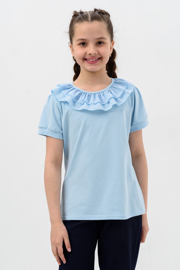 Школьная блузка для девочки с трикотажными короткими рукавами, круглым вырезом горловины, с застежкой на пуговицу. На горловину настрочен волан из шифона, сбоку пришит декоративный элемент. Кофта для девочки полуприлегающего силуэта, изготовлена из высококачественного полотна, в составе которого натуральный хлопок и лайкра, наличие эластана обеспечивает хорошую растяжимость, что способствует удобной и комфортной посадке на ребенке. Праздничная, подростковая форма украсит и дополнит любой образ не только в школу, но и для повседневной носки, на день рождения, фотосессию и для особых случаев. Джемпер школьный отлично сидит по фигуре, движения в нем комфортные, позволяет выглядеть ребенку изящно. Модная нарядная блуза отлично сохраняет цвет и форму при активной носке и после многократных стирок. Используемый материал блузки мягкий и приятный телу, устойчив к износу, не садится, не образует катышек на поверхности, имеет эффектный внешний вид. Для Вашего удобства в фотогалерее вложена размерная таблица, рекомендуем воспользоваться именно ей при выборе блузки детской.