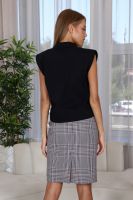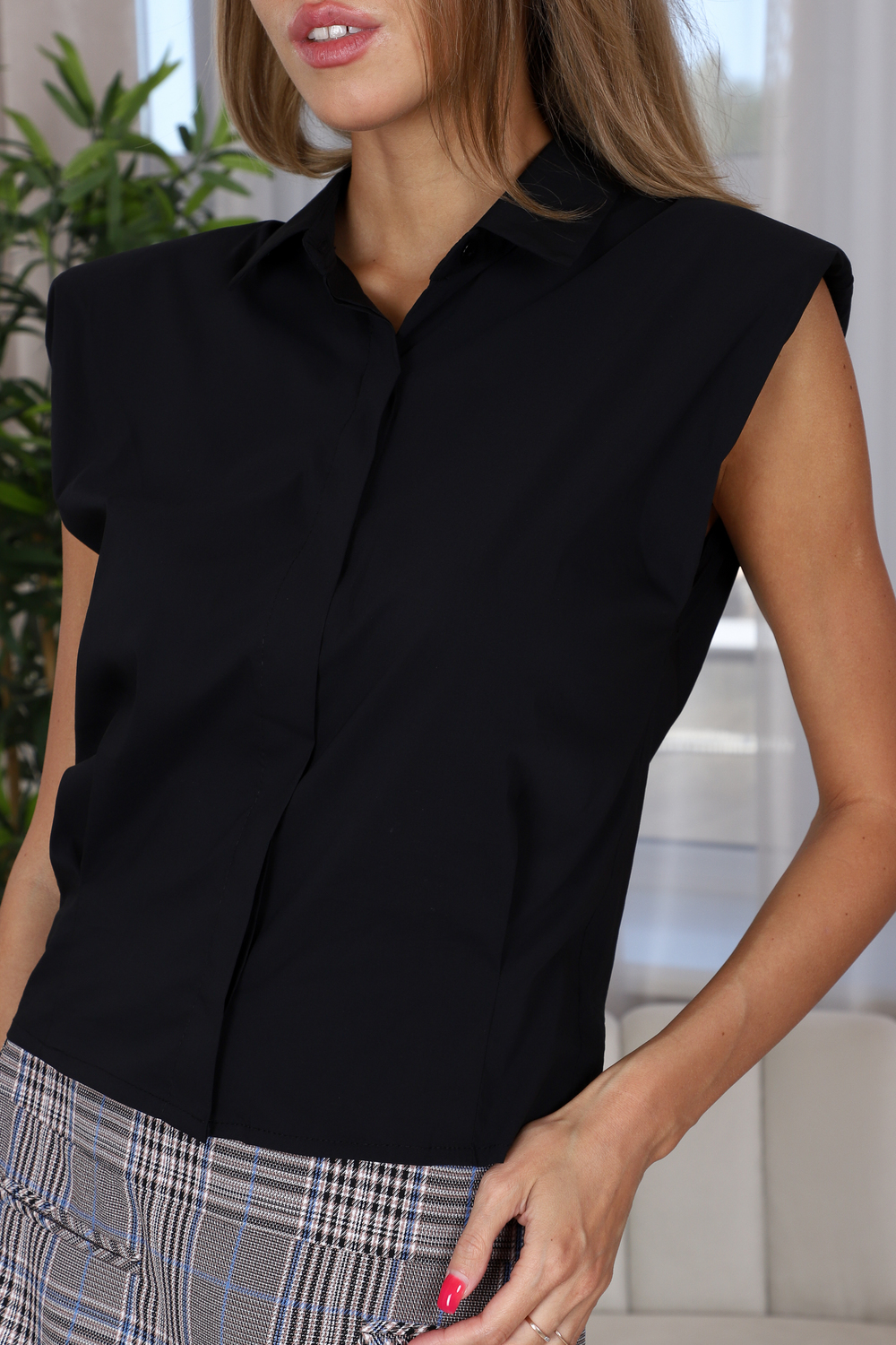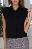 Укороченная блузка с рубашечным воротником, без рукавов застегивается на потайную застежку. Плечи подчеркнуты подплечниками, которые придадут образу большей женственности. На полочке по низу застроченная складка, акцентирующая талию