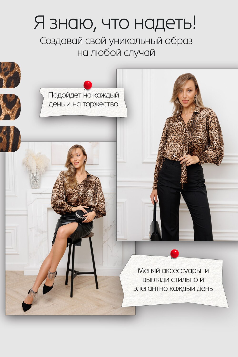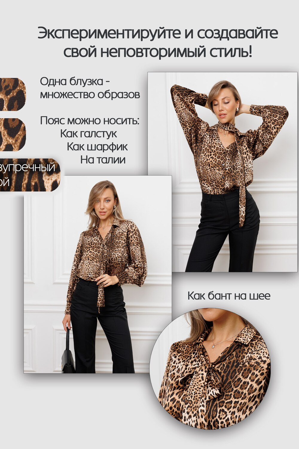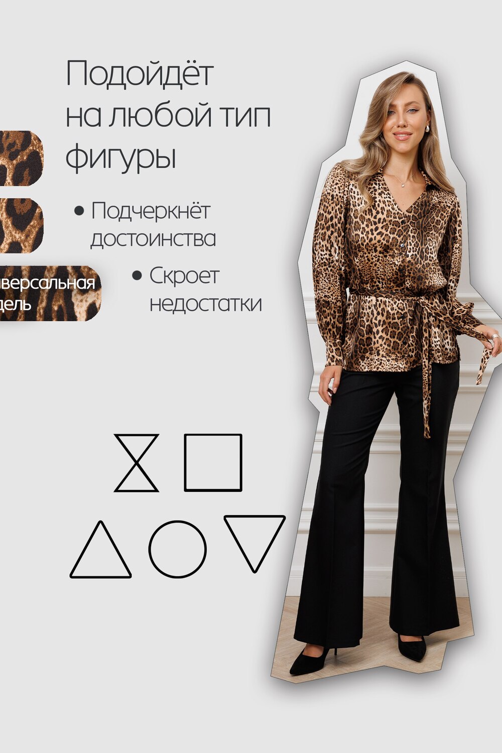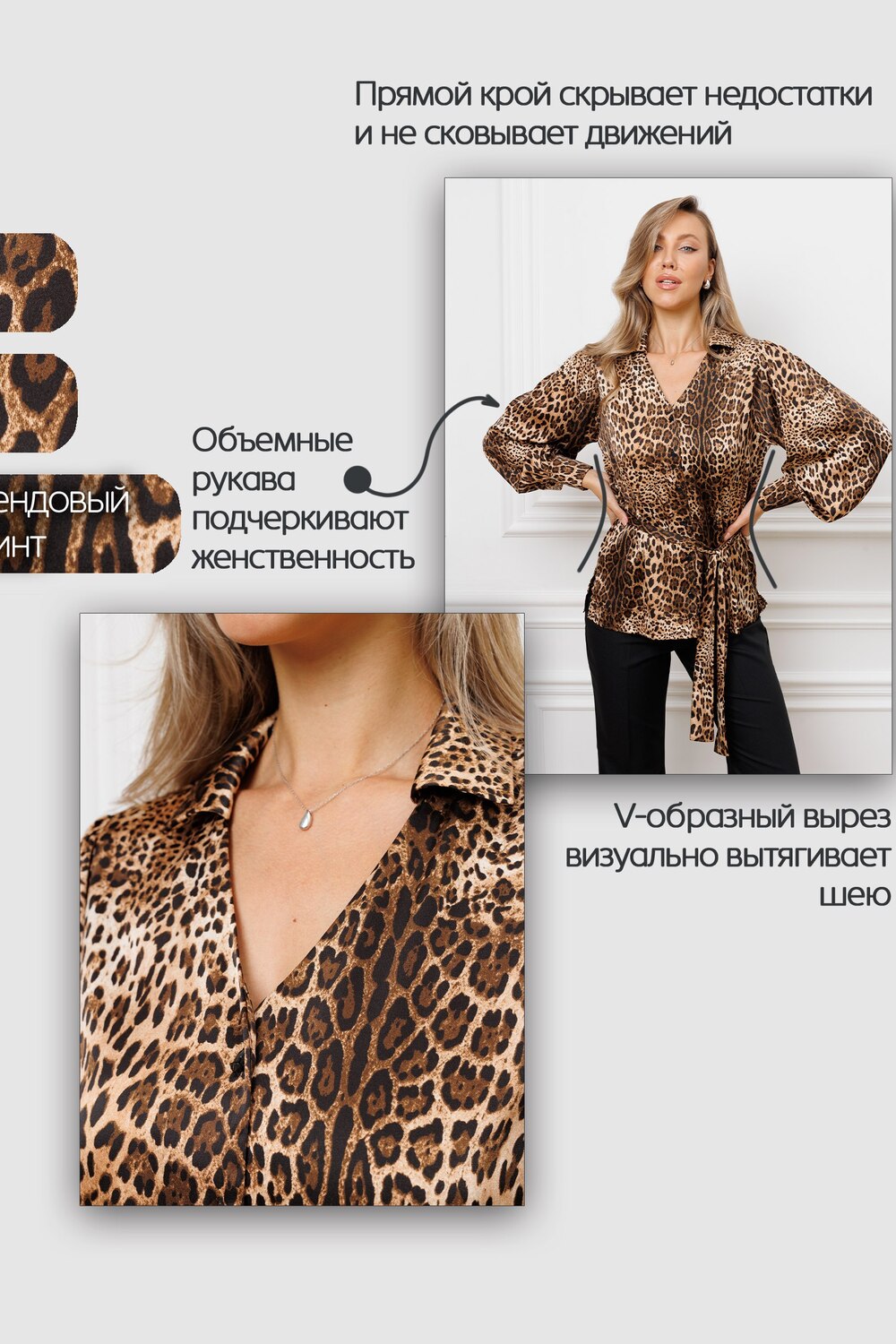 Блузка с поясом от российского производителя бренда женской одежды! Блуза прямого силуэта с V-образным вырезом, застегивается на пуговицы. Данная модель свободного кроя имеет леопардовый принт, в боковых швах имеются разрезы, пояс съемный. Рукав полной длины внизу имеет две складки, разрез и манжету, которая застегивается на две пуговицы. Необычное дизайнерское решение позволило совместить элегантную классику и эффектный стиль. Леопардовая рубашка женская станет отличным дополнением к любому гардеробу. Шелковая модель имеет в комплекте пояс, что подчеркивает талию и создает элегантный силуэт. Стильная блузка с поясом станет отличным выбором для женщин, стремящихся выглядеть нарядно и модно. Изготовленная из легкой атласной ткани, она обладает свободным кроем оверсайз, что обеспечивает комфорт в носке. Черный и белый цвета отлично подойдут как для праздничного мероприятия, так и для офисных встреч. Эта рубашка дополнена рукавами-фонариками, что придает образу романтичности и элегантности. Пояс позволяют регулировать силуэт, создавая акцент на талии. Также присутствует стильный леопардовый принт, который добавляет нотку дерзости в наряд. Блуза идеально подходит для школьной формы или делового стиля. Она станет универсальным элементом гардероба — ее можно сочетать с юбками или брюками, создавая разнообразные образы на лето и вечеринки. Праздничные выходы станут еще ярче с этой модной одеждой. Вам понравится удобство и легкость этой женской рубахи! Стройнящий силуэт позволит чувствовать себя уверенно и привлечет внимание окружающих. Нарядная блузка доступна в больших размерах плюс сайз - 50, 52 и 54, будет шикарно смотреться в любом возрасте, подойдет для полных девушек.