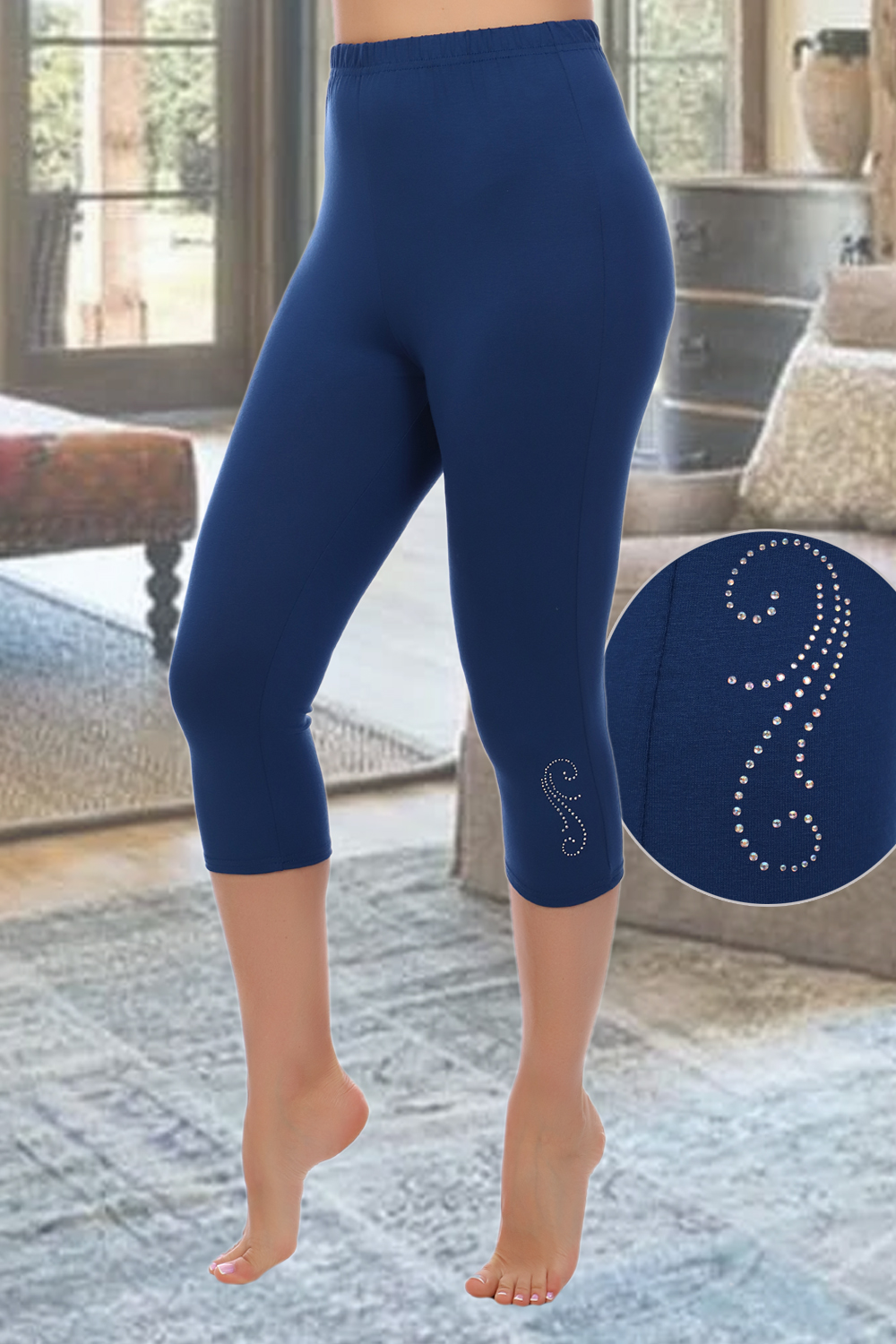Бриджи облегающего силуэта, из вискозы, длина чуть ниже колена, пояс на резинке, удобная высокая посадка. По переду в нижней части декоративный узор из страз, модель изготавливается в трех расцветках.