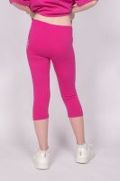 Бриджи для девочки прилегающего силуэта из гладкокрашеного полотна. Пояс цельнокроенный, с эластичной тесьмой внутри, закрепленной в шов. Низ бридж обработан швом в подгибку. На передней половинке бридж принт радужный глиттер.