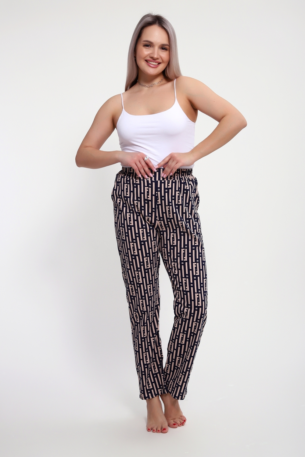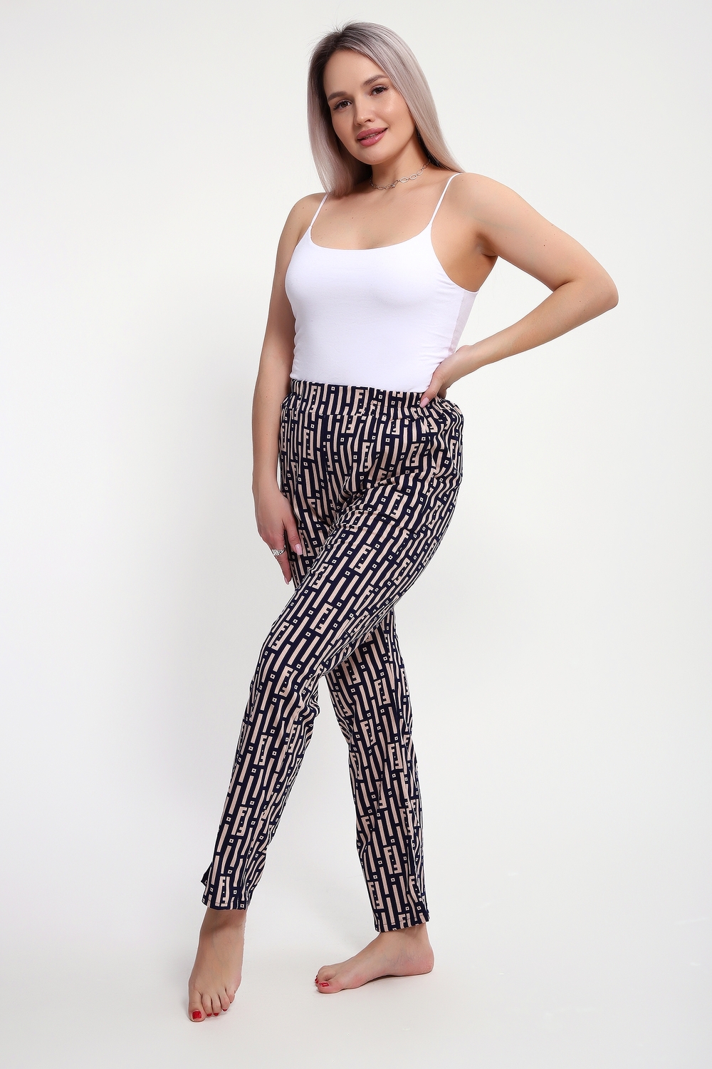Брюки женские выполнены из кулирки 100% хлопок. Брюки имеют комфортную посадку, на поясе с резинкой, с карманами, прямые. Идеально подойдут как для дома, так и для прогулок и отдыха.