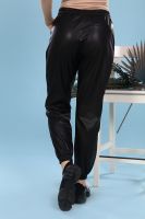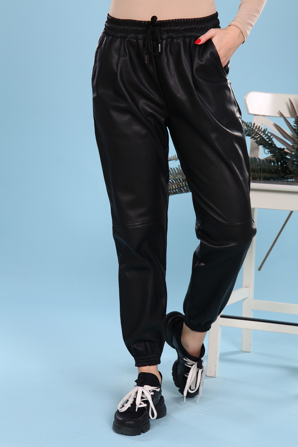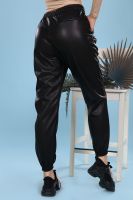 Женские стильные кожаные брюки, низ и пояс на резинке. Два боковых кармана, сзади один карман - обманка.