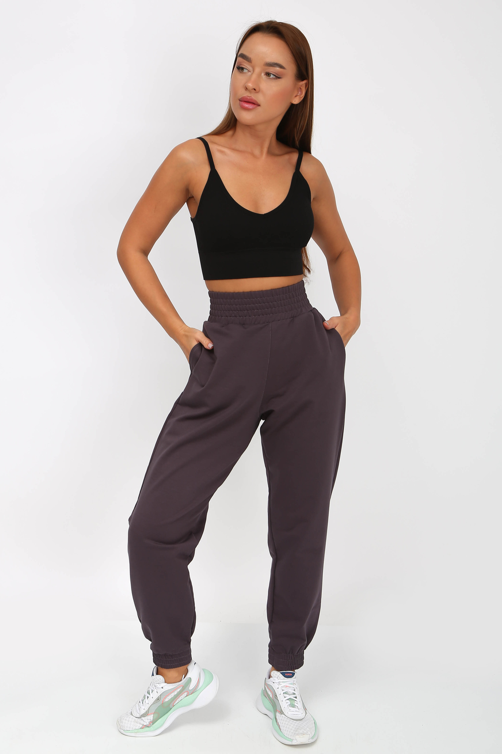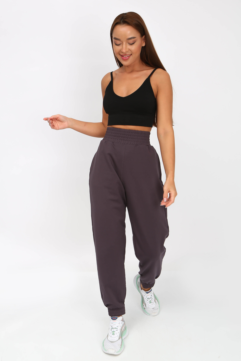 Брюки женские спортивные трикотажные, с высокой посадкой на резинке, по бокам карманы с отрезным бочкам, низ также на резинке. Отличная посадка, хорошо подойдут высоким и невысоким девушкам. Базовая модель подойдет спорта, для дома, для отдыха. Ткань 2-х нитка компакт пенье. Рост модели на фото 160 см, размер 44