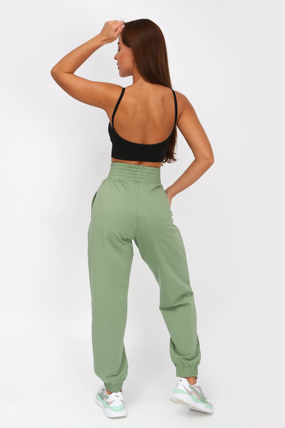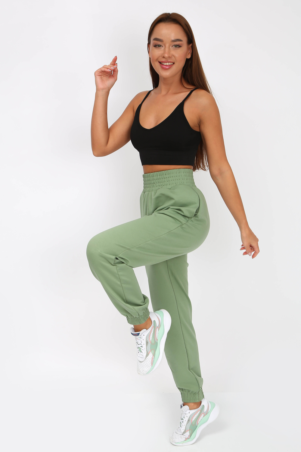 Брюки женские спортивные трикотажные, с высокой посадкой на резинке, по бокам карманы с отрезным бочкам, низ также на резинке. Отличная посадка, хорошо подойдут высоким и невысоким девушкам. Базовая модель подойдет спорта, для дома, для отдыха. Ткань 2-х нитка компакт пенье. Рост модели на фото 160 см, размер 44