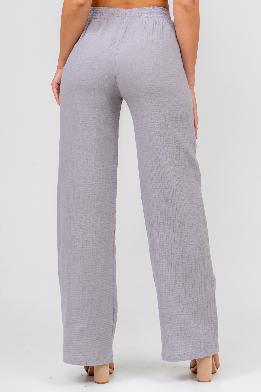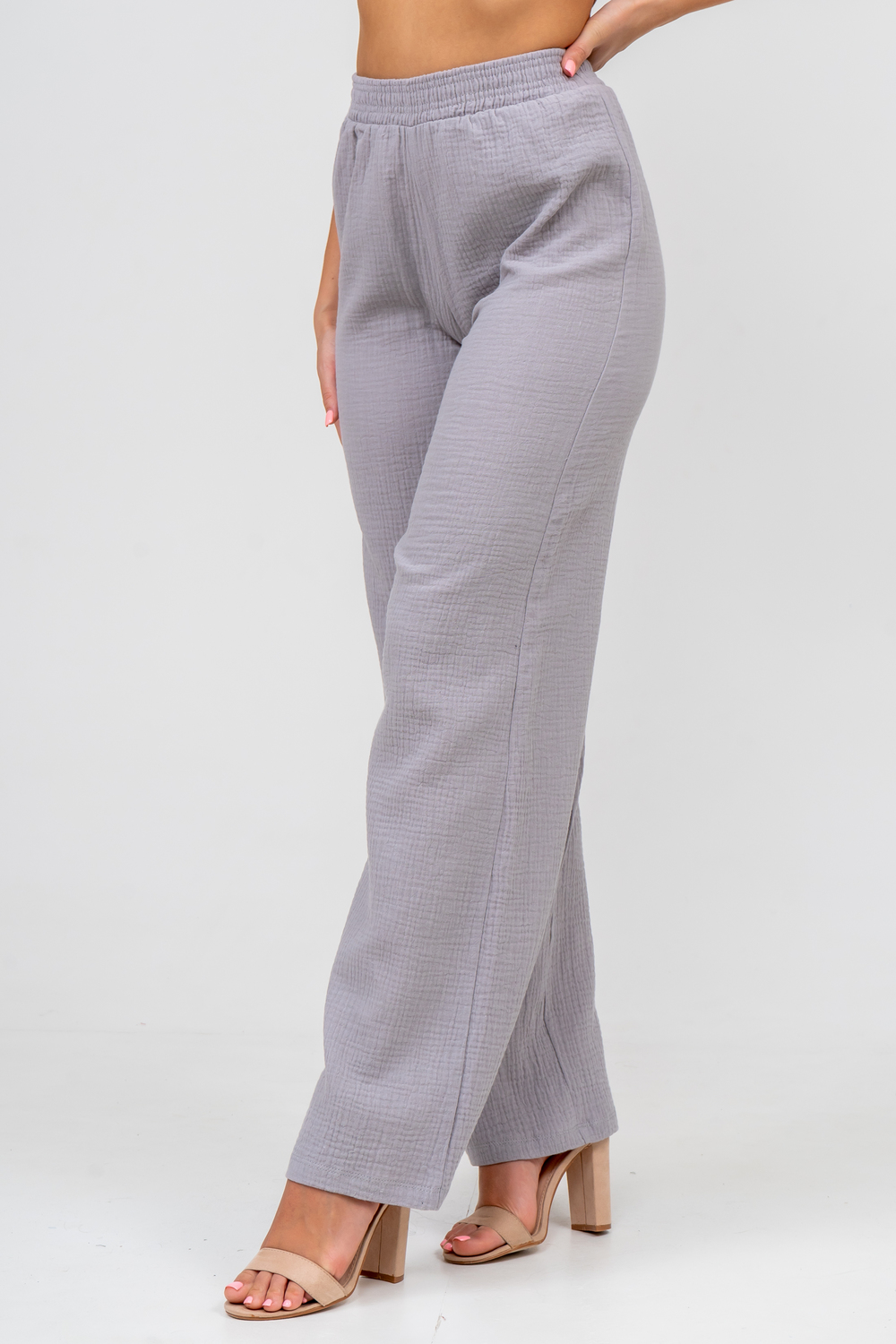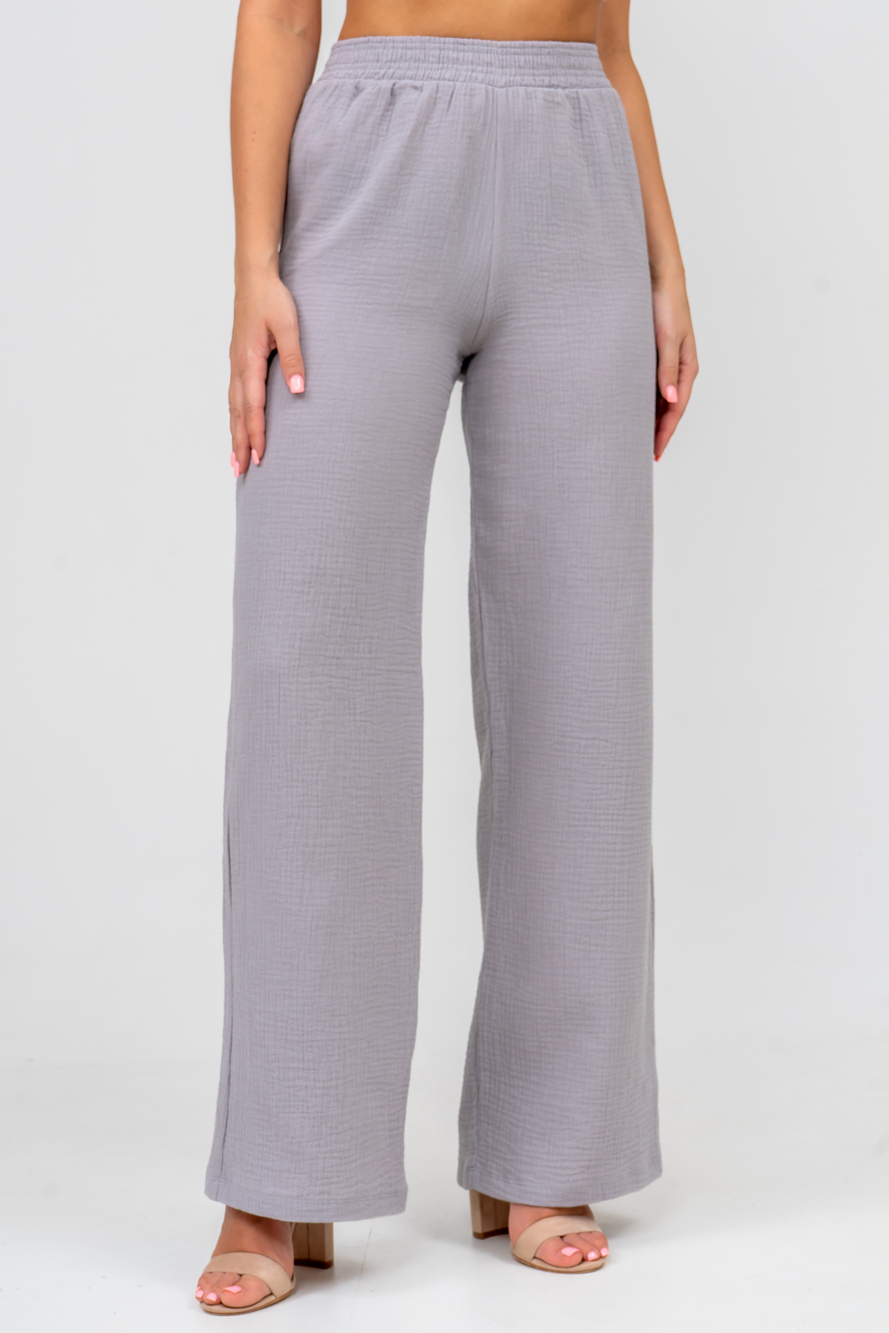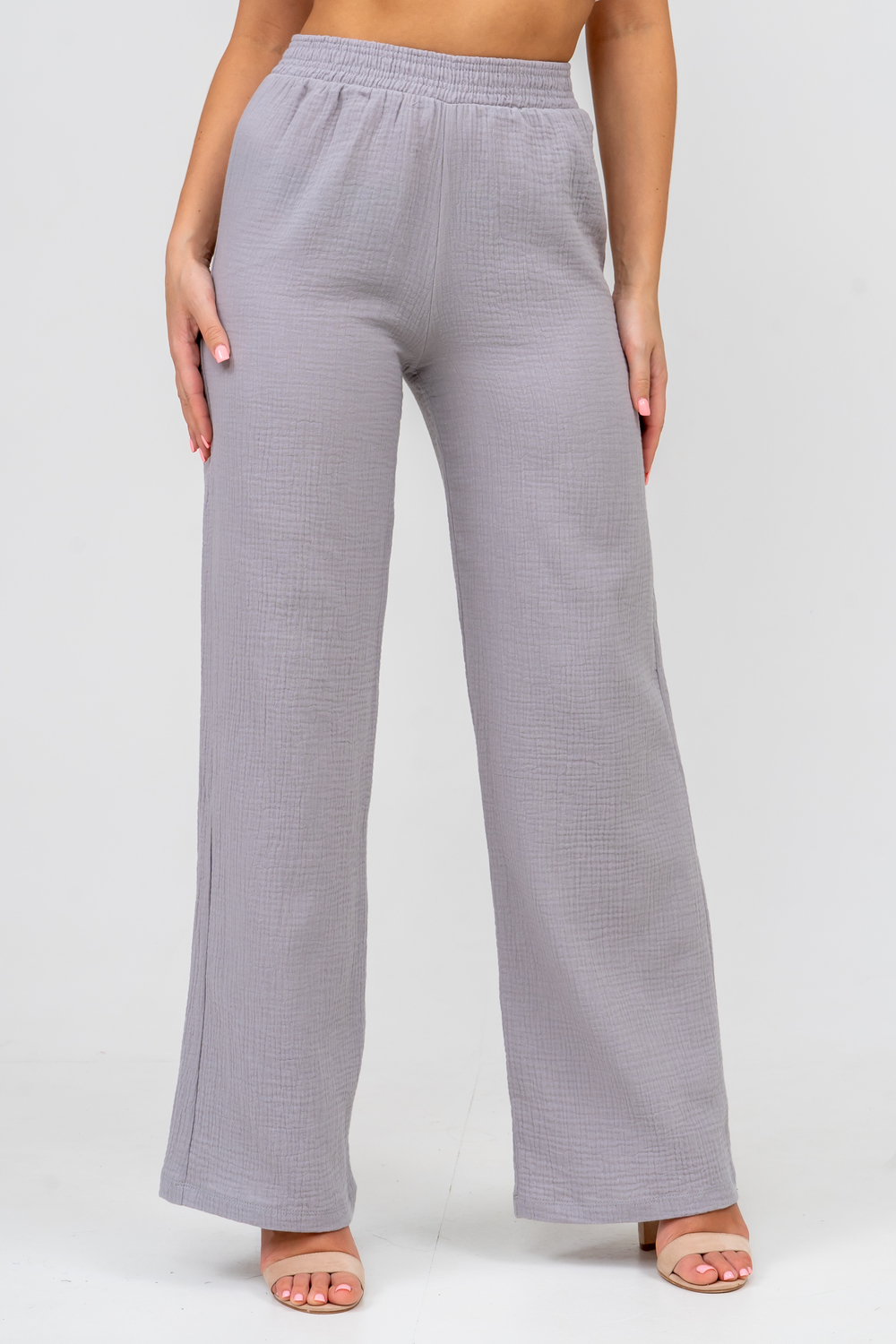 Модные женские брюки - палаццо с завышенной линией талии выполнены из лёгкого струящегося двухслойного муслина. Пояс брюк обработан на специализированной поясной машине. Кажется в новом сезоне с фантастическим муслином познакомился каждый! Воздушный, невесомый, с присущей ему особенной жатой фактурой - это очевидный мастхев летних коллекций, который с успехом переходит в другие сезоны в виде предметов домашнего гардероба. Такая находка и раньше была известна всем, но в этом сезоне тренд с муслином захватил буквально всех. Изделие из такого материала имеет огромное количество плюсов: это 100% хлопок без добавок, брюки из такого материала безупречны для жары, натуральная дышащая структура, лёгкие, практически не ощущаются на теле, и быстро сохнут при намокании. Именно поэтому необычная и фактурная ткань цепляет взгляды окружающих и прекрасно подходит для прогулок, в отпуск, на праздник или для пляжного отдыха. Стирать муслиновые вещи нужно только в тёплой воде при температуре не выше 40° С. Брюки такого плана - это отличный подарок самой себе, и твоё лучшее решение!