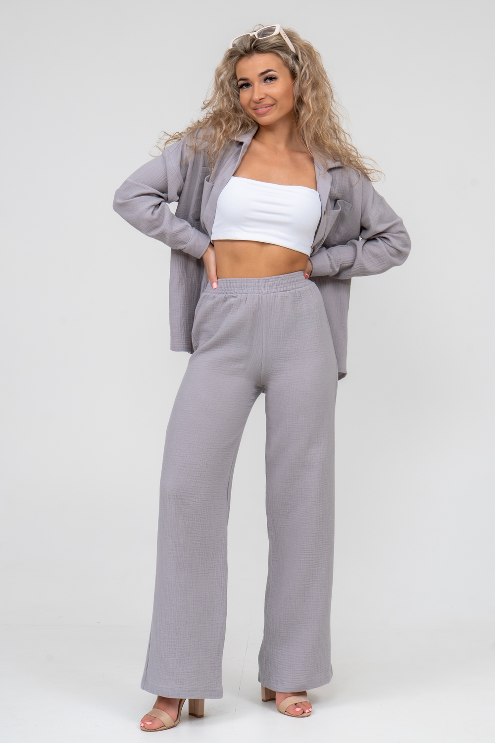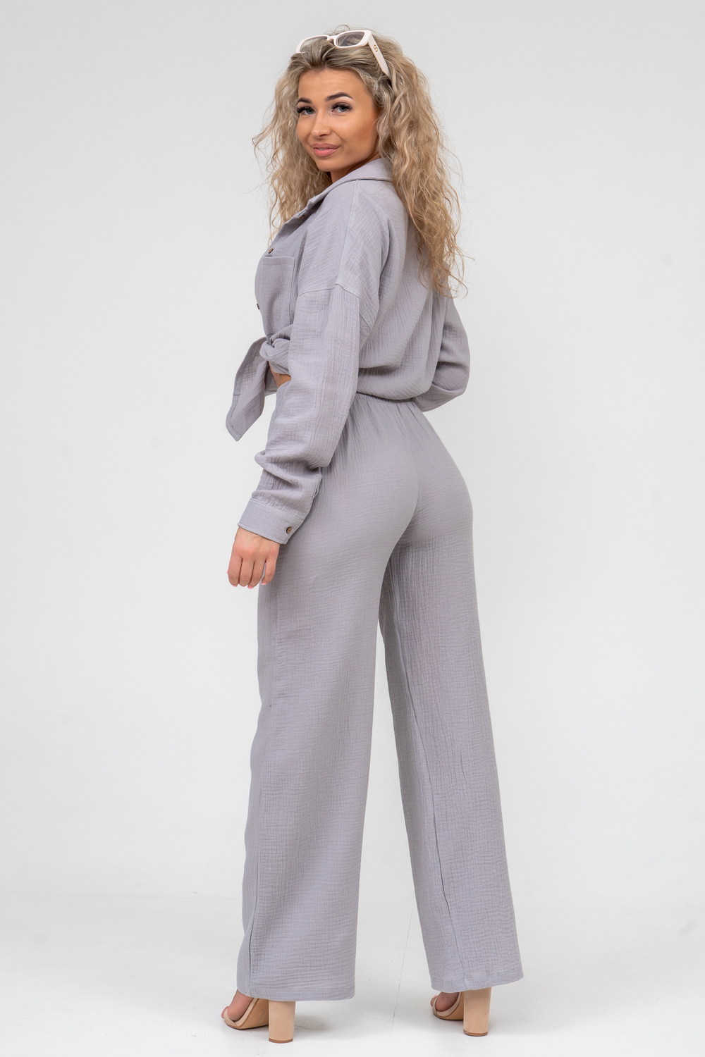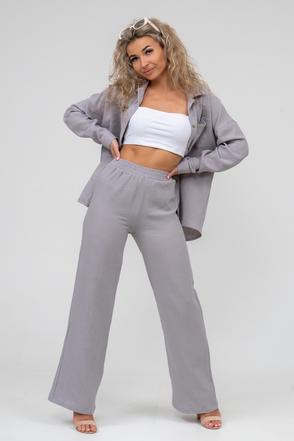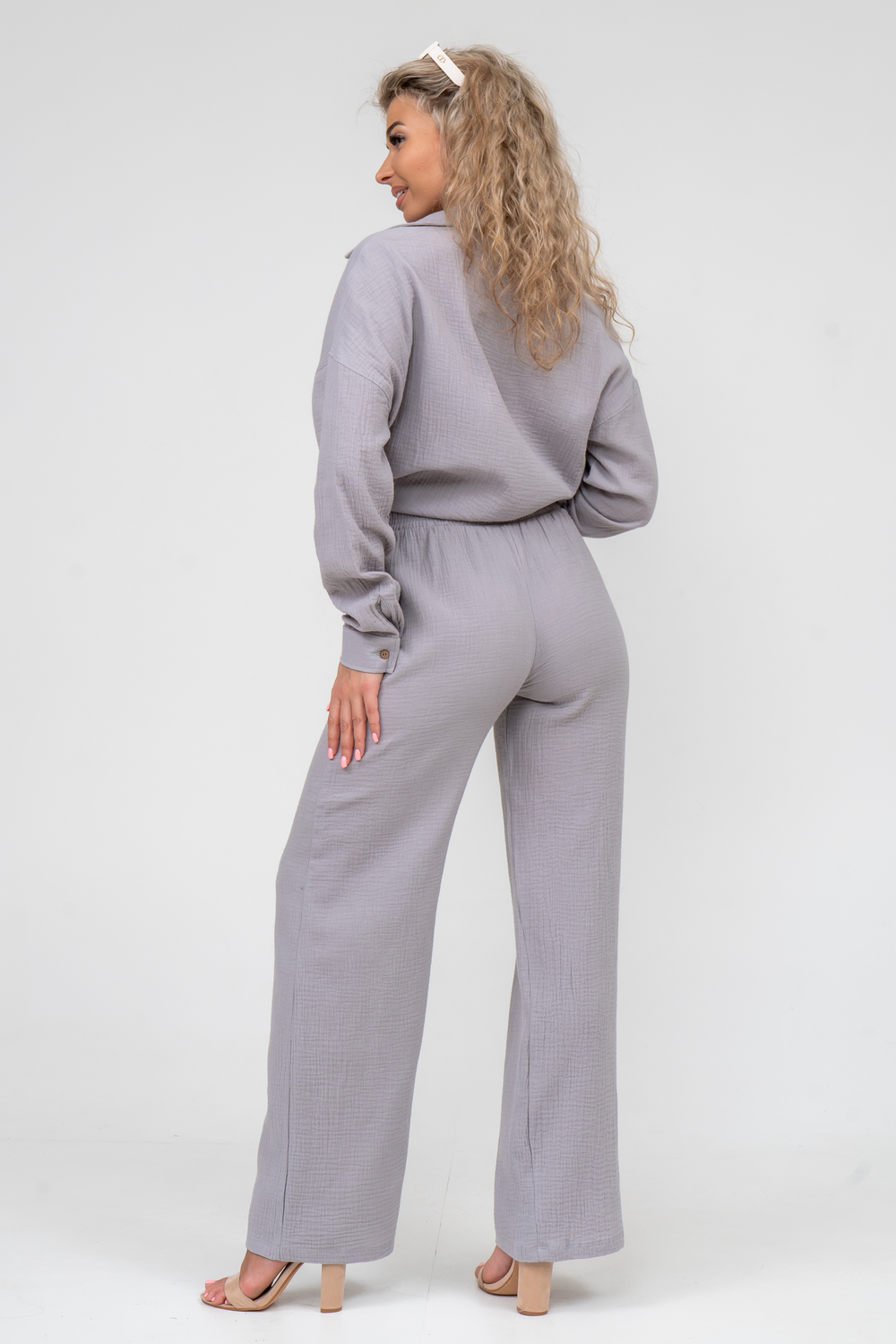 Модные женские брюки - палаццо с завышенной линией талии выполнены из лёгкого струящегося двухслойного муслина. Пояс брюк обработан на специализированной поясной машине. Кажется в новом сезоне с фантастическим муслином познакомился каждый! Воздушный, невесомый, с присущей ему особенной жатой фактурой - это очевидный мастхев летних коллекций, который с успехом переходит в другие сезоны в виде предметов домашнего гардероба. Такая находка и раньше была известна всем, но в этом сезоне тренд с муслином захватил буквально всех. Изделие из такого материала имеет огромное количество плюсов: это 100% хлопок без добавок, брюки из такого материала безупречны для жары, натуральная дышащая структура, лёгкие, практически не ощущаются на теле, и быстро сохнут при намокании. Именно поэтому необычная и фактурная ткань цепляет взгляды окружающих и прекрасно подходит для прогулок, в отпуск, на праздник или для пляжного отдыха. Стирать муслиновые вещи нужно только в тёплой воде при температуре не выше 40° С. Брюки такого плана - это отличный подарок самой себе, и твоё лучшее решение!