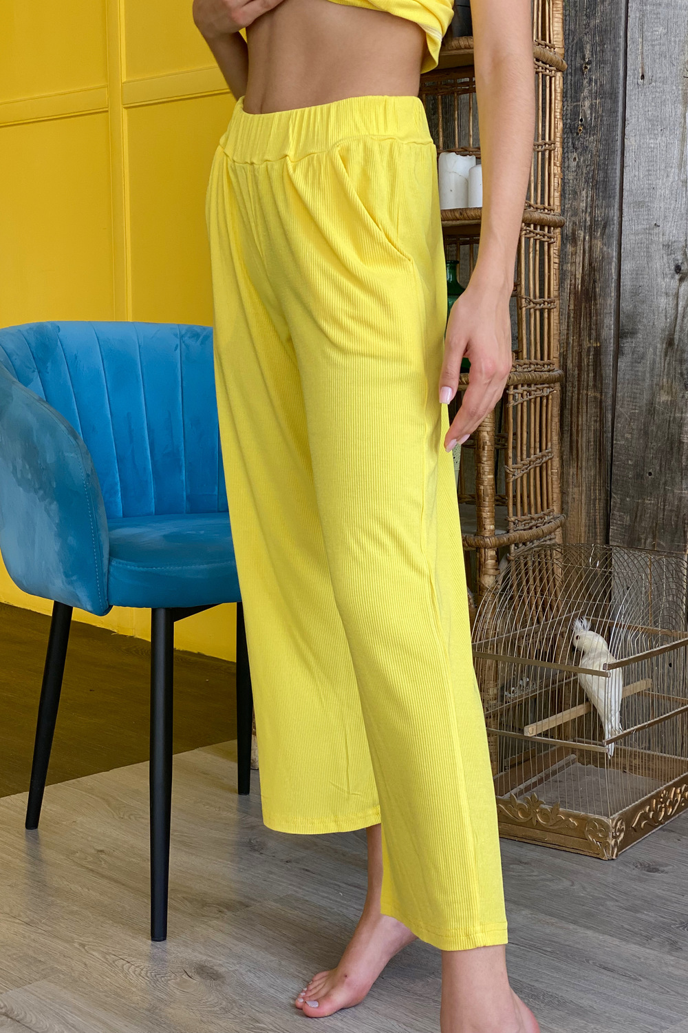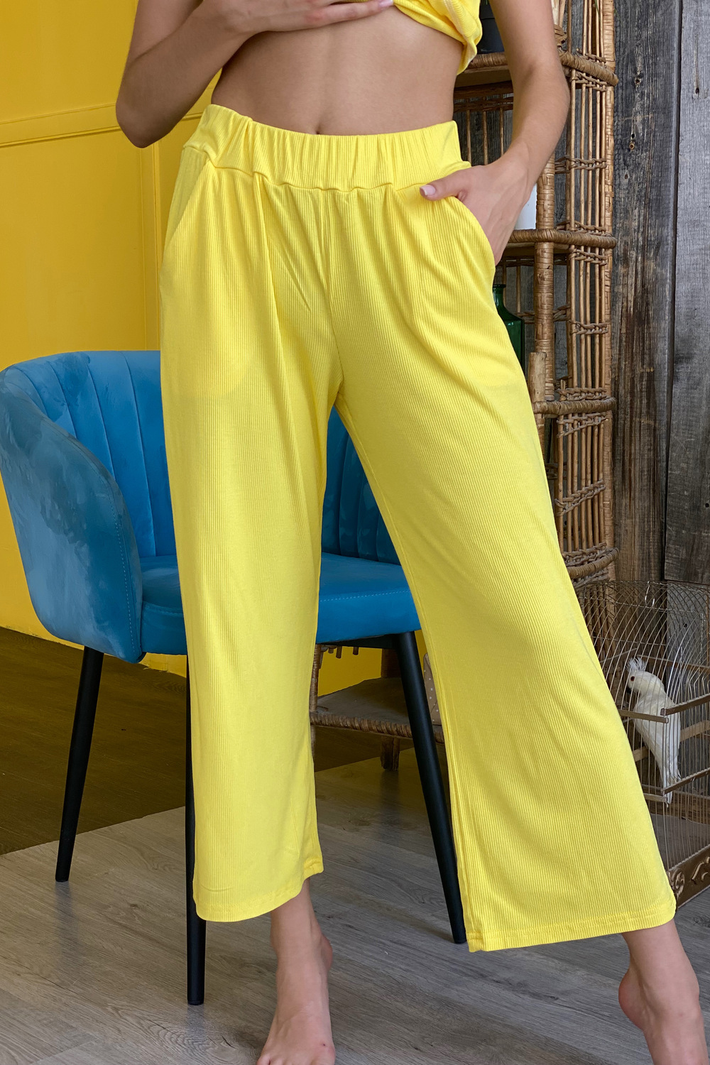 Брюки свободные, прямые, длинной 7/8, с карманами, на поясе.