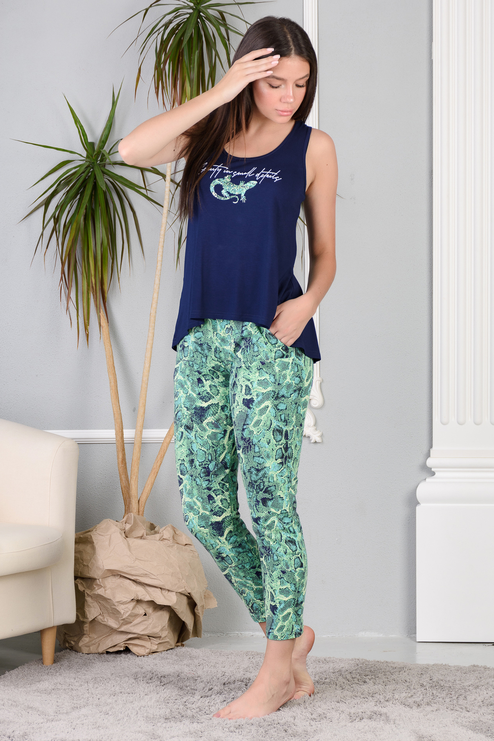 Брюки свободные, длиной 7/8, с карманами, на эластичном поясе.