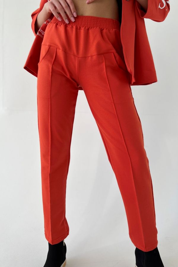 Брюки на поясе, с боковыми карманами, на кокетке. Вдоль передних половинок расположены "стрелки".