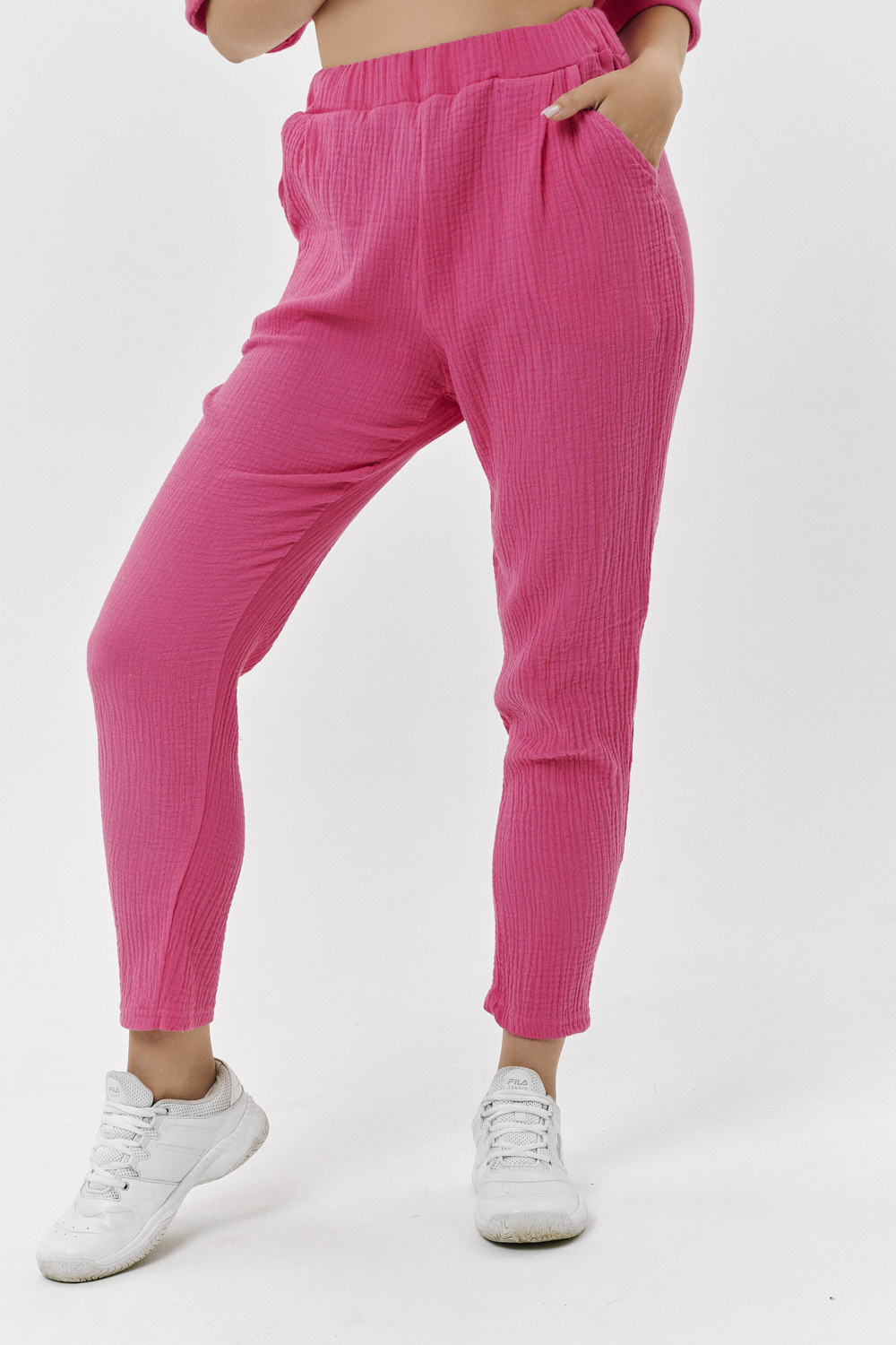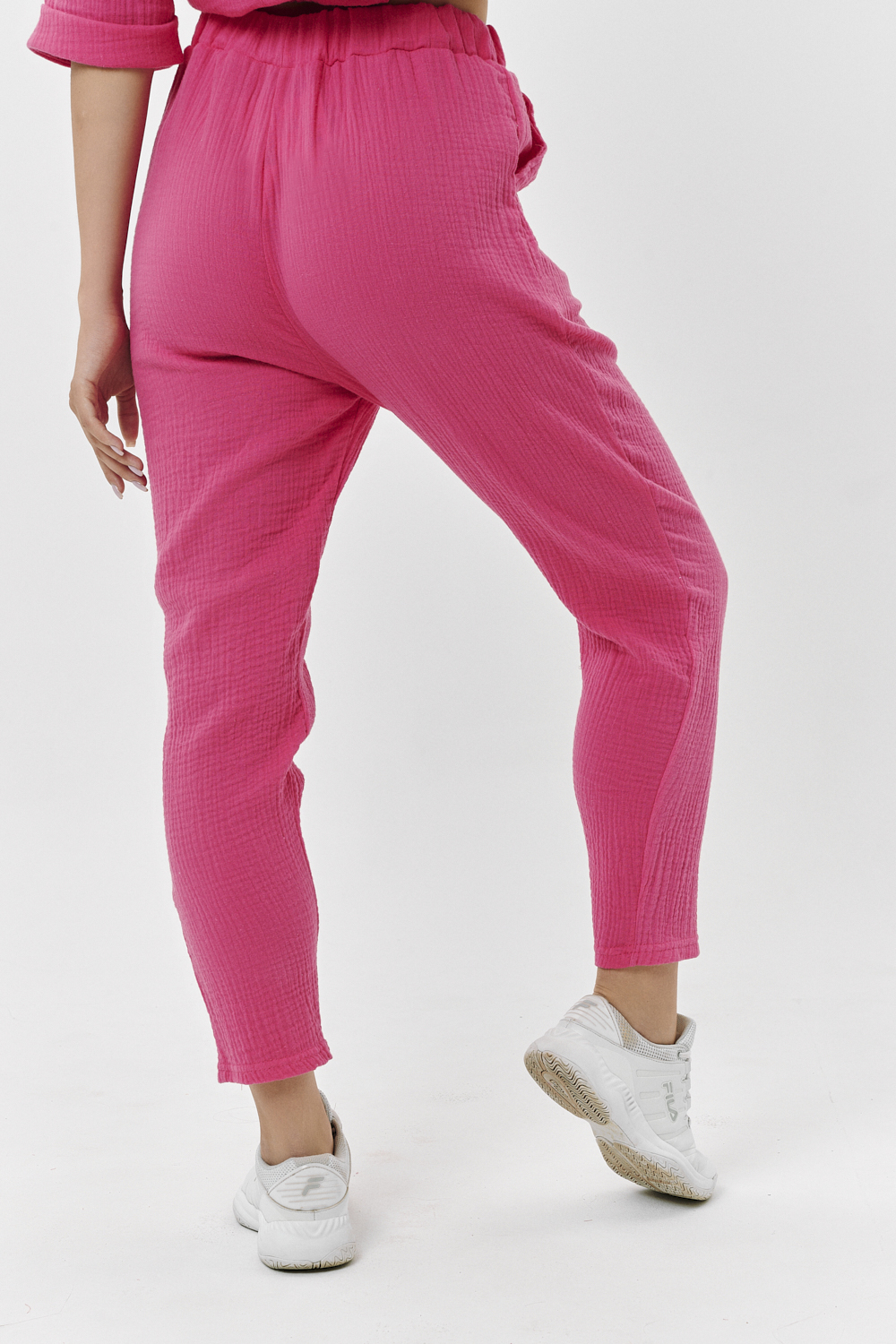 Брюки свободные, на поясе, с боковыми карманами. В верхней части передних половинок по шву притачивания пояса расположены складки.