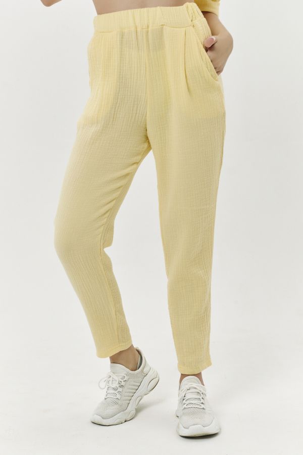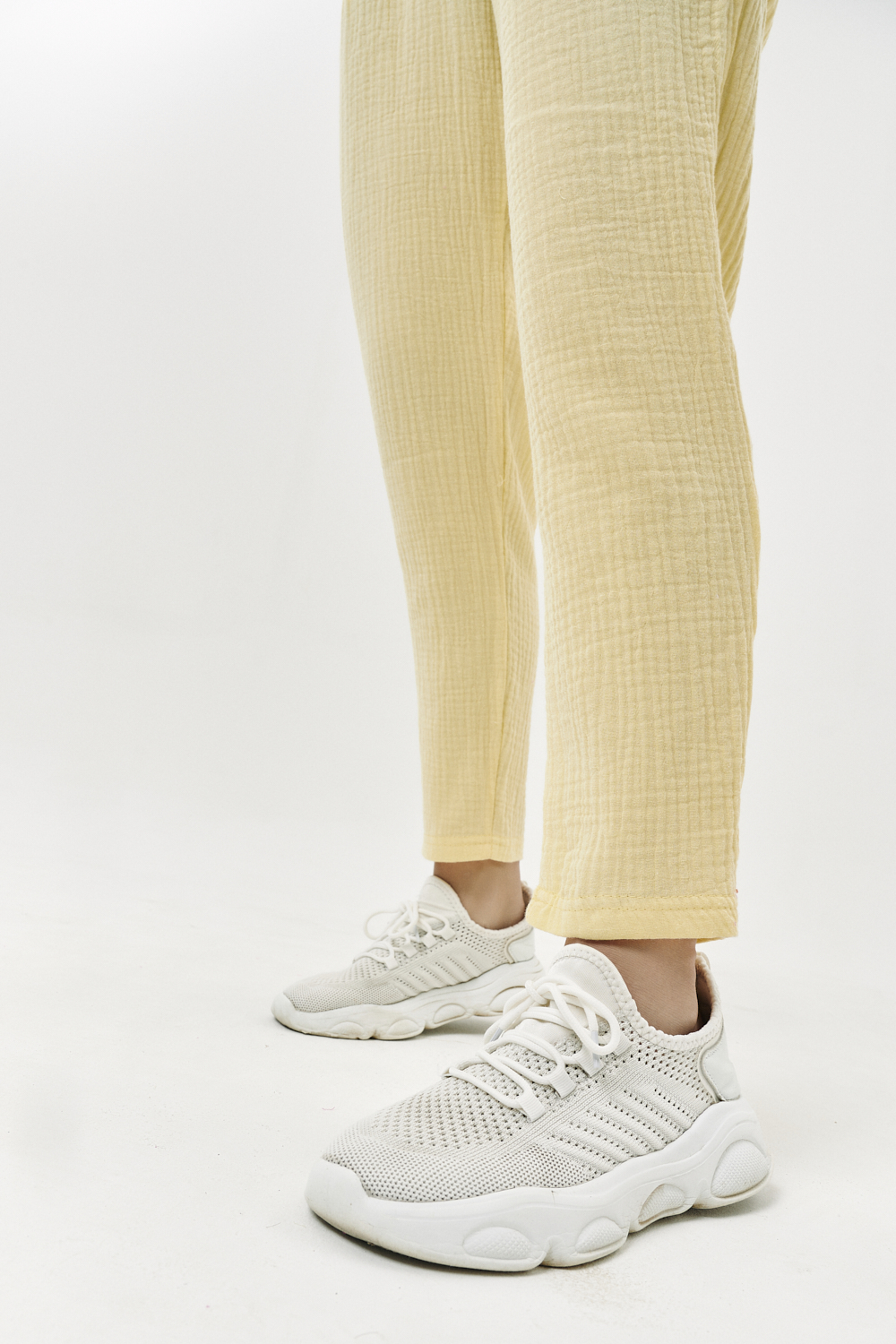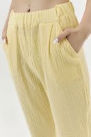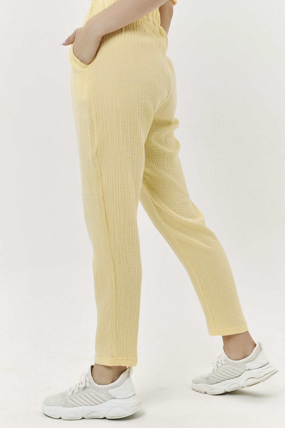 Брюки свободные, на поясе, с боковыми карманами. В верхней части передних половинок по шву притачивания пояса расположены складки.