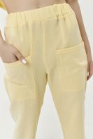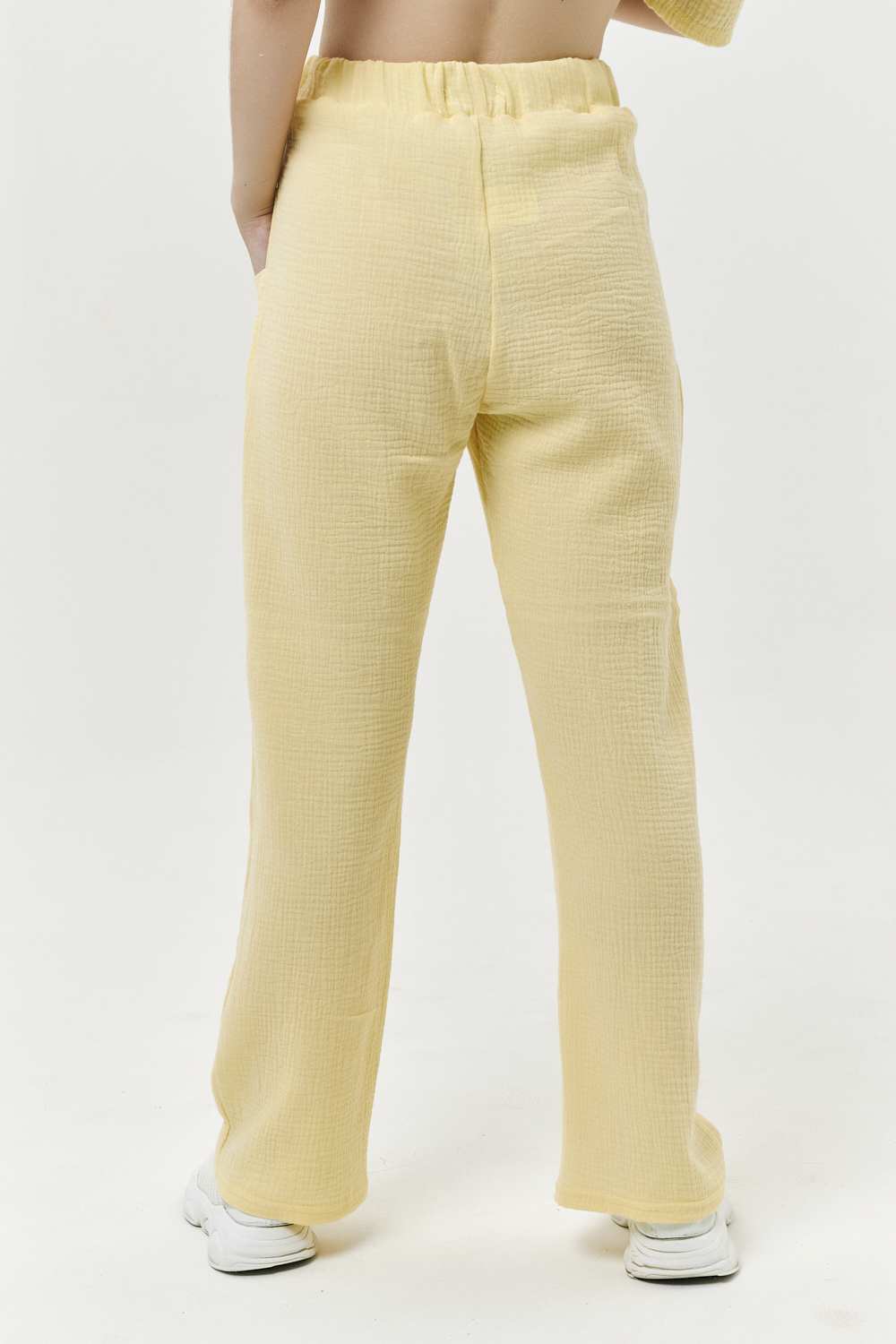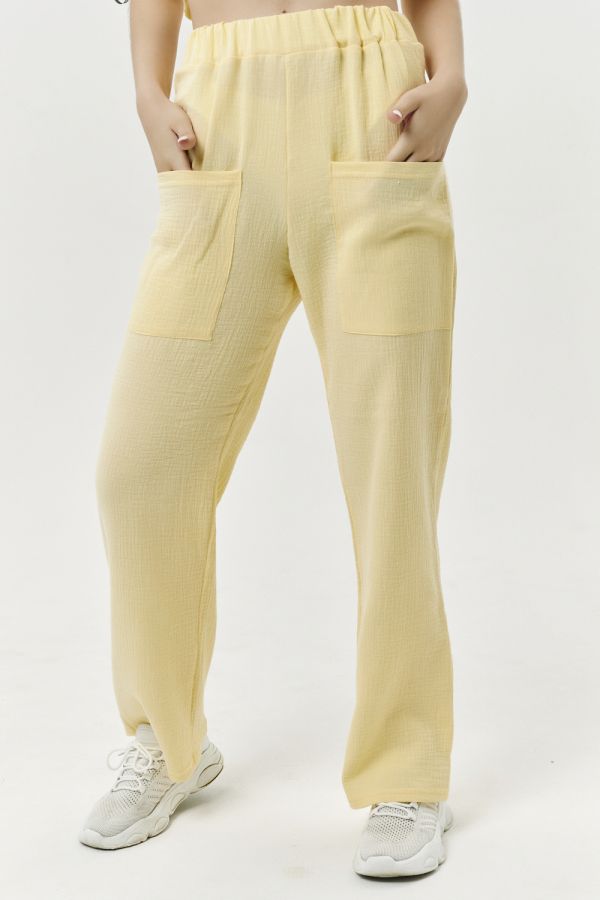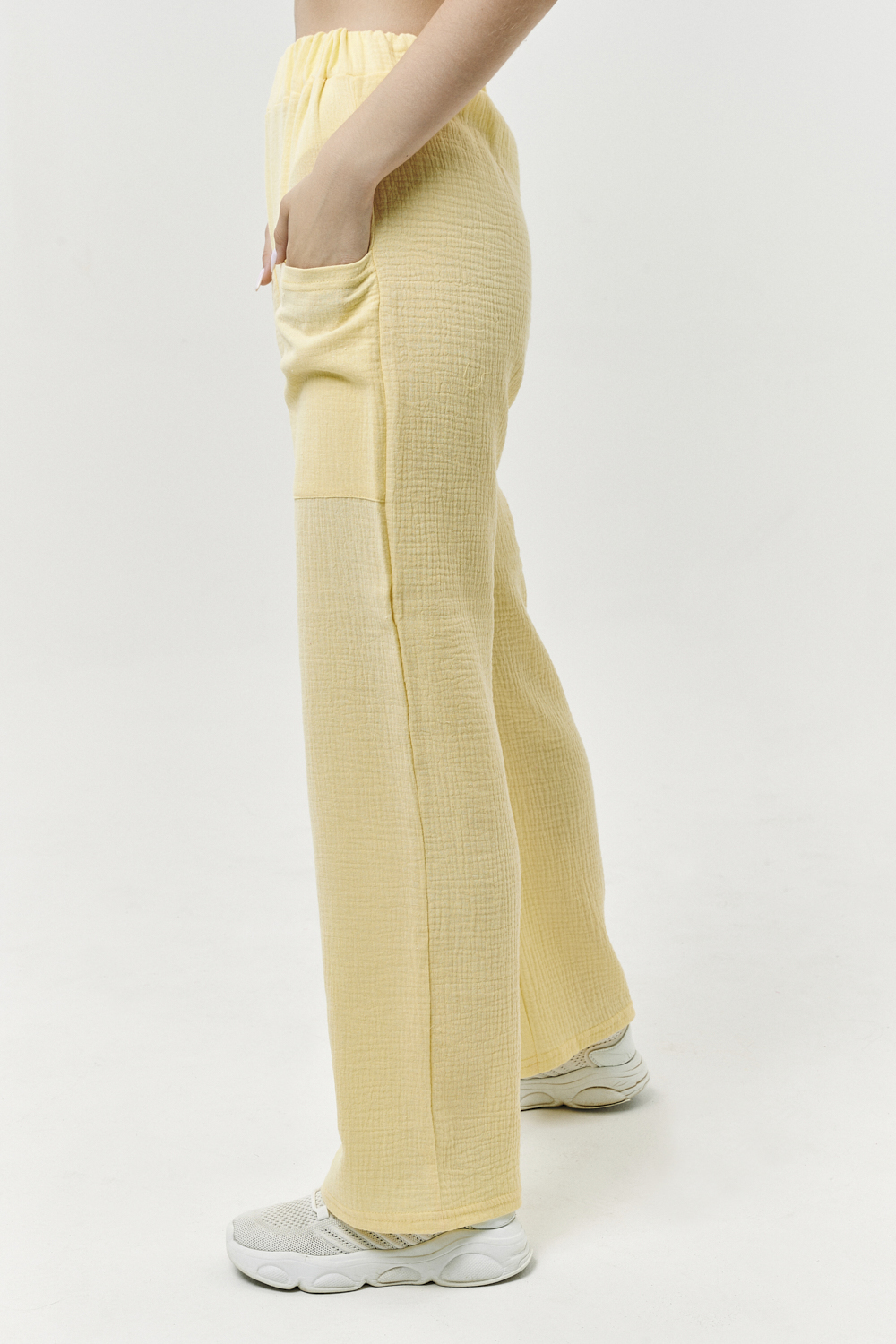 Брюки свободные, прямые, с накладными карманами, на поясе.