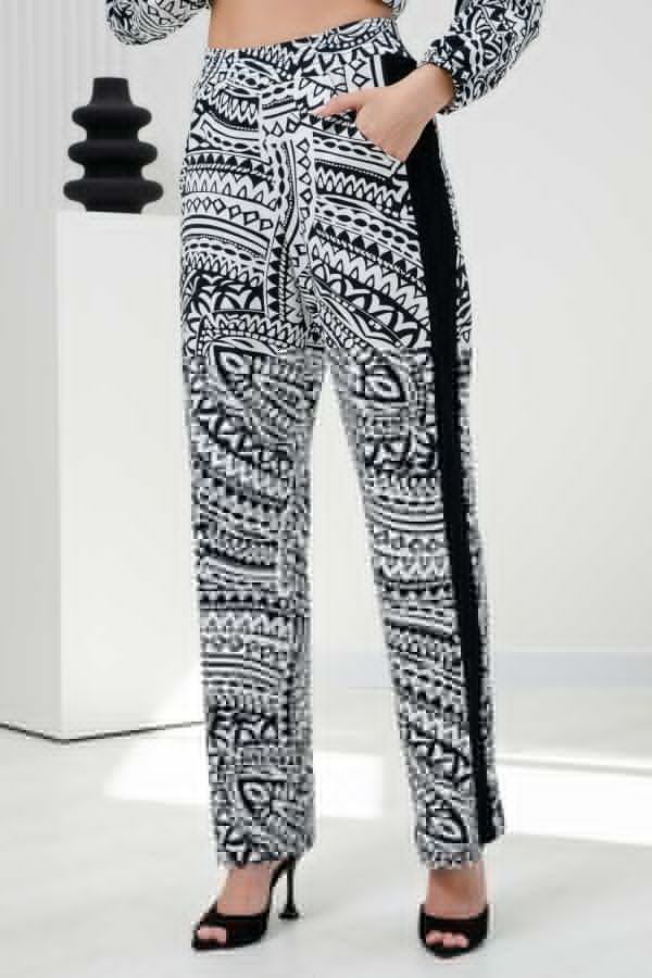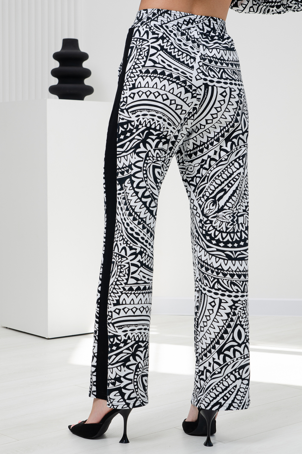 Брюки прямые, на поясе, с боковыми карманами, с лампасами из отделочного полотна вдоль боковых швов.