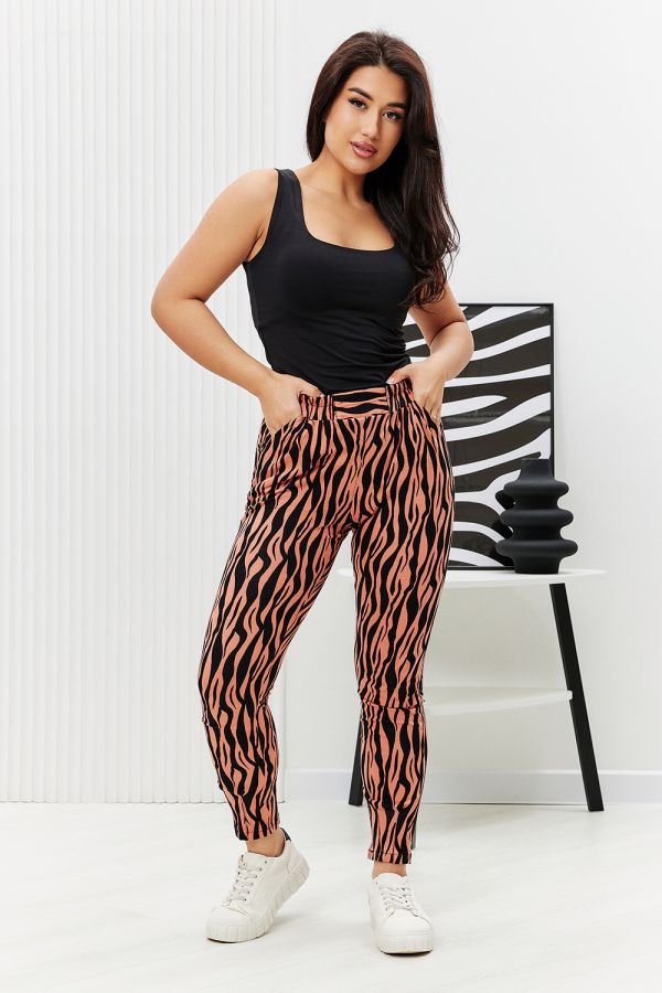 Брюки женские с завышенной талией яркой оригинальной расцветки выполнены из кулирки 100% хлопок. Брюки на широком поясе с резинкой, спереди защипы, по бокам карманы, внизу заужены благодаря защипам. Изделие имеет очень удобную посадку, брюки комфортные в носке, идеально подойдут как для дома, так и для отдыха.