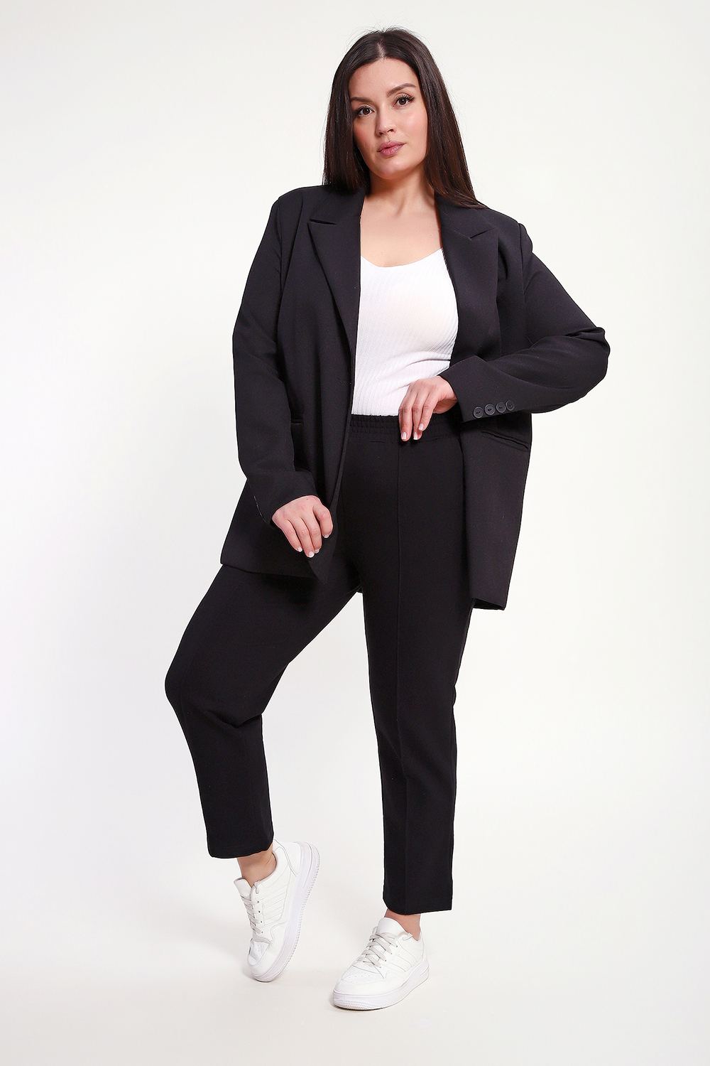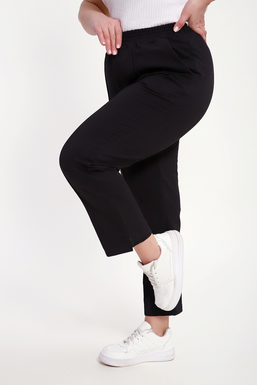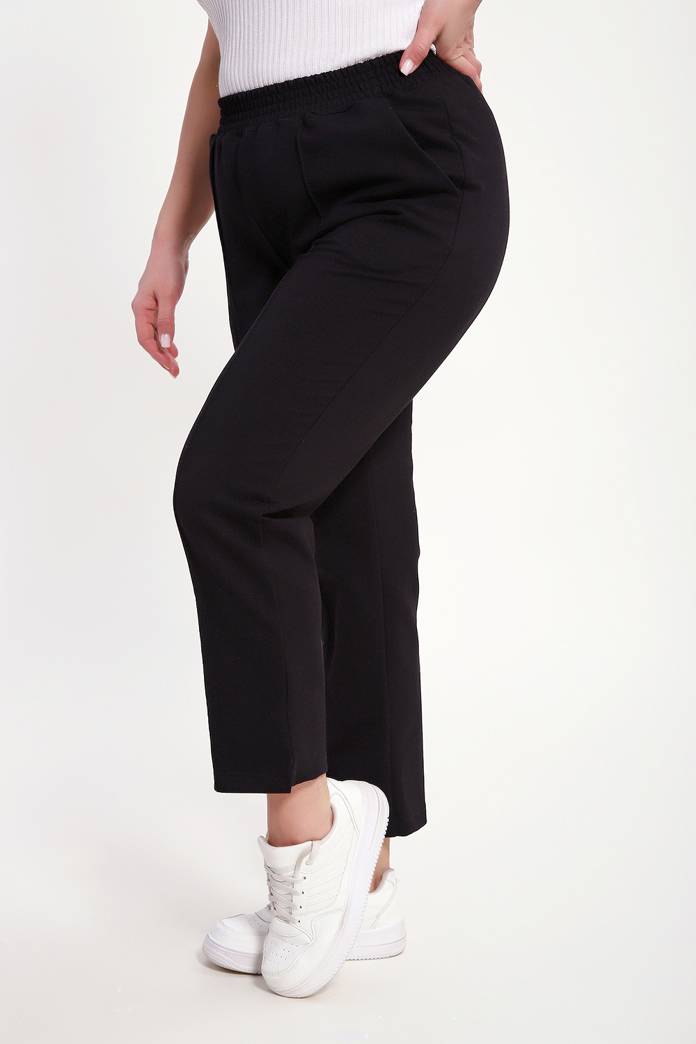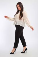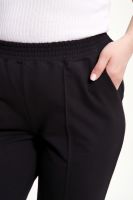 Брюки женские укороченные со стрелками и с карманами. Модель брюк 7/8, внизу по боковому шву маленький разрез, что делает брюки более элегантнее. Пояс брюк обработан на поясной машине, что делает брюки удобными и практичными при носке. Благодаря зауженному к низу крою брюки визуально стройнят фигуру. Прошитые спереди стрелки визуально удлиняют ноги. Брюки выполнены из лёгкого трикотажа на основе хлопка с добавлением эластичных волокон. Мягкая ткань приятна к телу, не сковывает движения и отлично сохраняет форму. Универсальные, классические брюки позволяют создавать множество образов: от повседневного стиля до продуманного офисного.