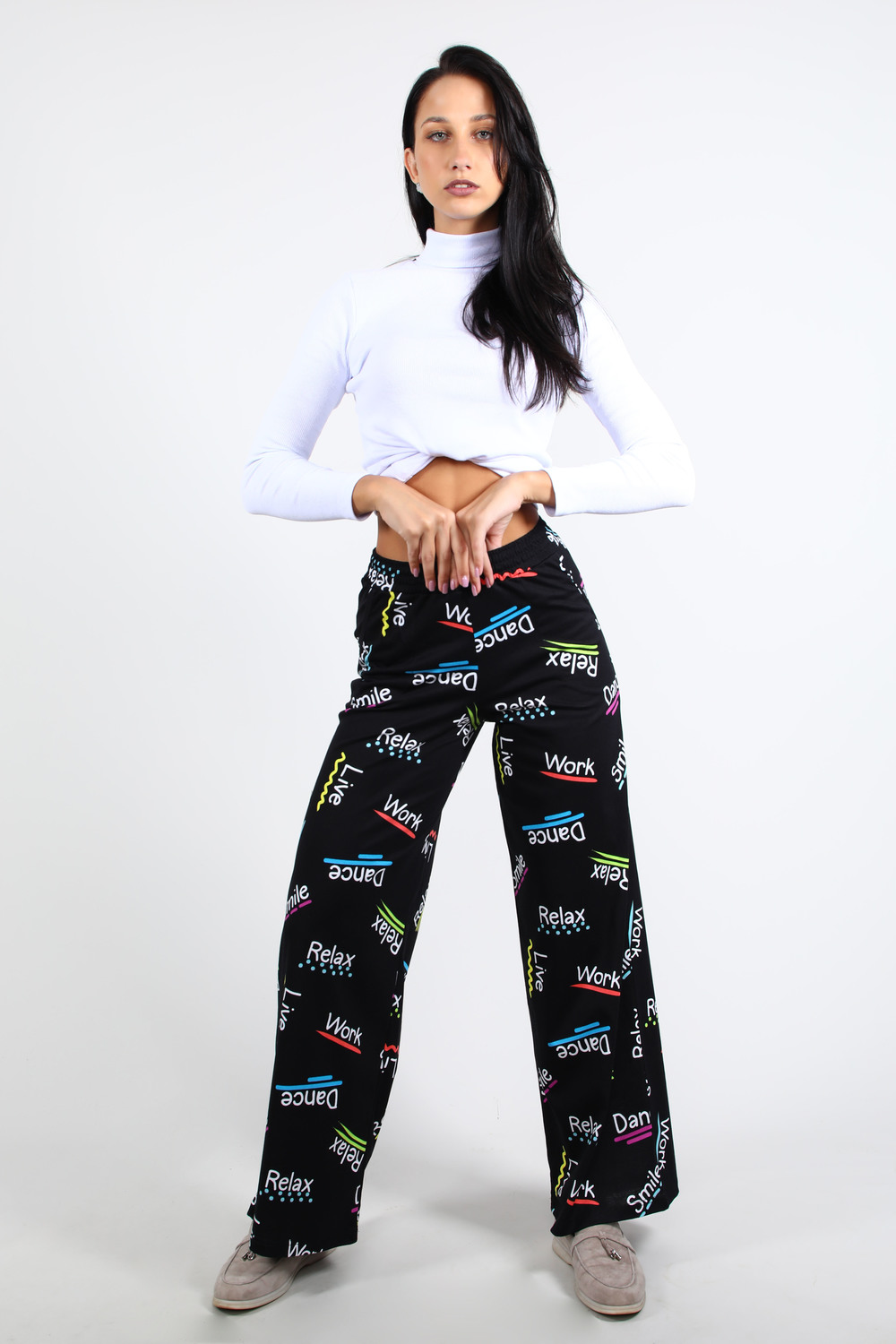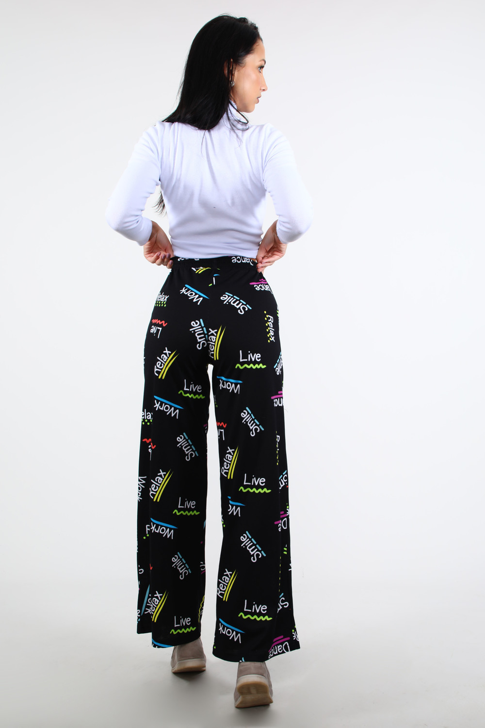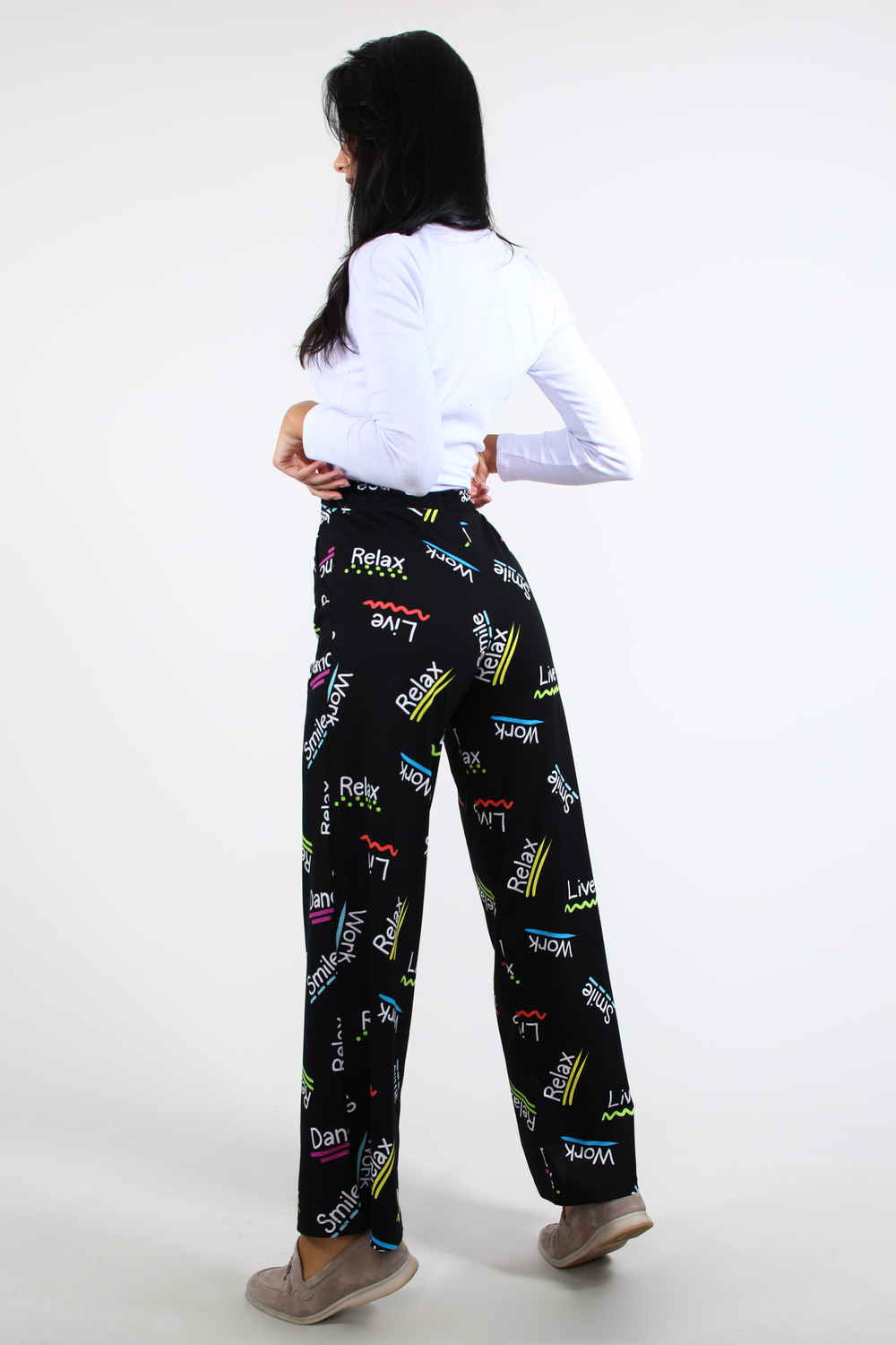 Брюки женские широкие, свободного покроя с поясом 4см. Данная модель выполнена из эластичного трикотажного полотна кулирка. На поясе присутствуют три декоративные строчки. Отлично подходят для прогулок и повседневной носки.