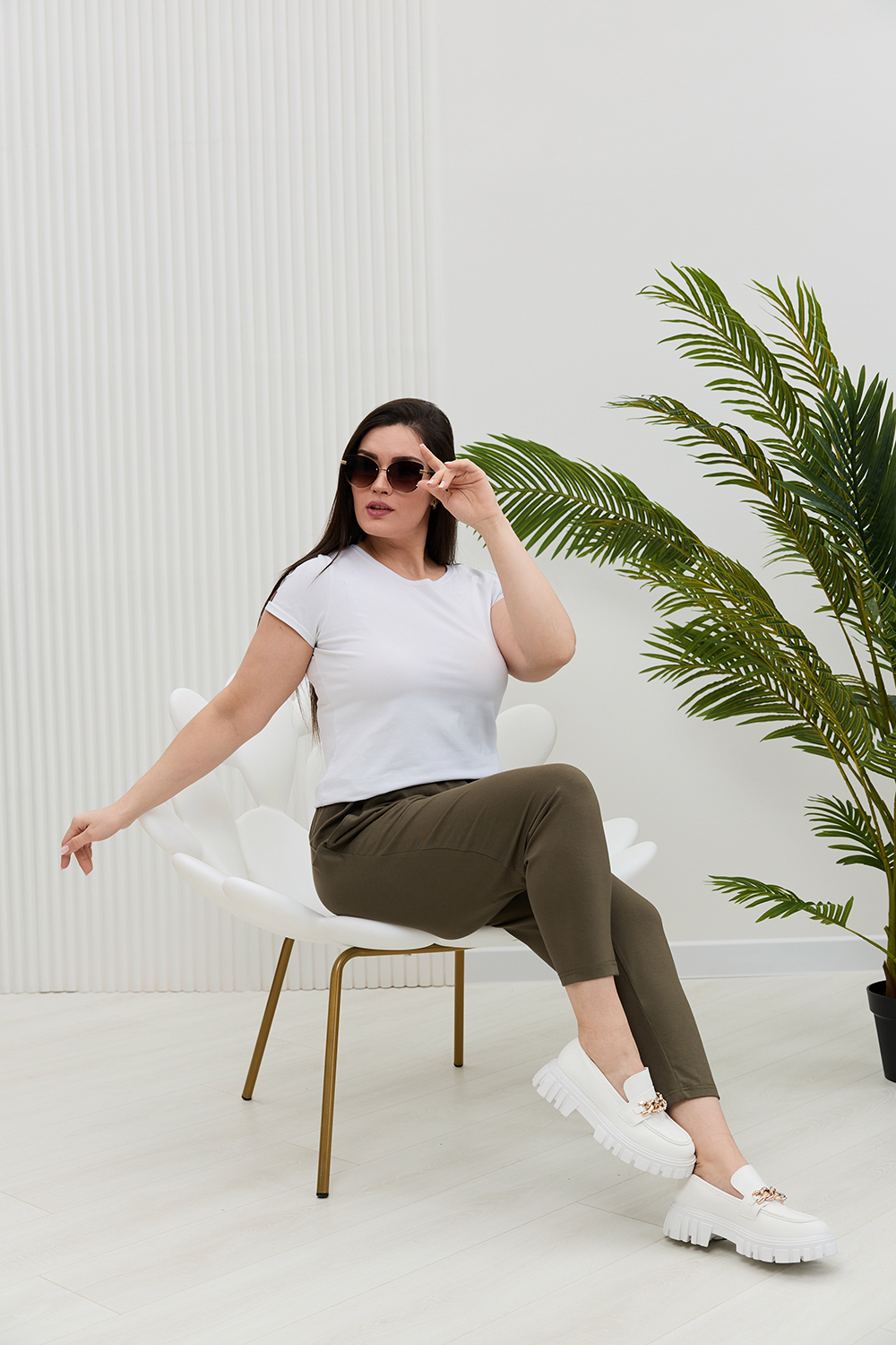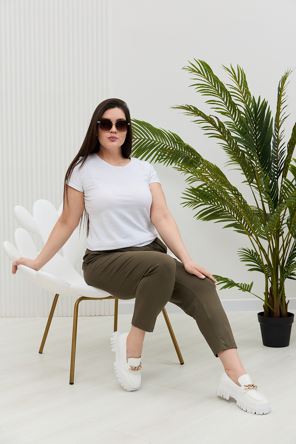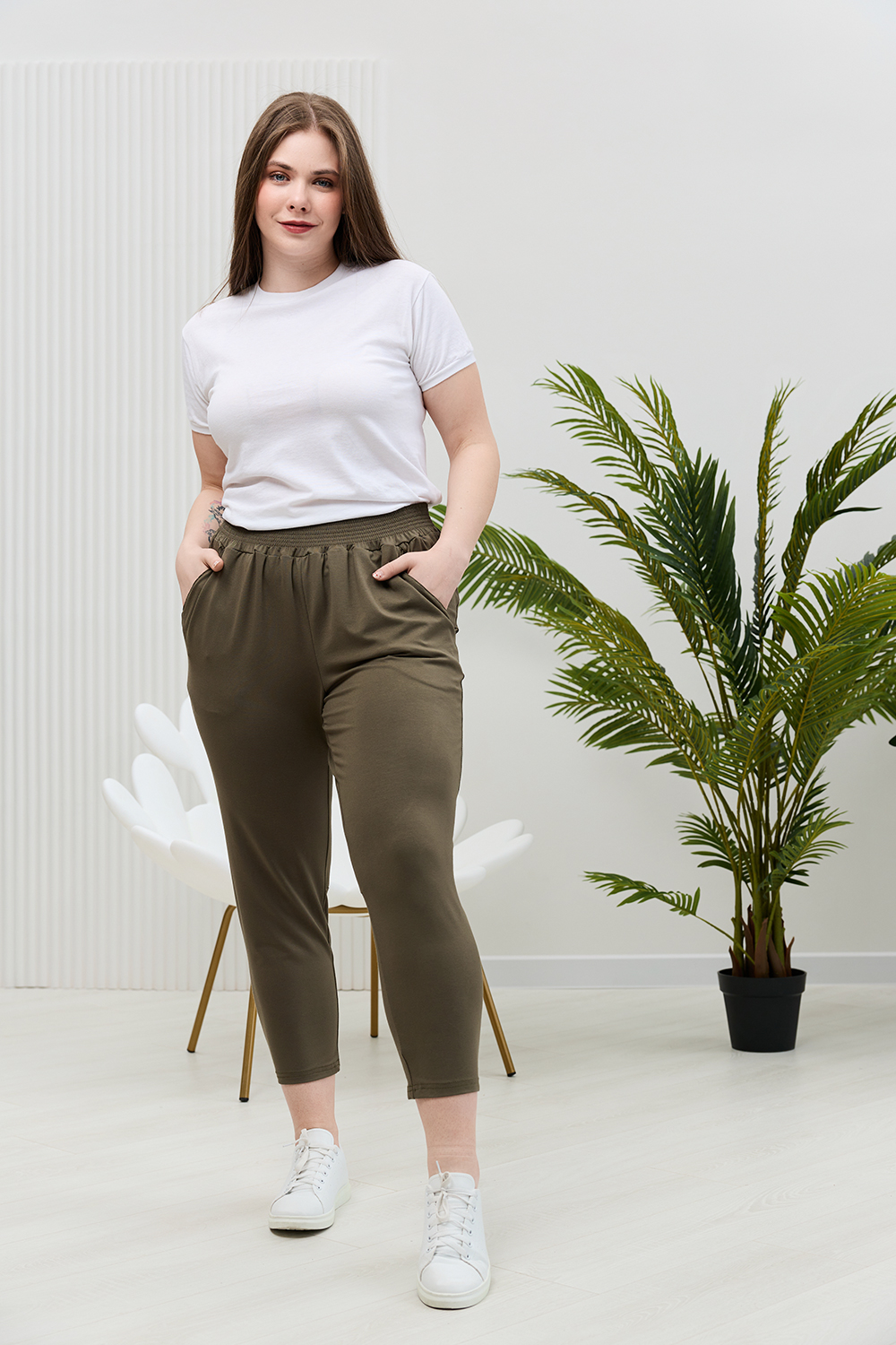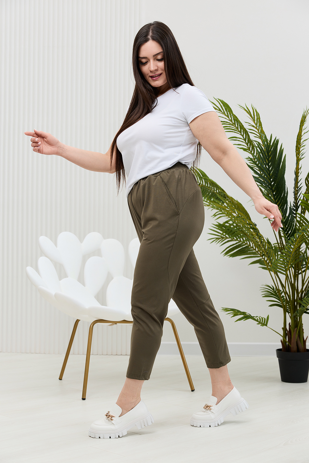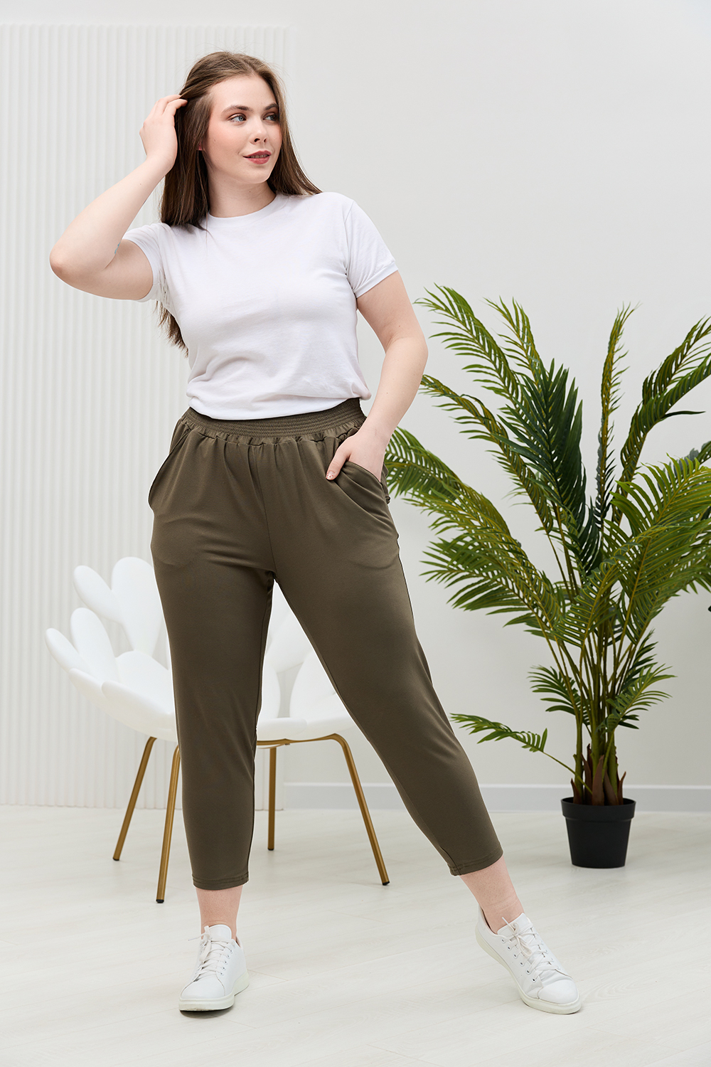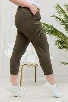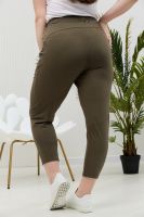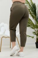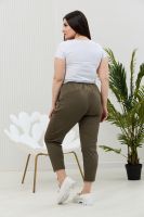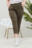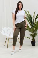 Брюки женские, свободные по бедрам, зауженные к низу. На передних частях брюк внутренние карманы. На задних частях брюк фигурные рельефы, переходящие в боковой шов.