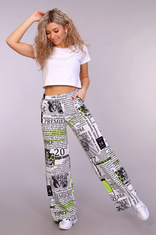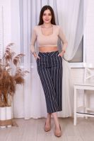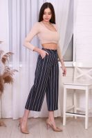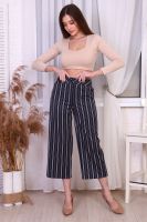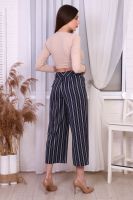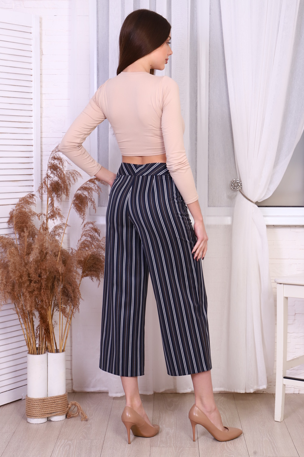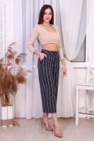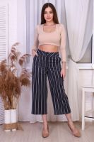 Укороченные брюки с боковыми карманами. Широкий пояс застегивается на пуговицу.