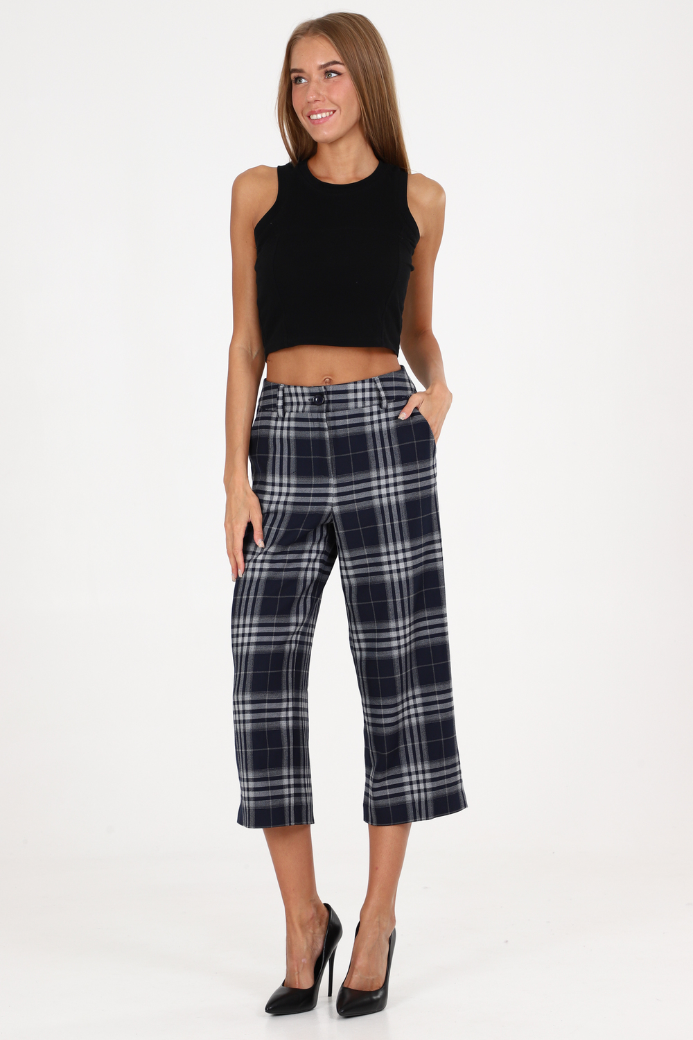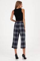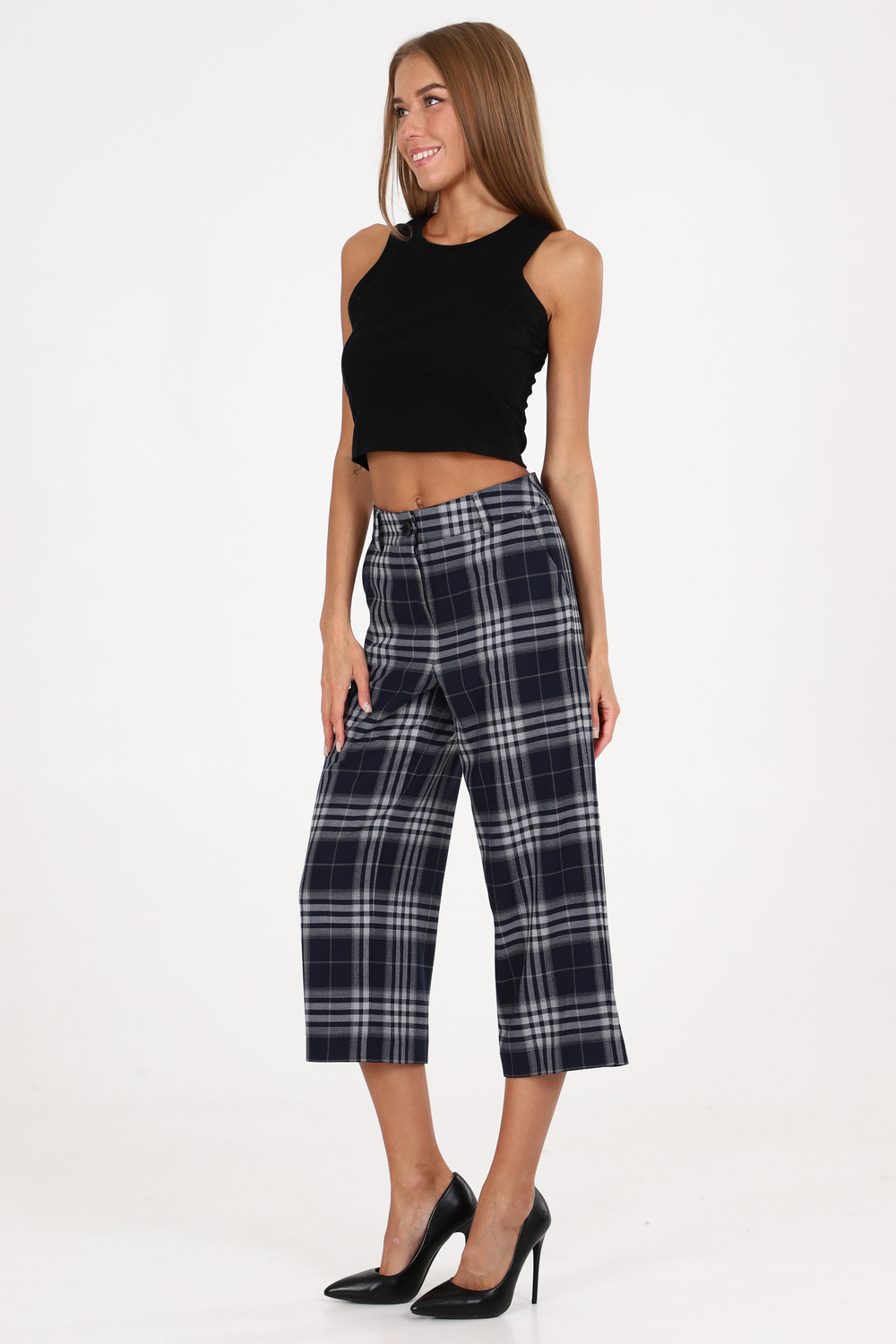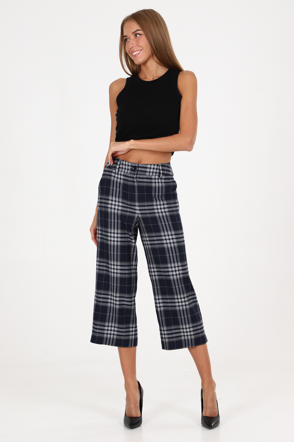 Укороченные брюки с боковыми карманами. Широкий пояс застегивается на пуговицу.